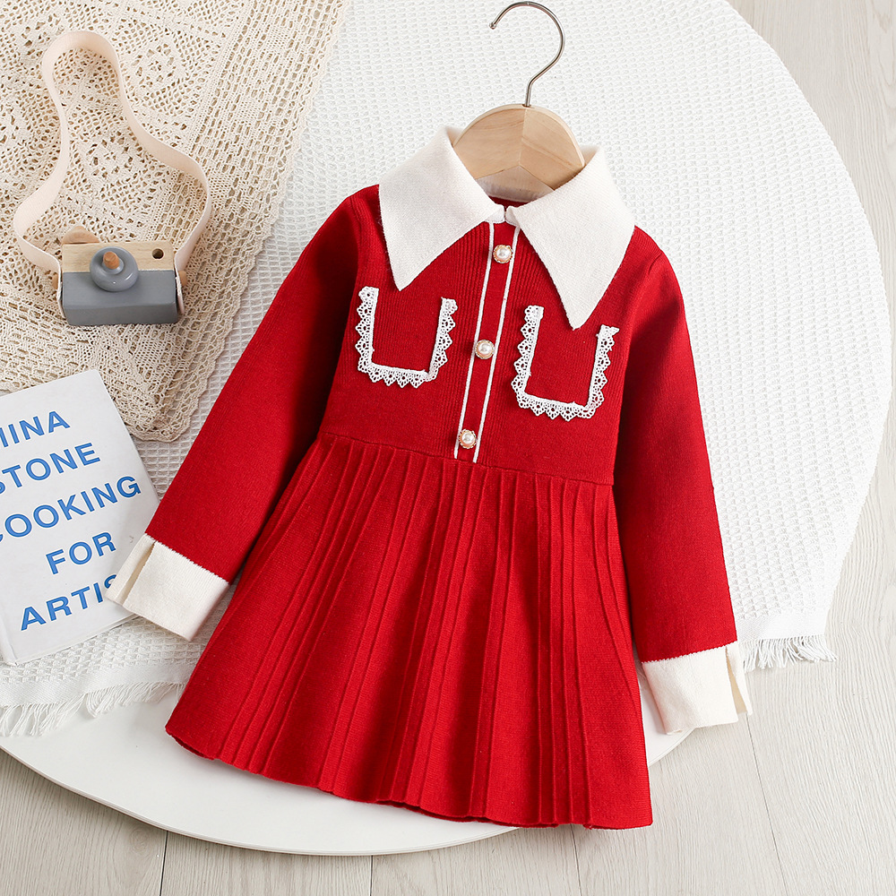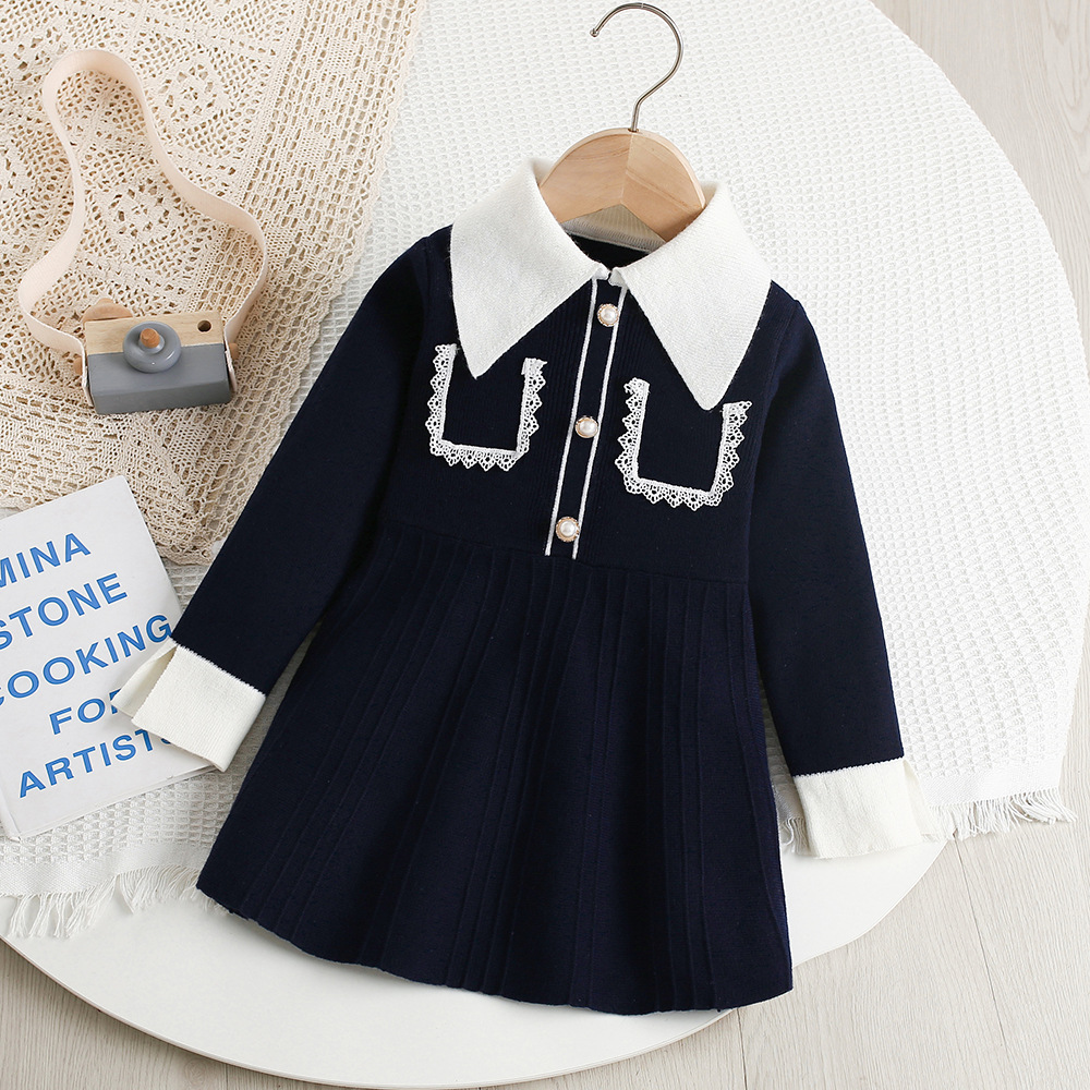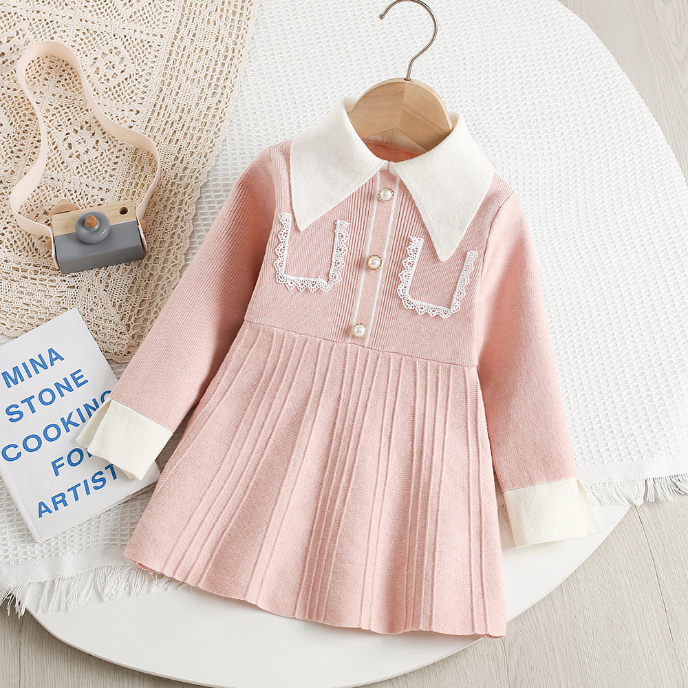 여아 스웨터 봄, 가을 새로운 스타일 긴팔 니트 컬러 블록 드레스 아동 스타일 라펠 공주 드레스 유행