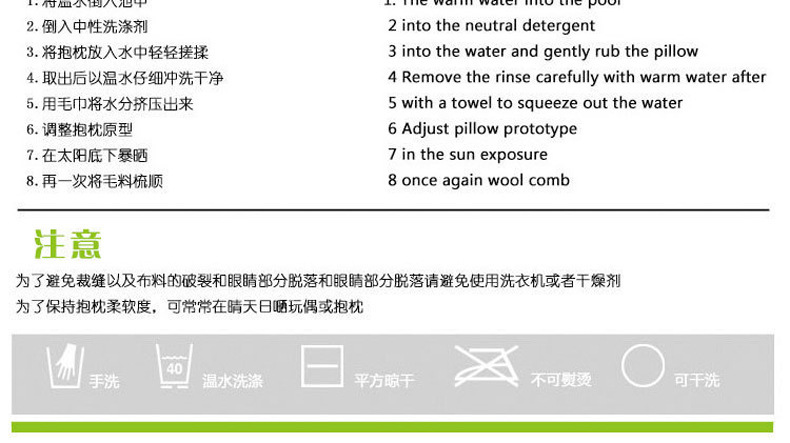 我们所使用的都是专业毛绒抽空仪器来抽空打包,因为毛绒玩具本身体积比较大,只有抽空后运输才能更好的保护好产品,所以当亲收到产品的时候比描述的稍微偏小或者有点褶皱,请亲不要惊讶,因为这是正常现象,打开后抖几下,在太阳底下暴晒半个小时,立刻恢复!