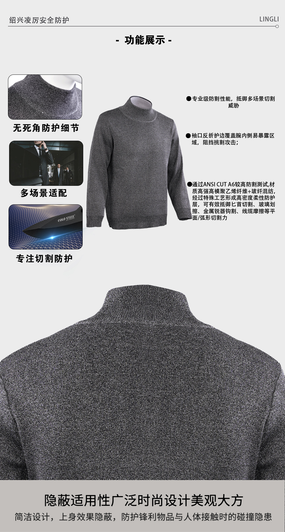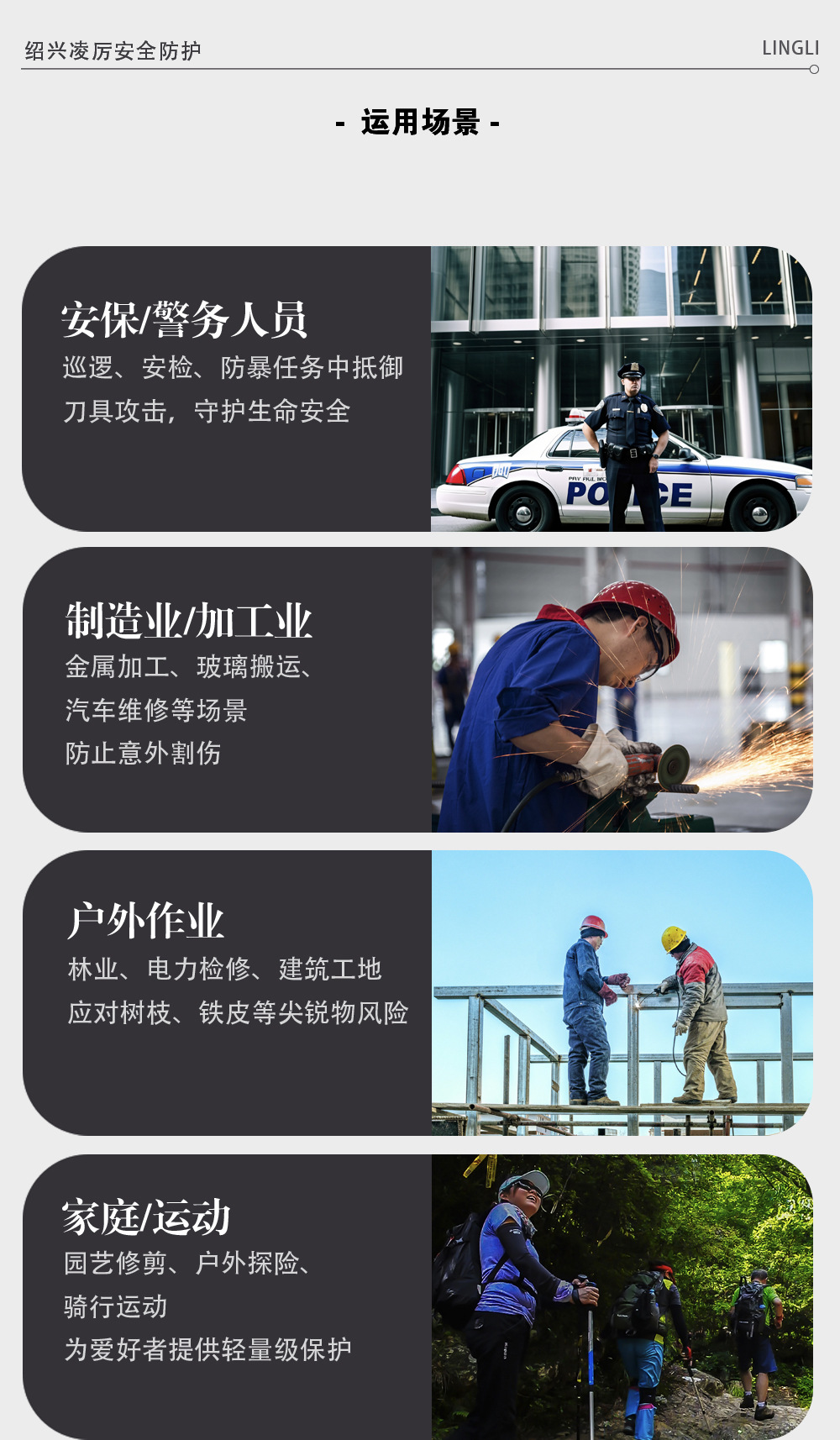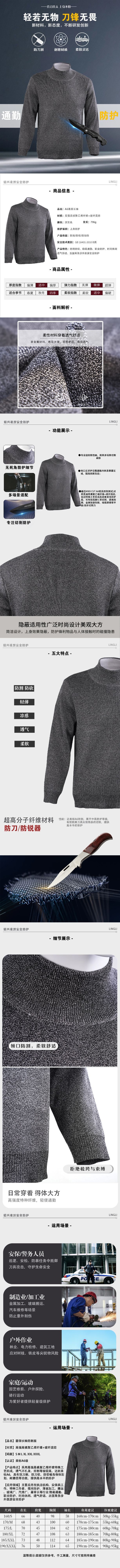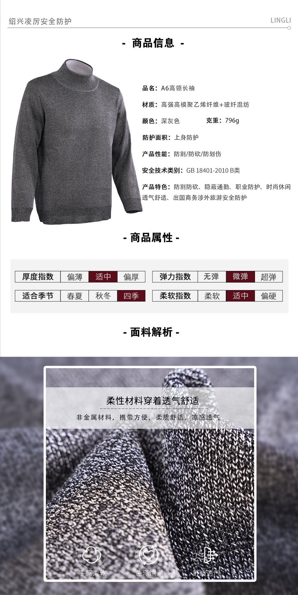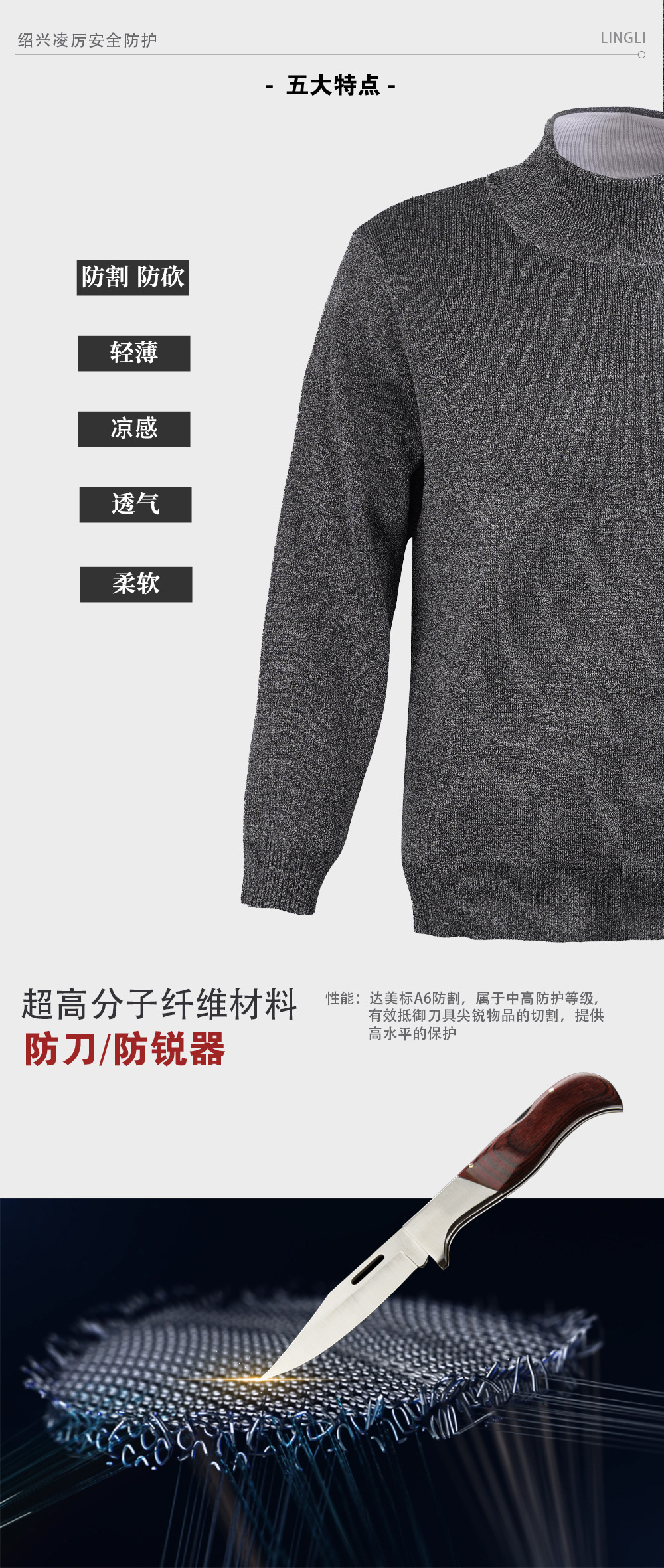 工艺:防割服采用PE 5级防割纤维材料,该面料创新性的结合了超高分子量聚乙烯,及某些特殊超高分子材料(商业机密),采用特殊的高密度纺织机器加工制造防刀面料,手感微凉,佩戴舒服,非一次性服装,便于清洗。