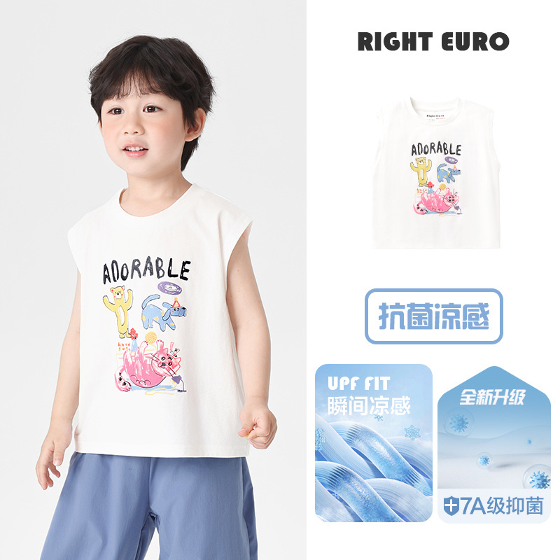 오른쪽 유럽 소년 여름 옷 2025 새로운 조끼 아동 의류 아동용 아기 소년 민소매 티셔츠 여름 얇은스토어 가기