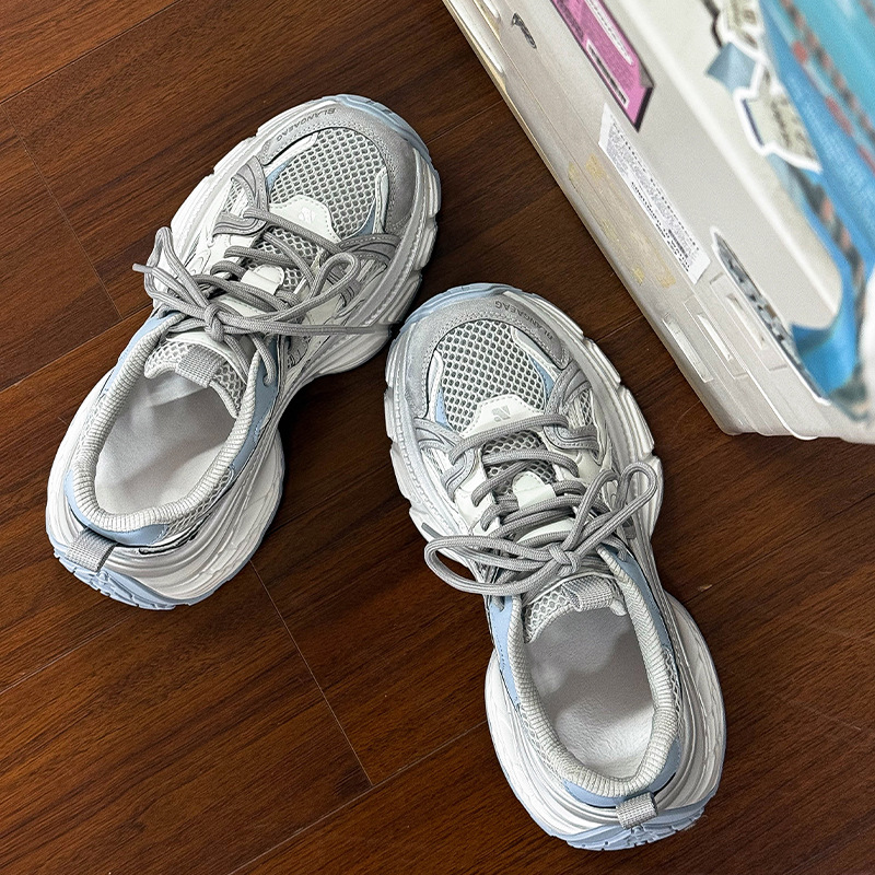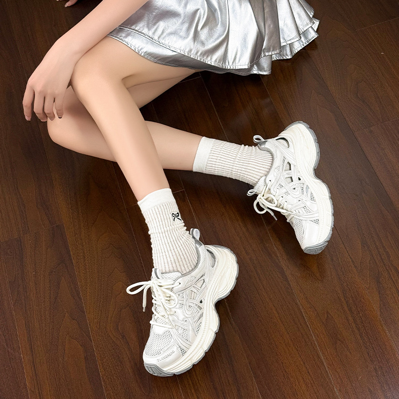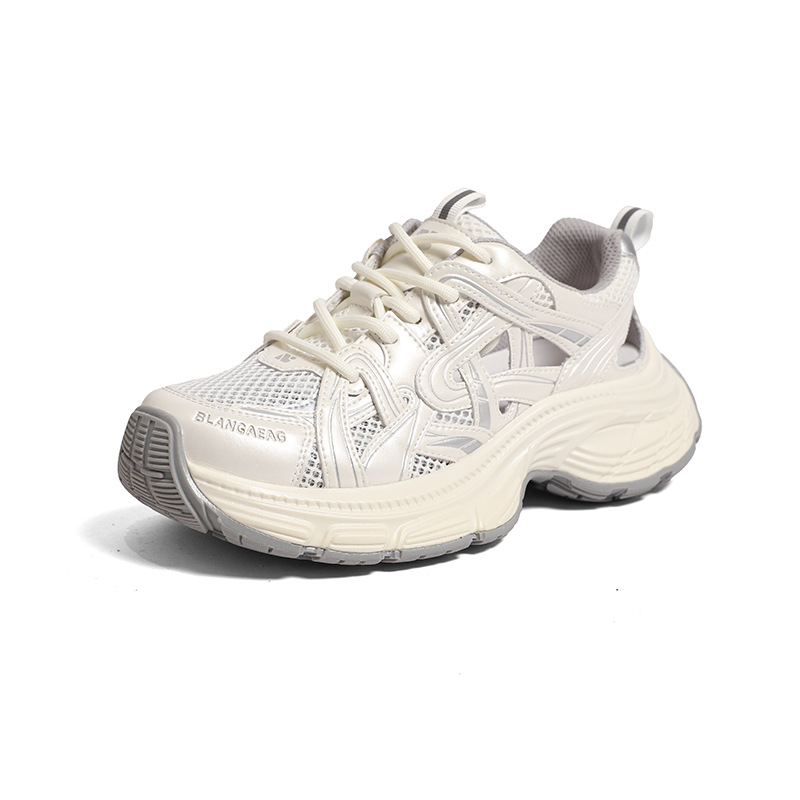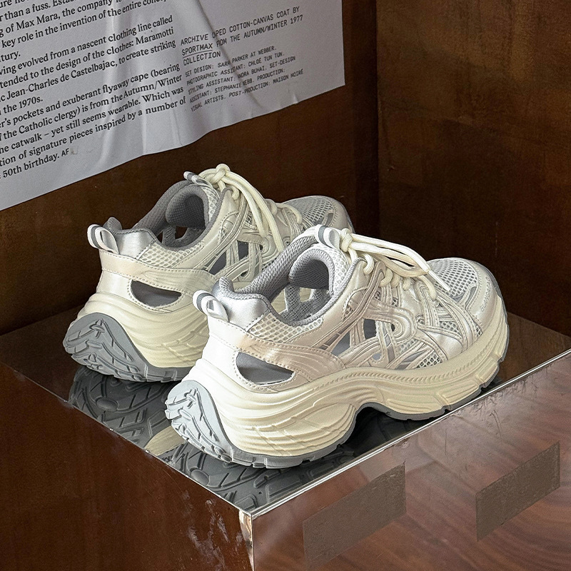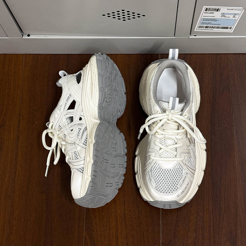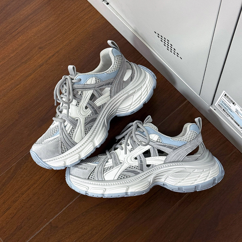 여성용 두꺼운 밑창이 있는 정품 가죽 아빠 신발 2025 여름 새로운 스타일 메쉬 통기성 중공 슬리밍 경량 스포츠 운동화 유행스토어 가기