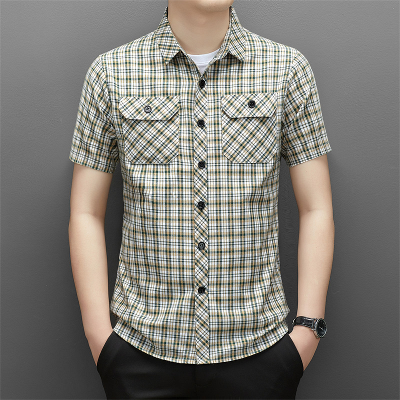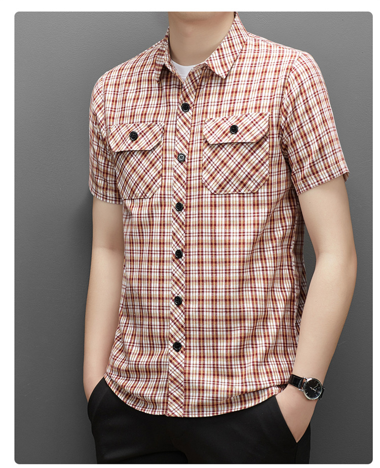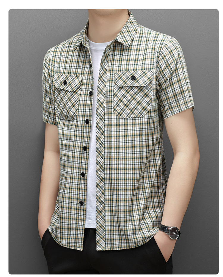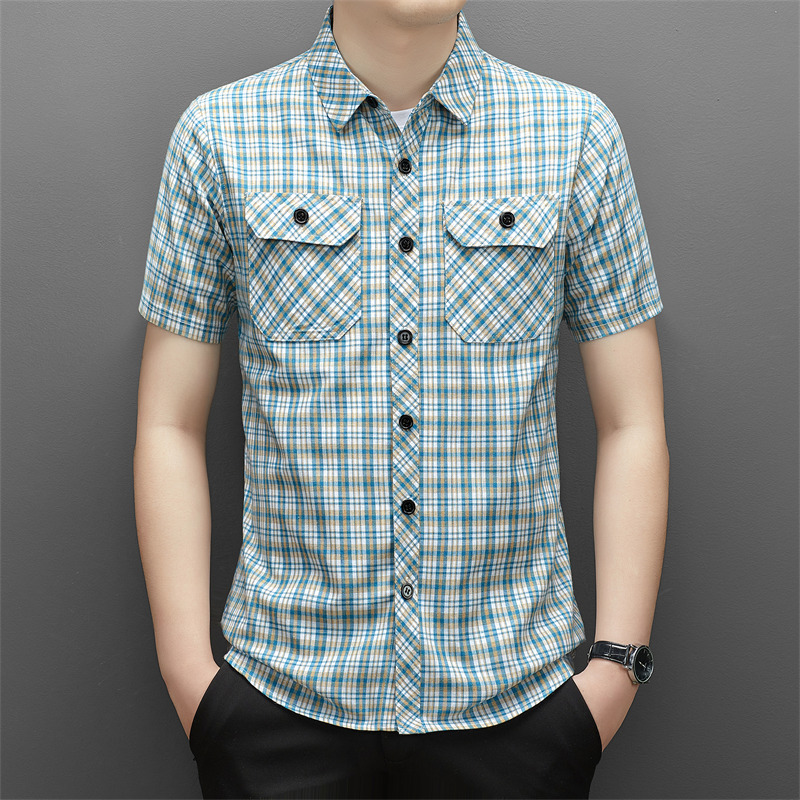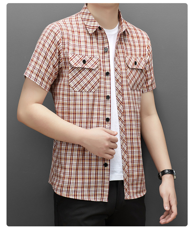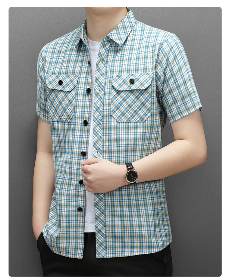 젊은 및 중년층을 위한 여름 신상 면 및 린넨 반팔 남성 셔츠, 체크무늬 더블 포켓 작업복, 남성용 캐주얼 반팔 셔츠