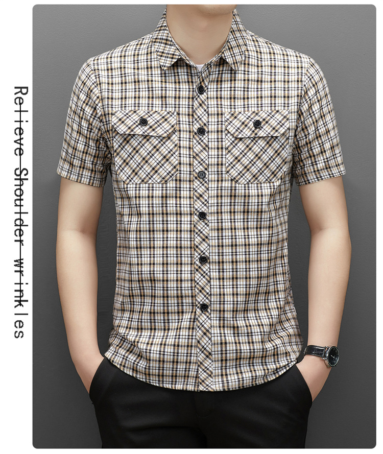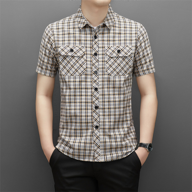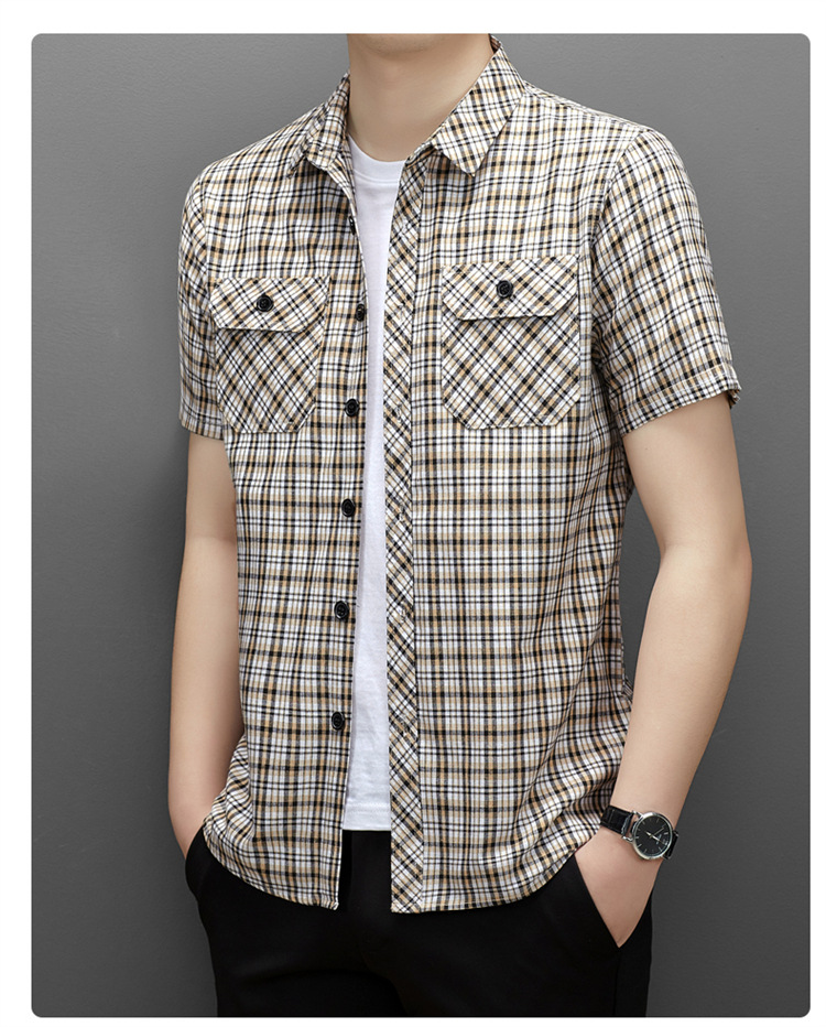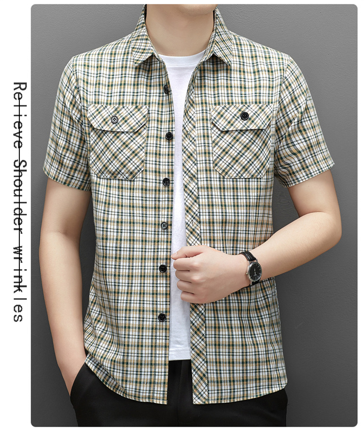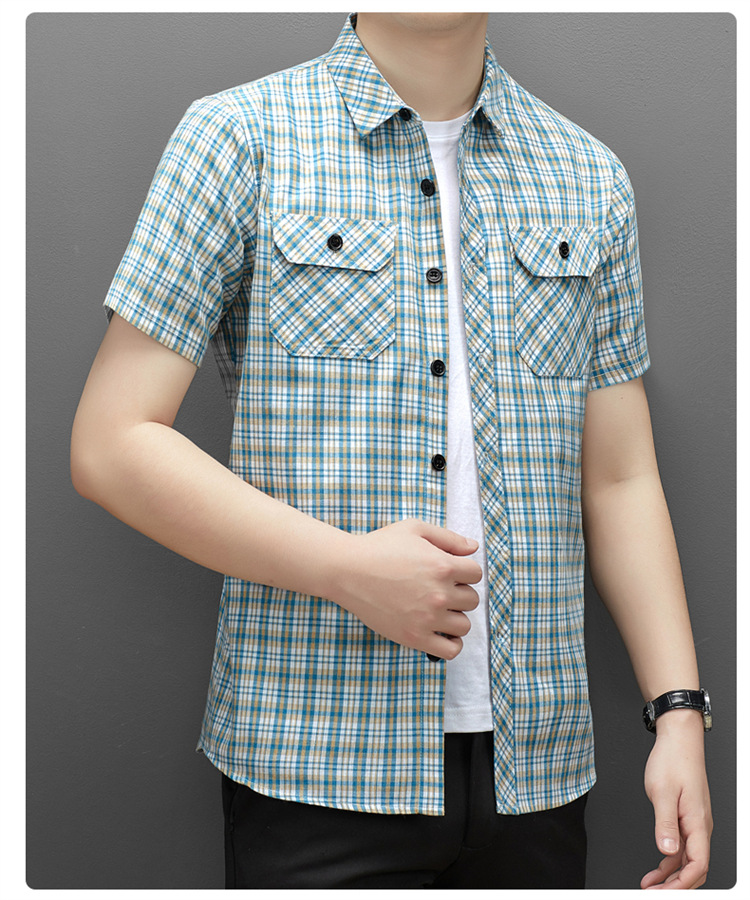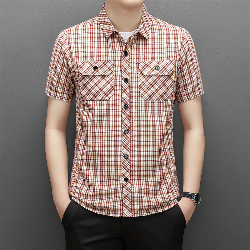 젊은 및 중년층을 위한 여름 신상 면 및 린넨 반팔 남성 셔츠, 체크무늬 더블 포켓 작업복, 남성용 캐주얼 반팔 셔츠