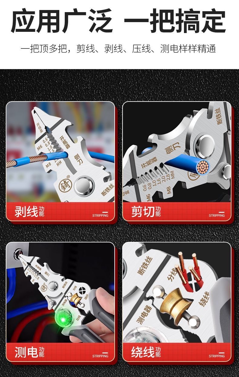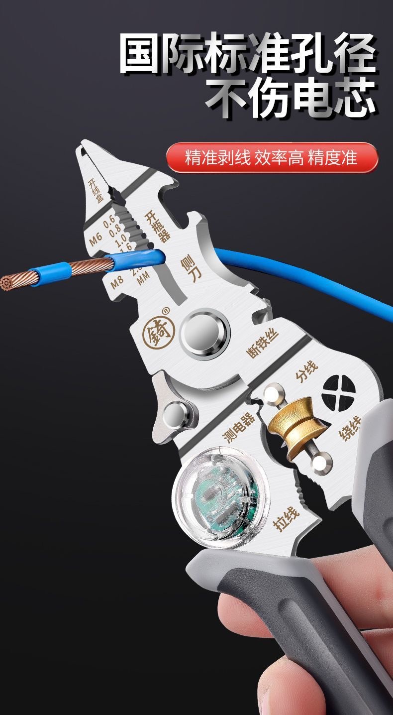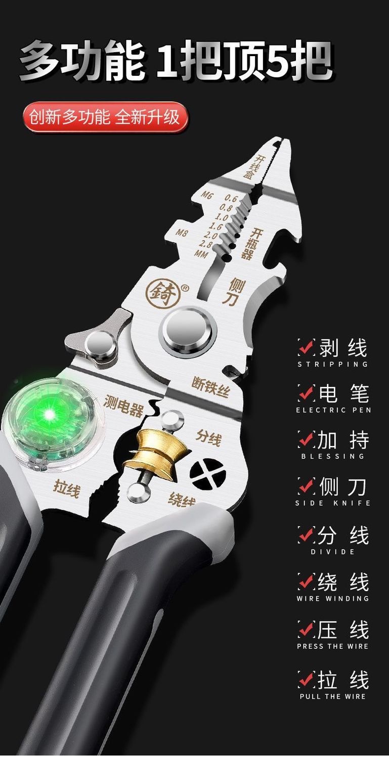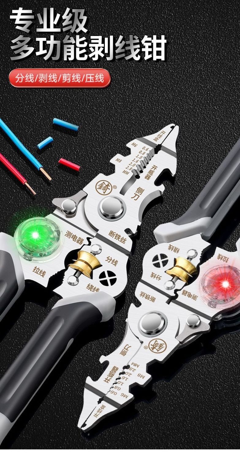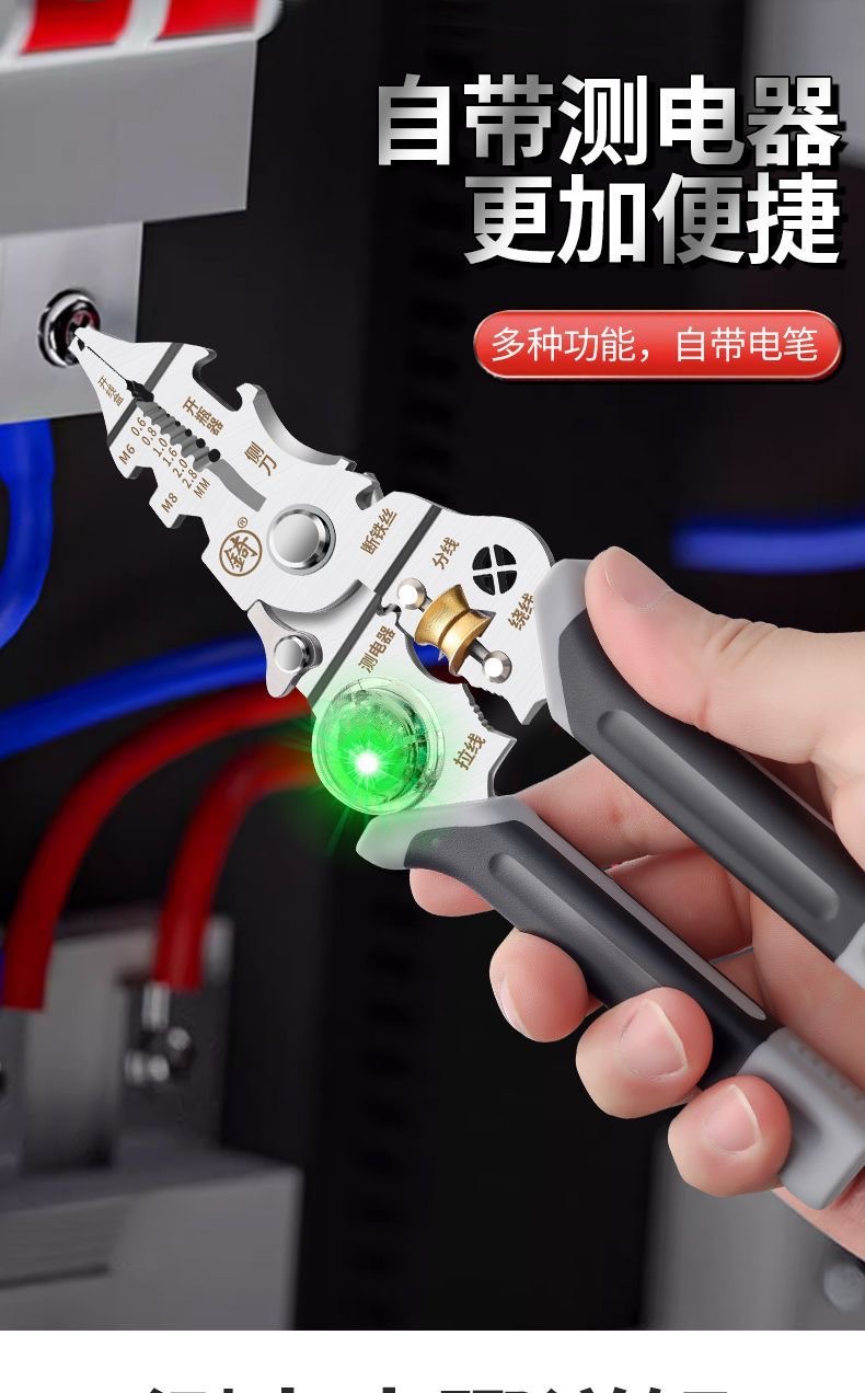 [징] 전기 테스트 펜, 다기능 와이어 스트리핑, 새로운 전기 기술자 전용 와이어 스트리핑 펜치, 와이어 감기, 와이어 절단 및 압착