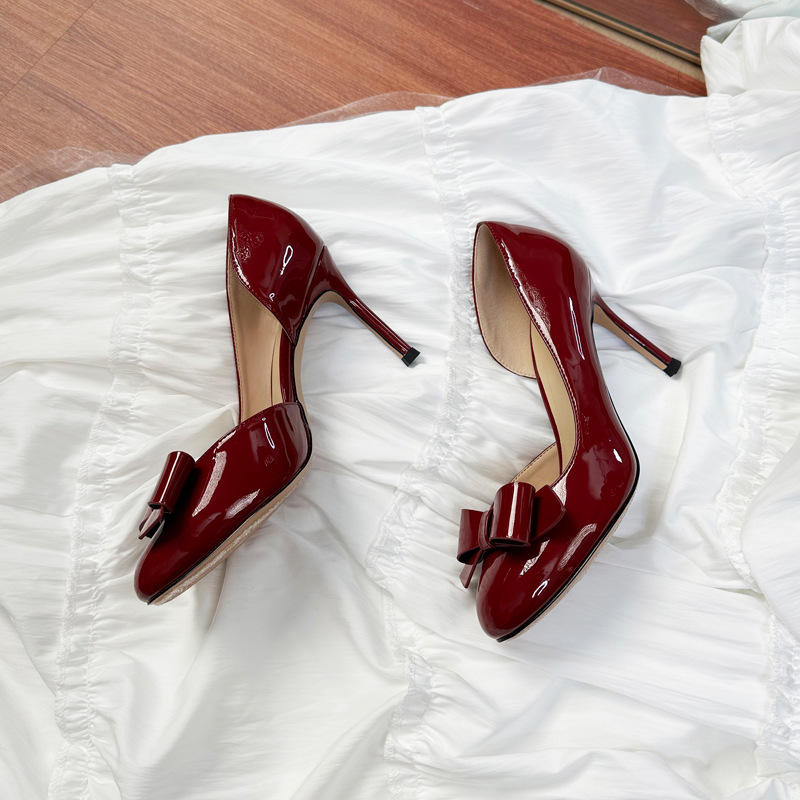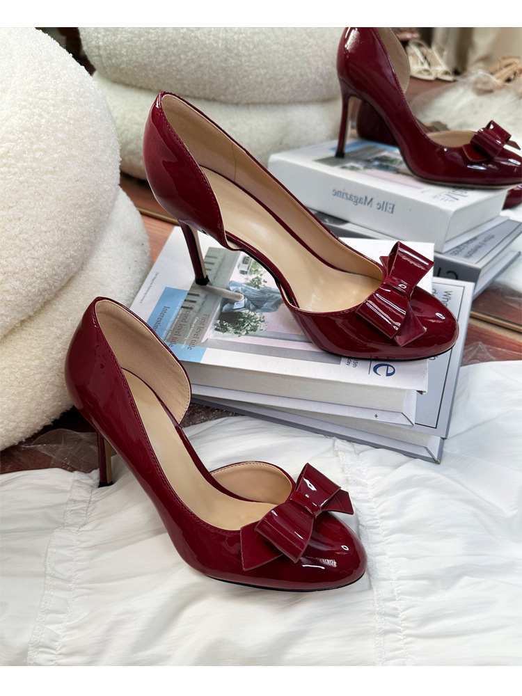 D-28 스팟 페이턴트 가죽 라운드 토 보우 사이드 빈 누드 컬러 하이힐 여성용 작은 사이즈 통근 슈즈
