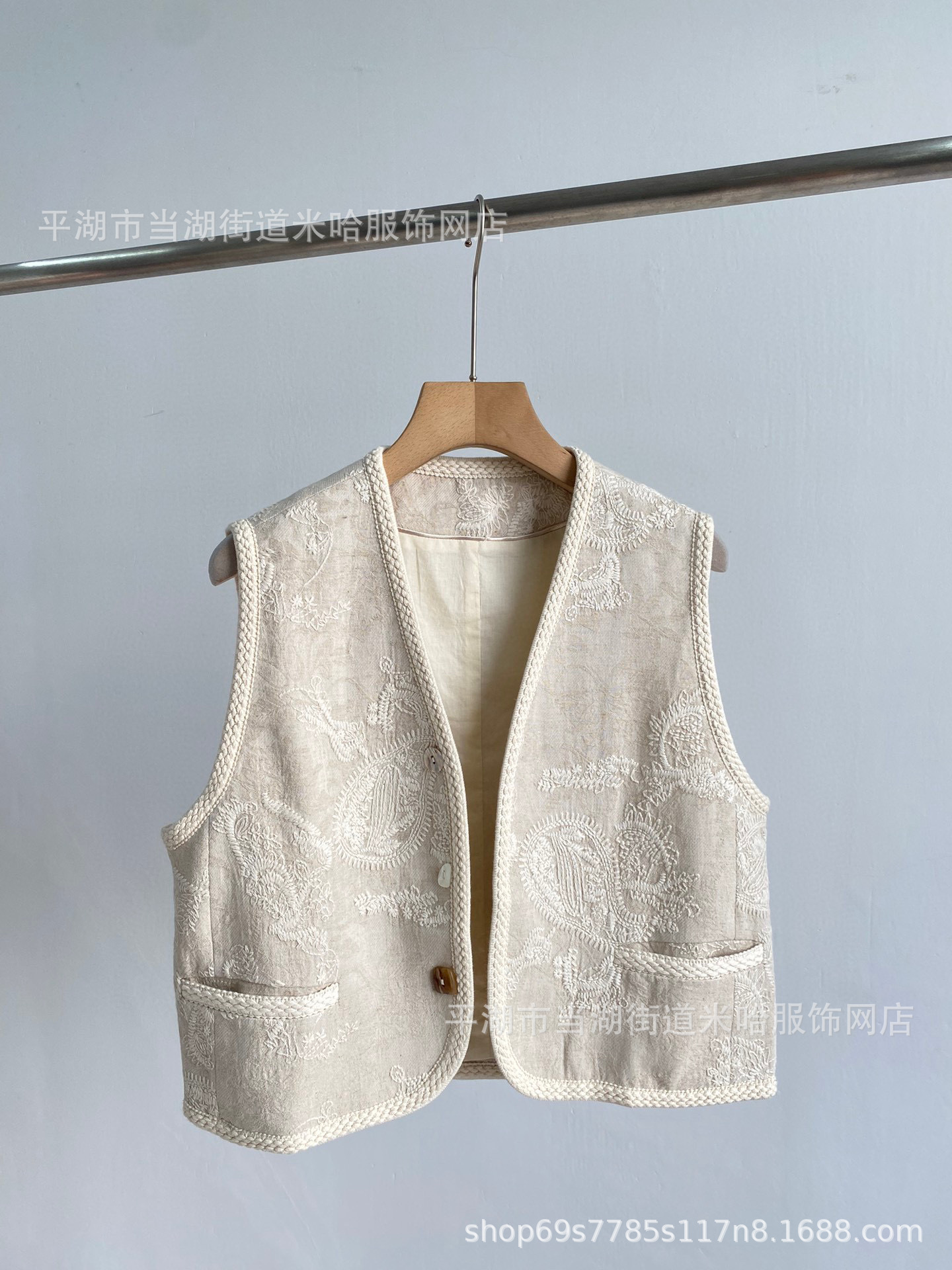 봄과 여름 새로운 캐슈 꽃 수 놓은 V-Neck 리넨 조끼