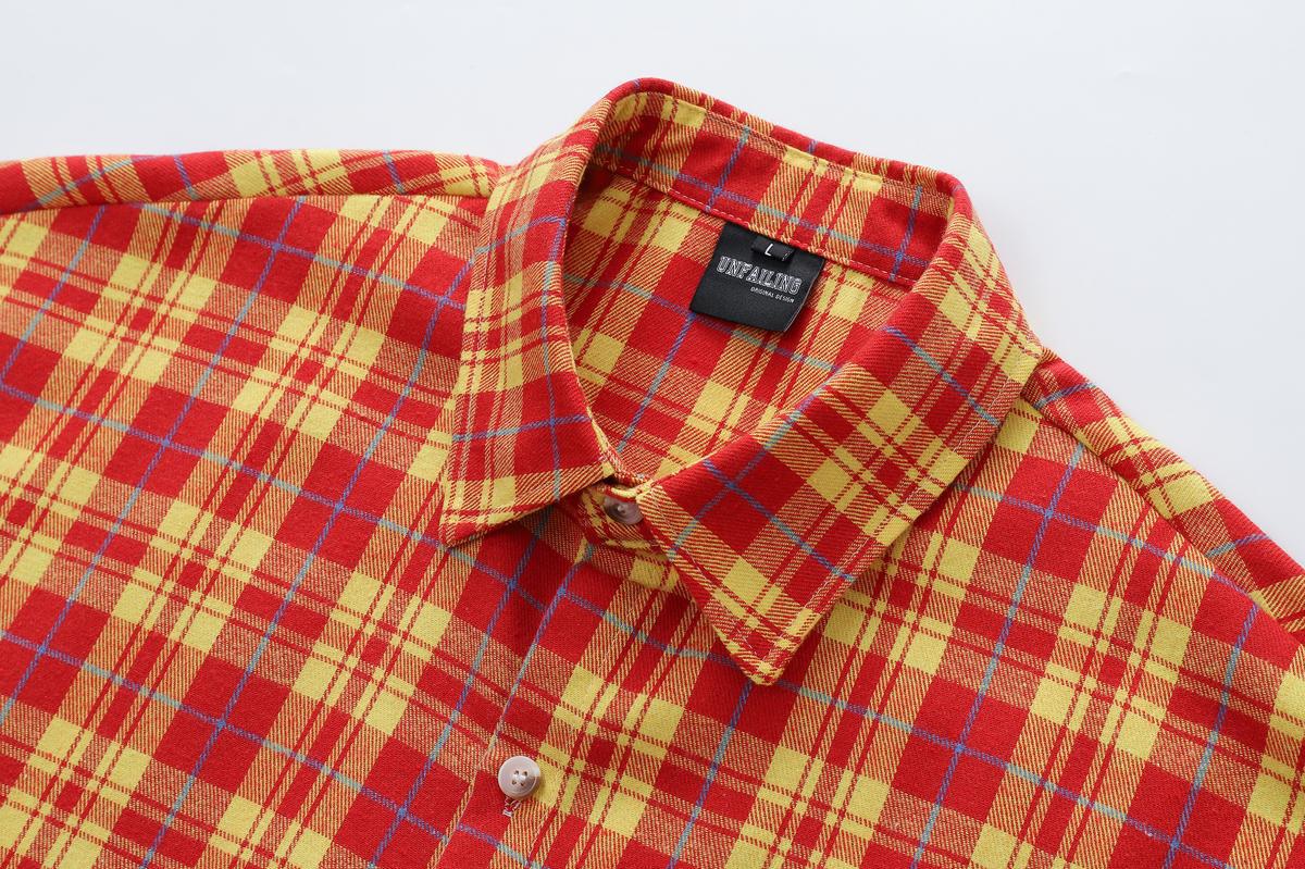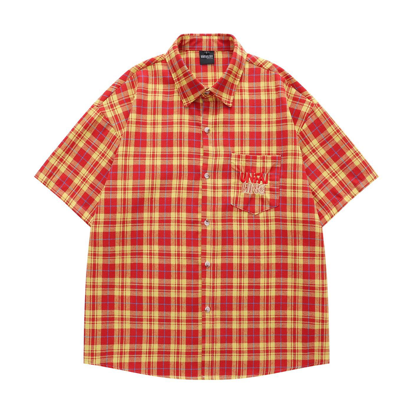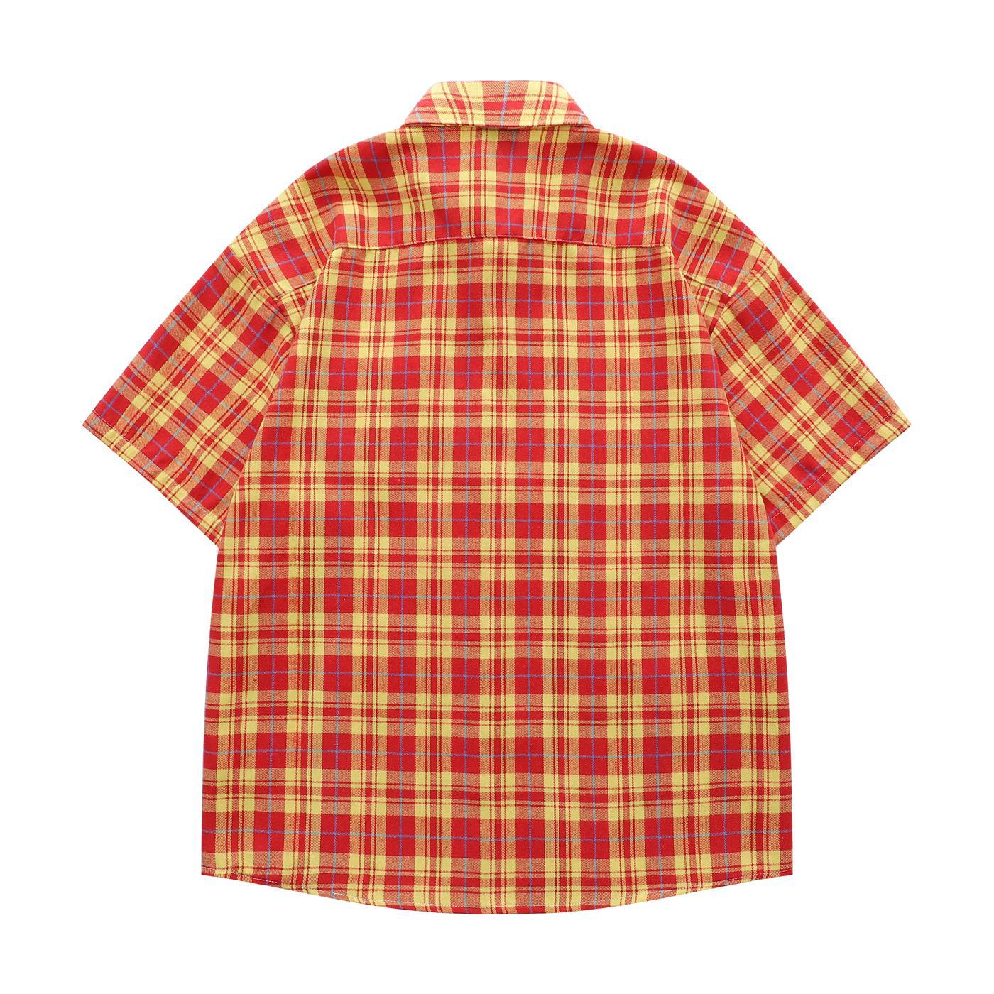 남성과 여성을 위한 미국 빈티지 대비 빨간색과 노란색 격자 무늬 반팔 셔츠 복고풍 디자인 잘 생긴 커플 셔츠스토어 가기