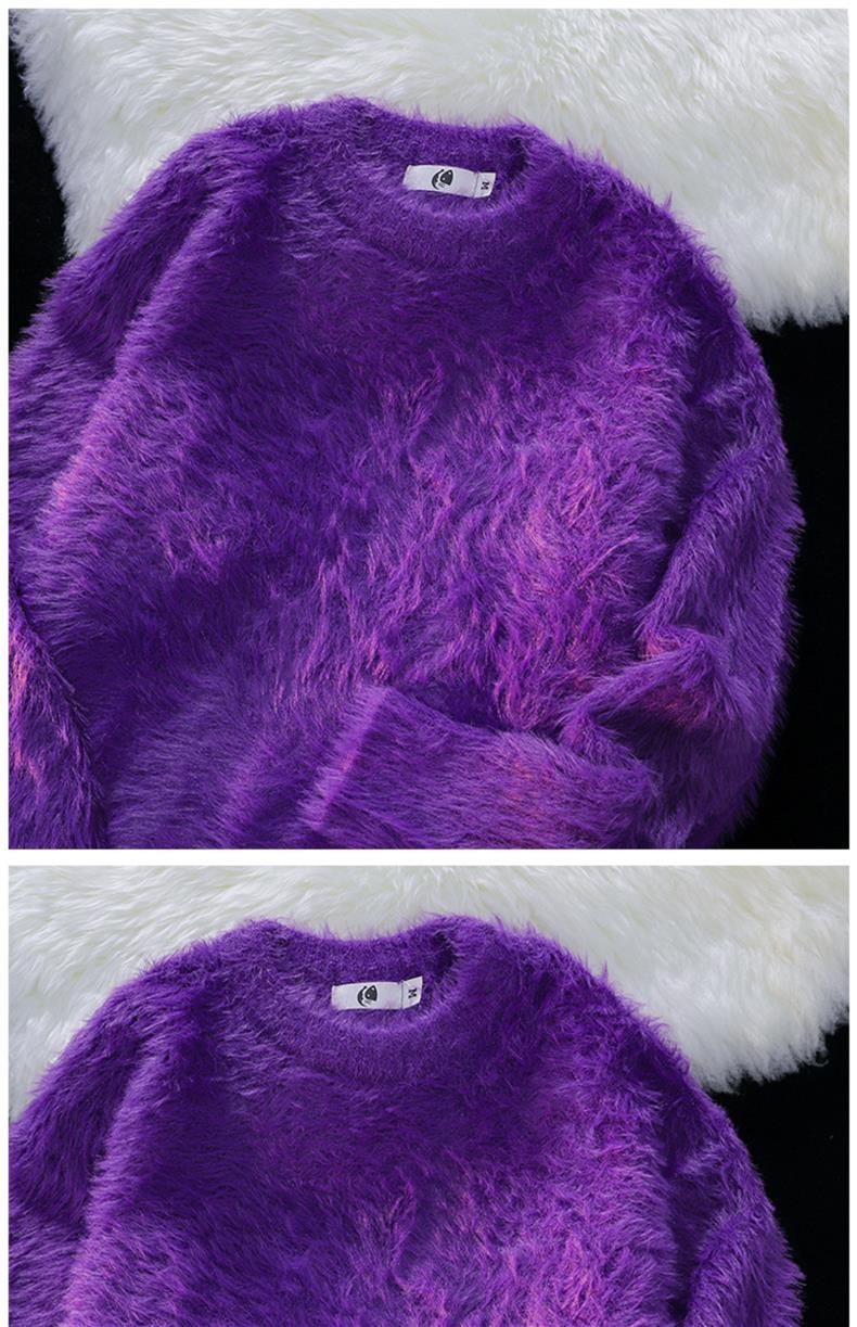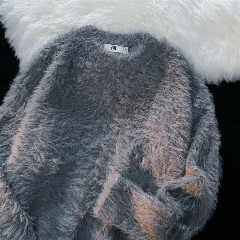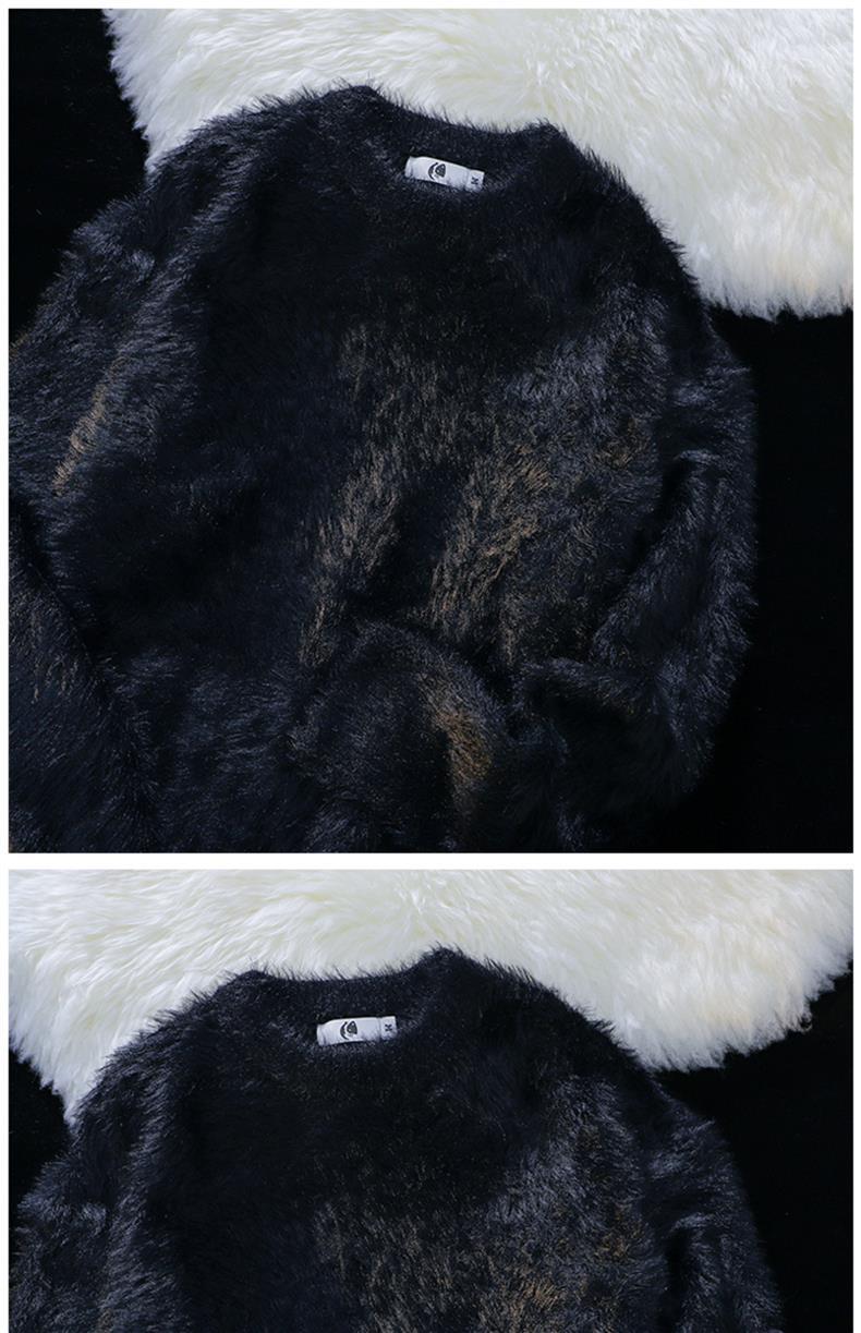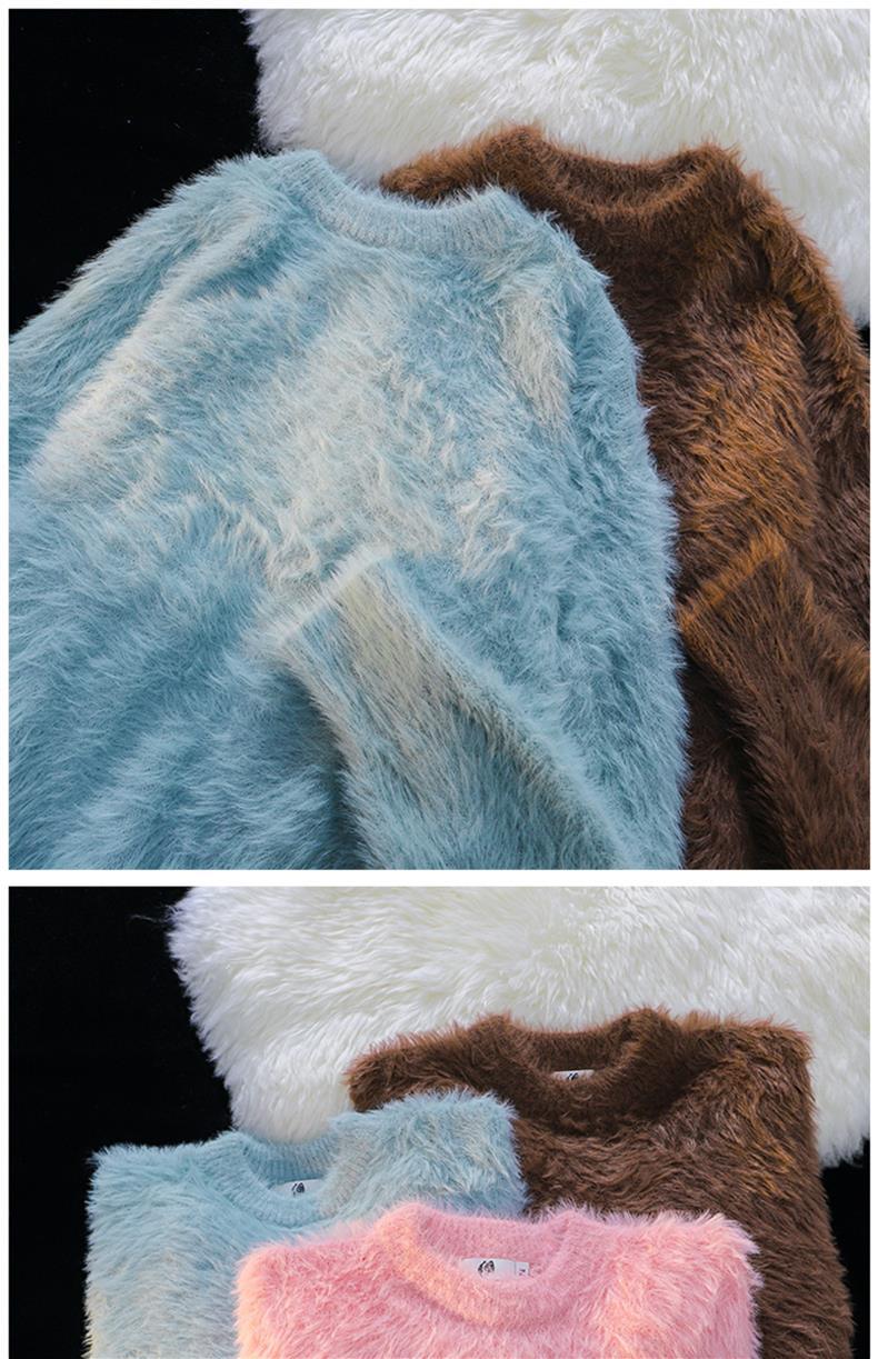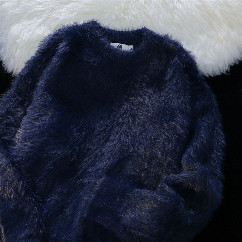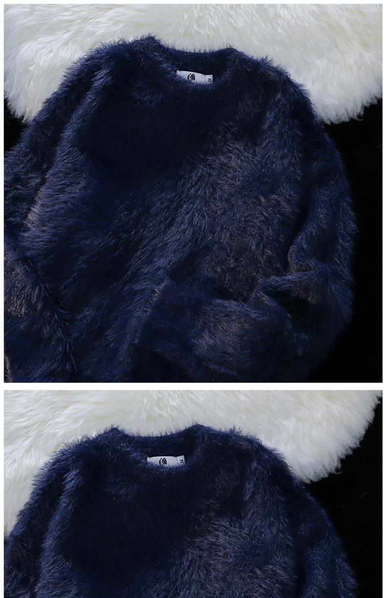 남성용 가을 겨울 단색 따뜻한 내부 스웨터 일본 유행 브랜드 복고풍 느슨한 부드러운 밀랍 모피 라운드 넥 스웨터