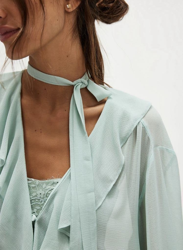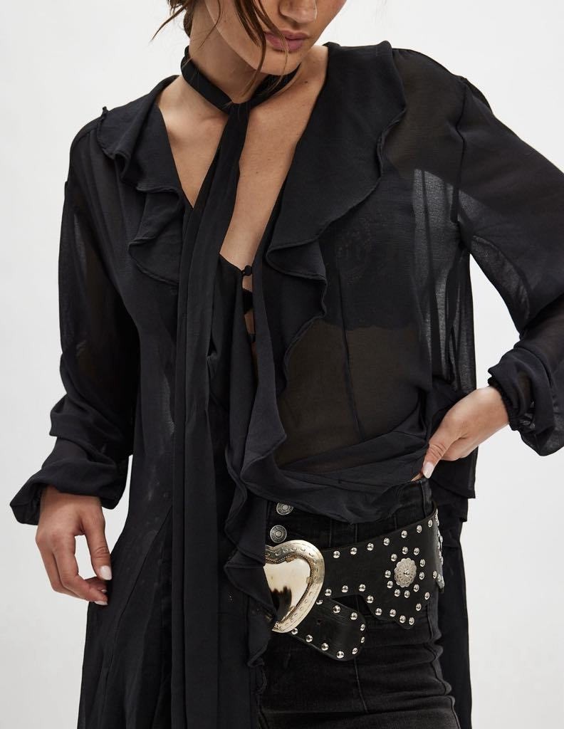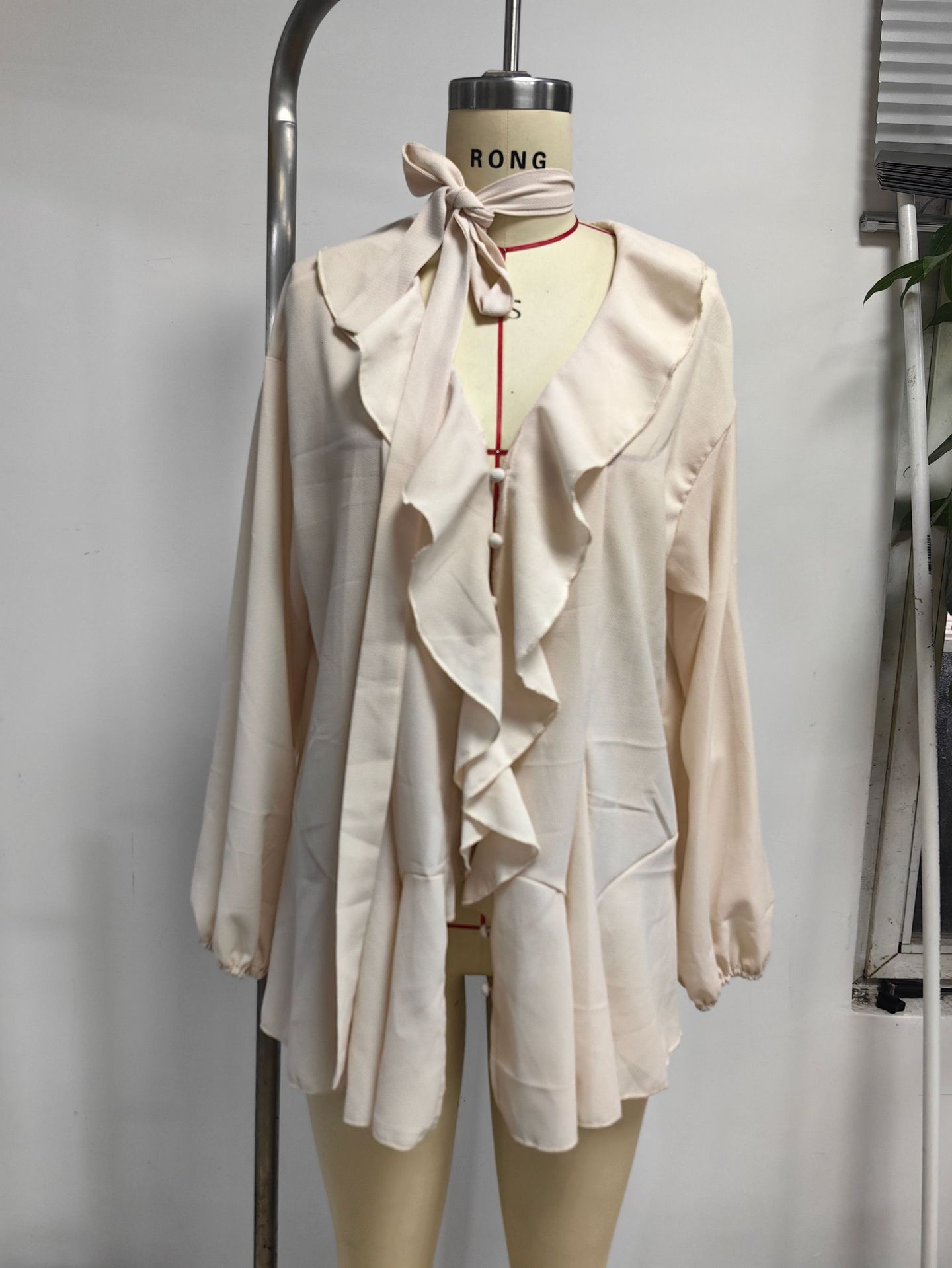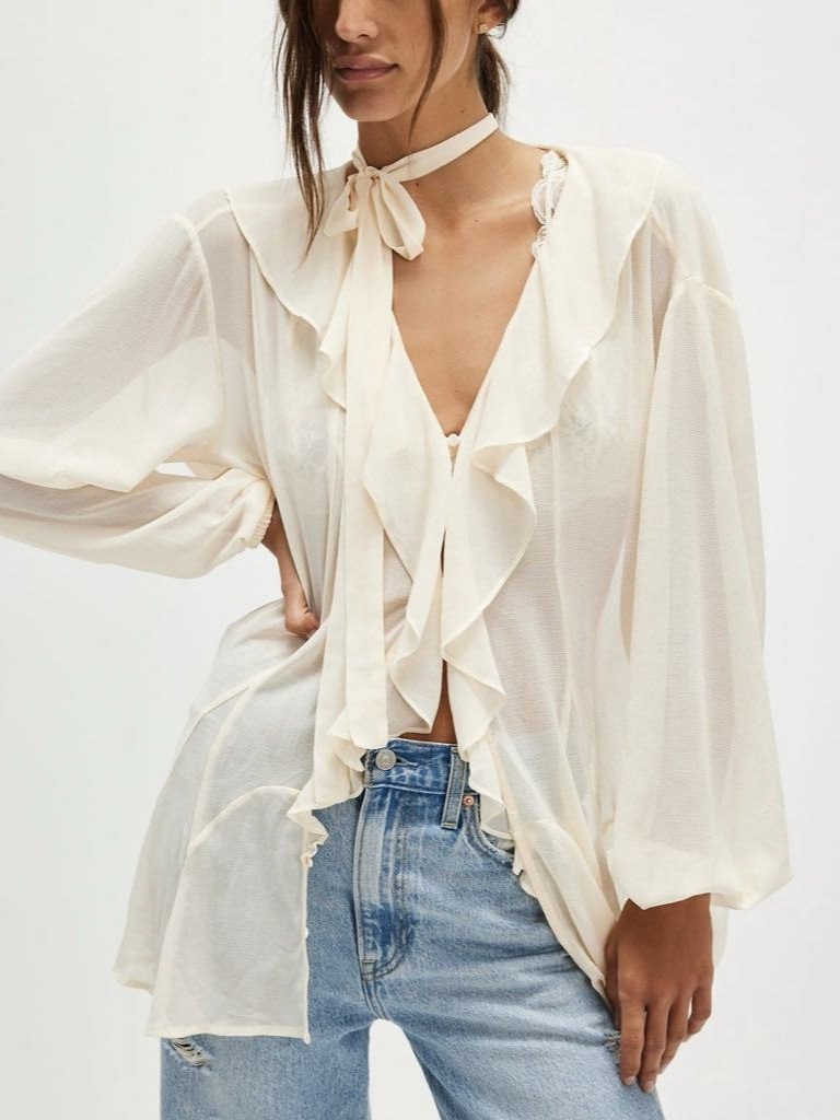 2025 새로운 여름 여성 솔리드 컬러 v 넥 섹시한 시스루 스트랩 프릴 벨 슬리브 쉬폰 셔츠