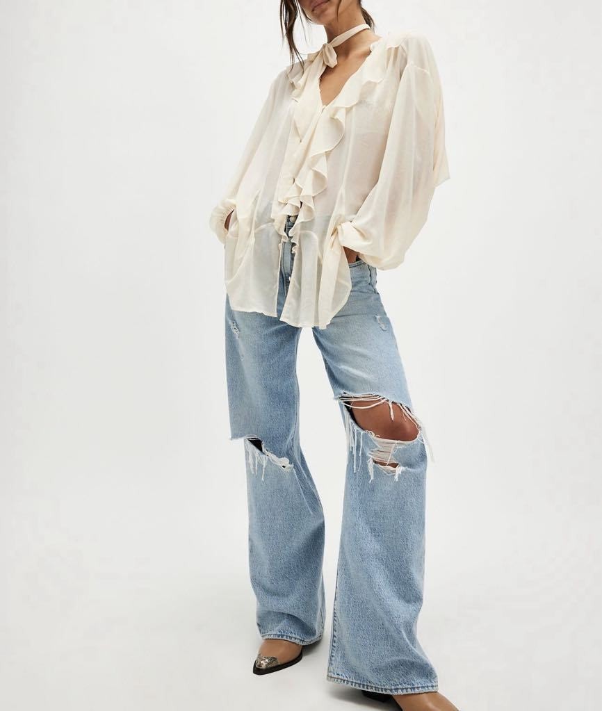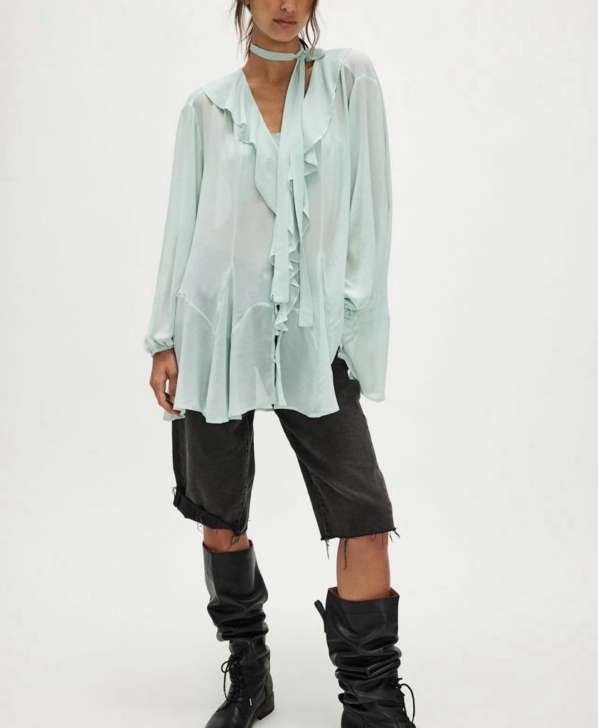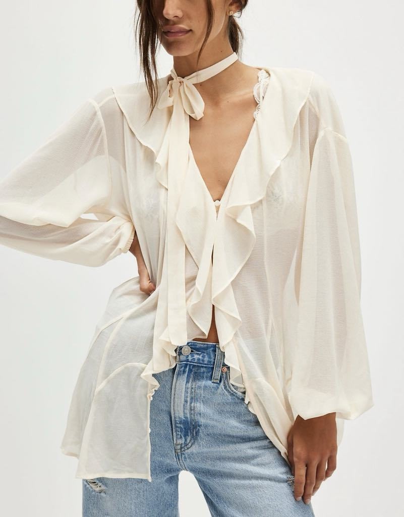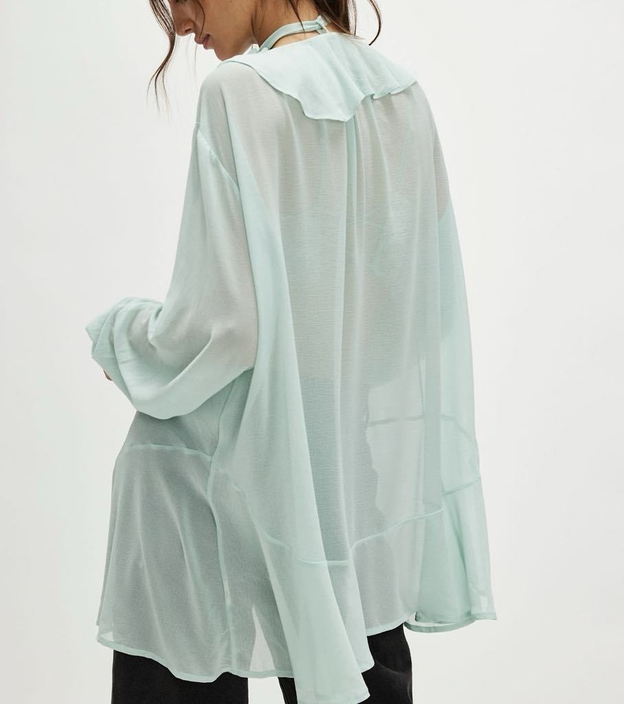 2025 새로운 여름 여성 솔리드 컬러 v 넥 섹시한 시스루 스트랩 프릴 벨 슬리브 쉬폰 셔츠스토어 가기