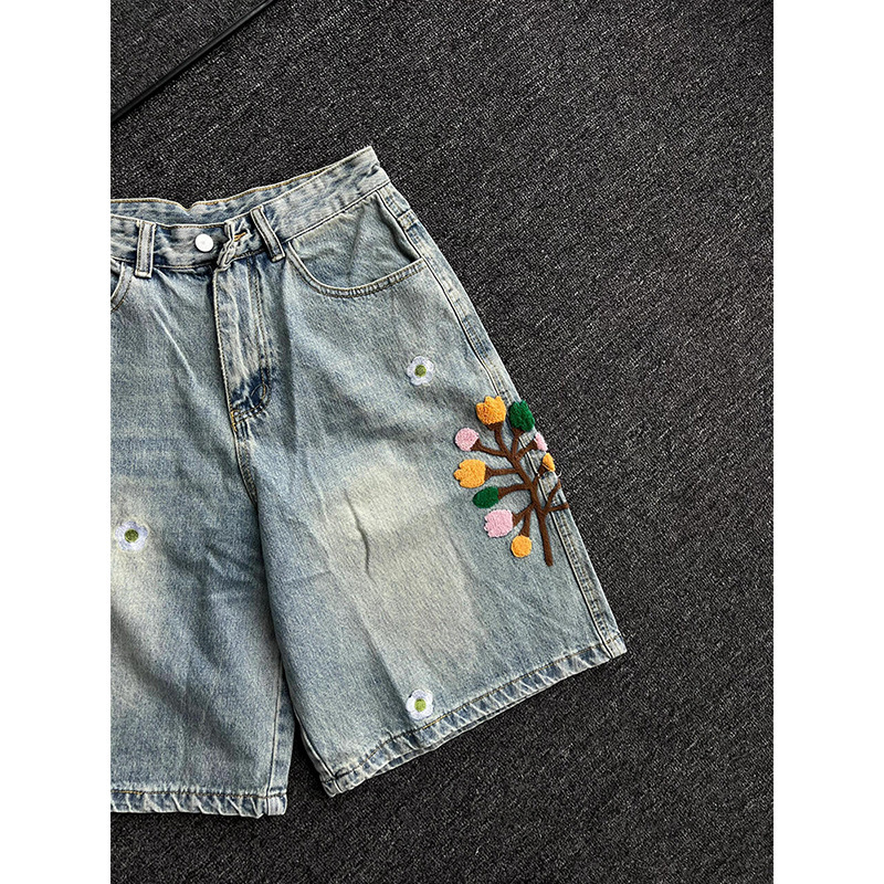 레트로 핸드 그라인드 라이트 블루 워시 크로 셰 뜨개질 자수 남성용 및 여성용 5부 청바지 ins 디자인 반바지