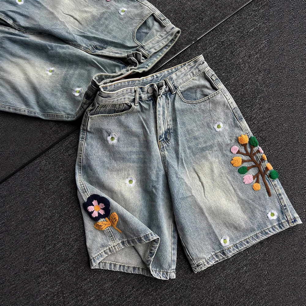 레트로 핸드 그라인드 라이트 블루 워시 크로 셰 뜨개질 자수 남성용 및 여성용 5부 청바지 ins 디자인 반바지스토어 가기