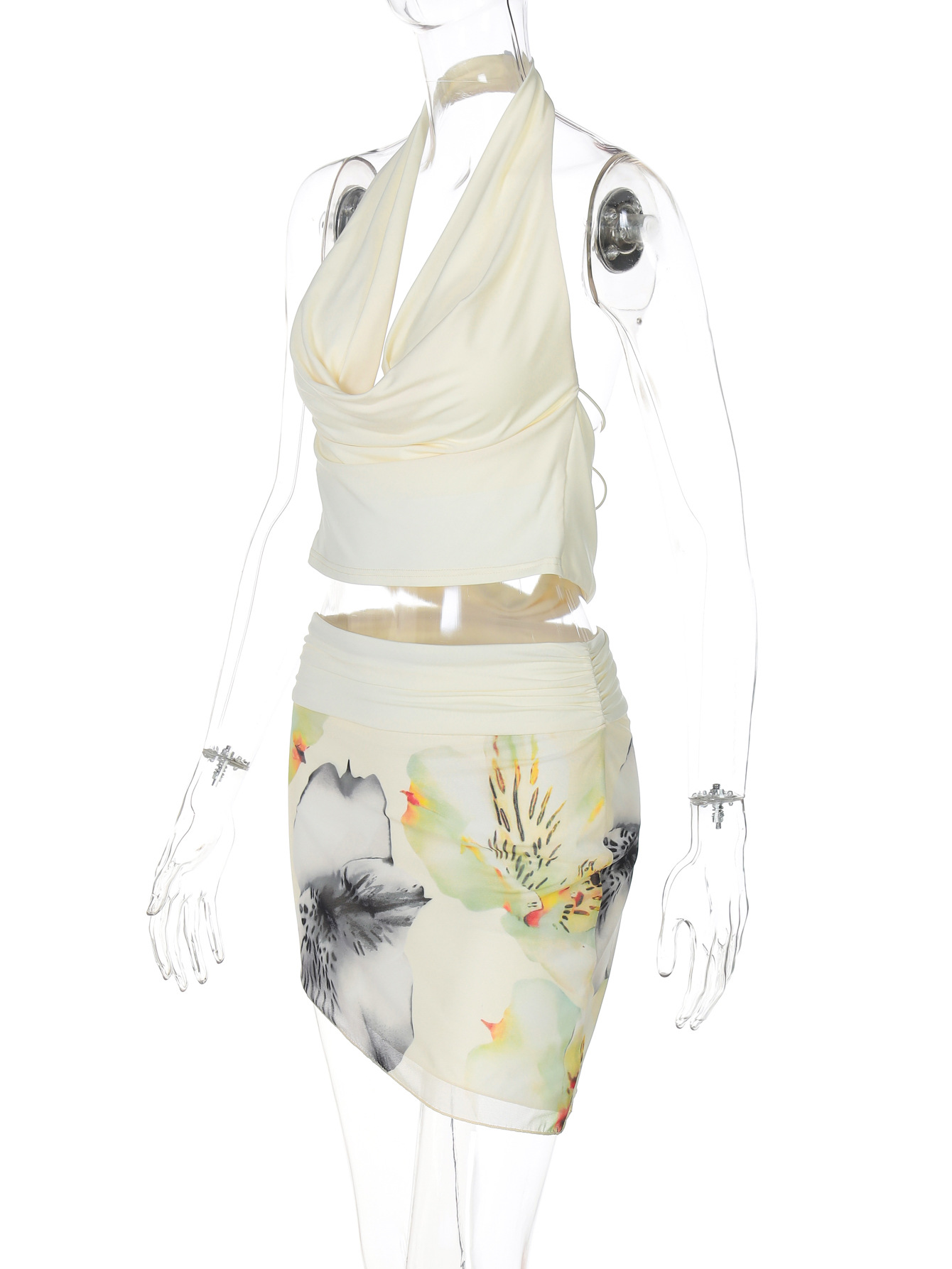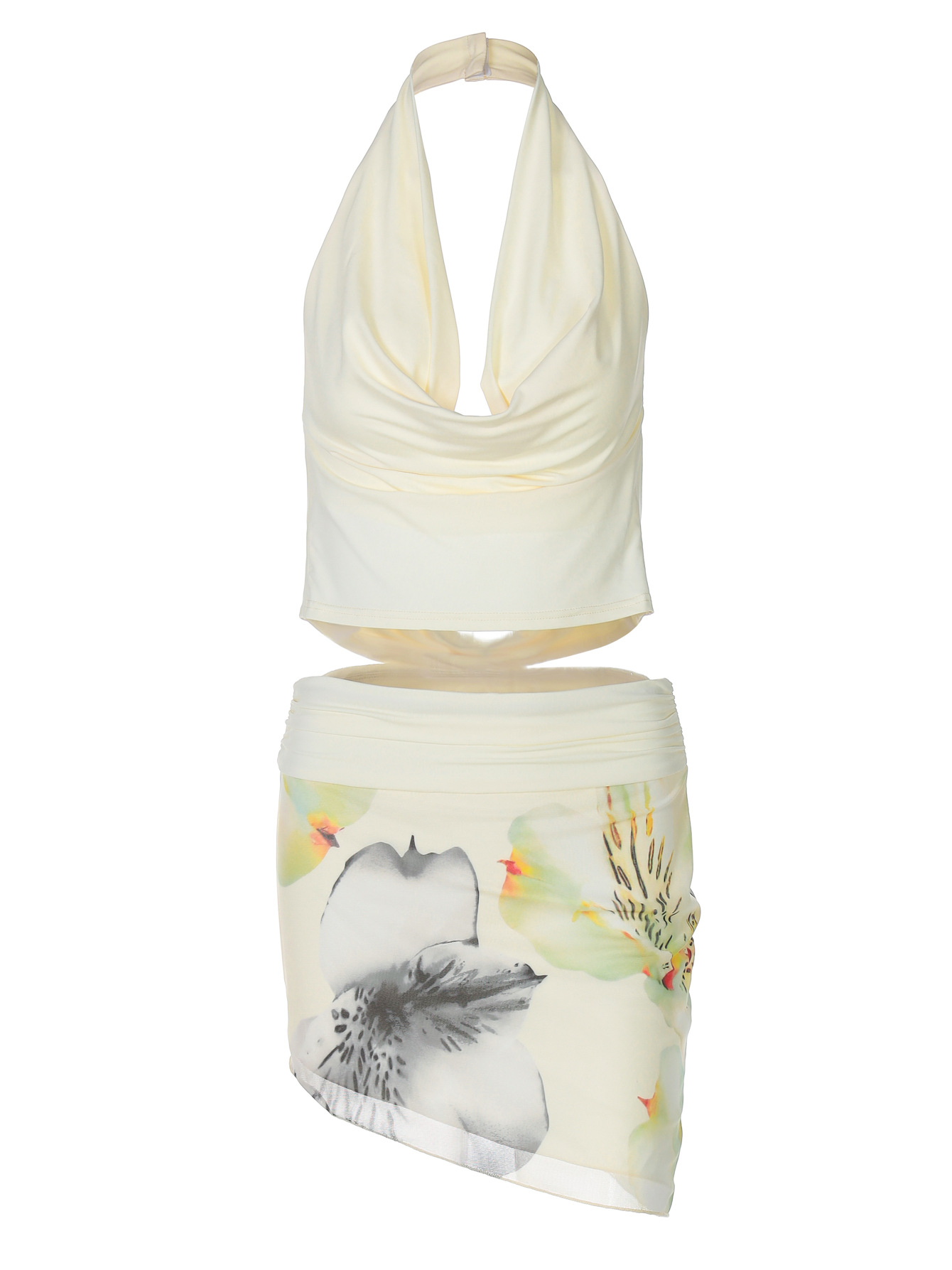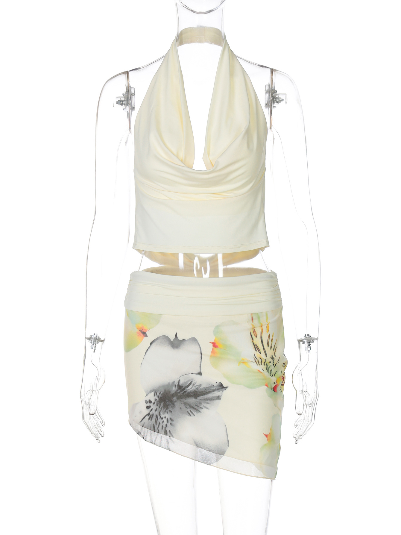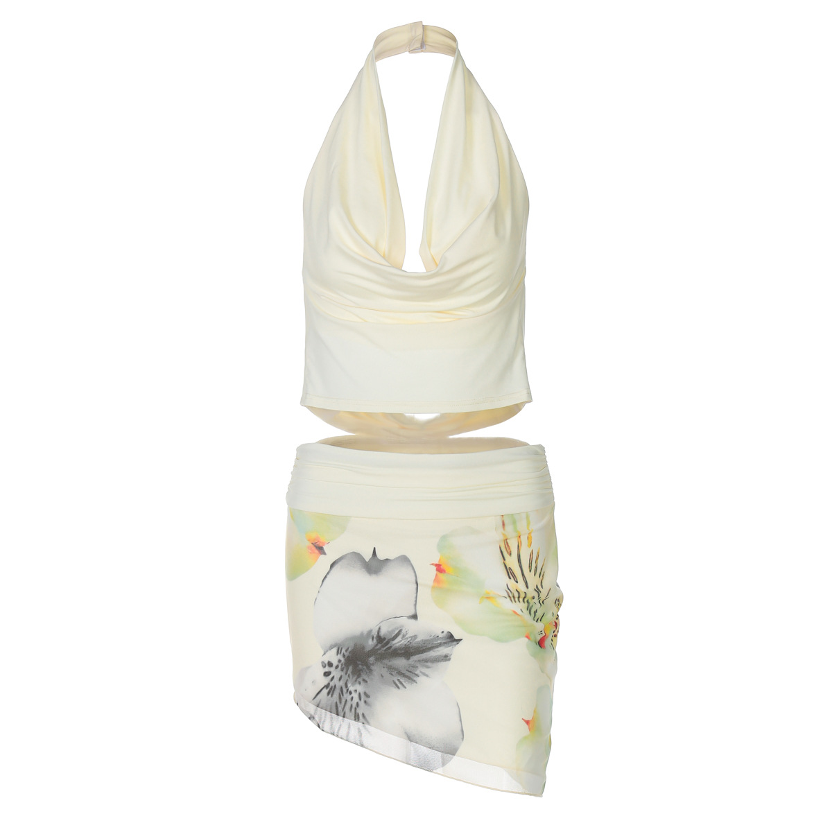 유럽과 미국 스타일 2025 봄과 여름 새로운 여성의 섹시한 교수형 목 스윙 칼라 백리스 탑 힙 스커트 투피스 세트스토어 가기