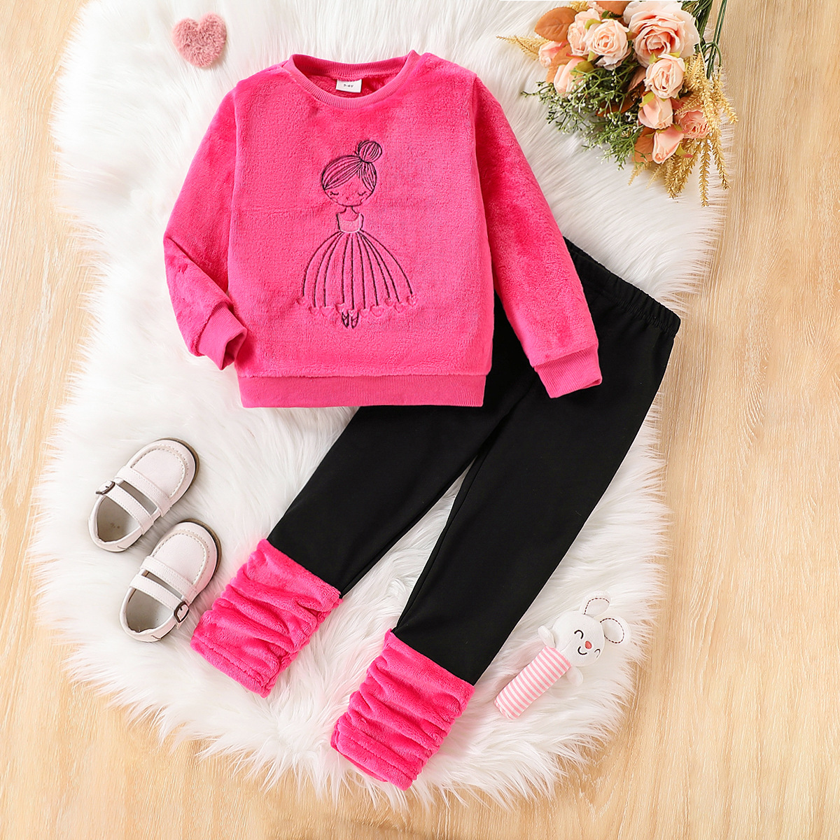 여자 가을, 겨울 정장 아마존 뜨거운 판매 만화 모피 자수 어린 소녀 탑과 바지 투피스 트렌디 세트
