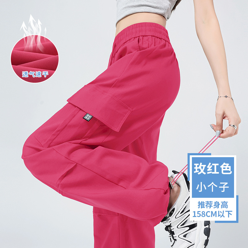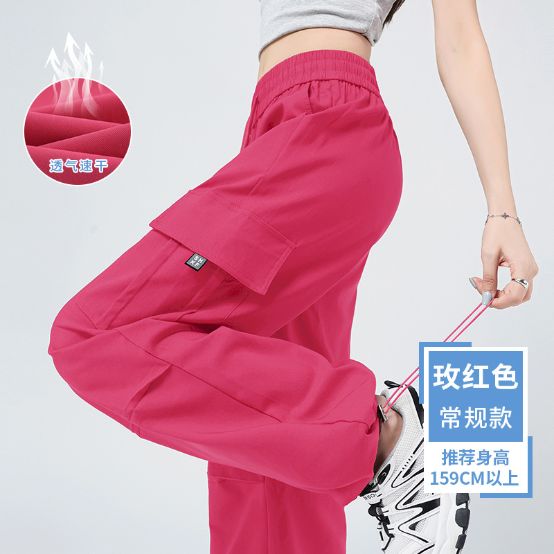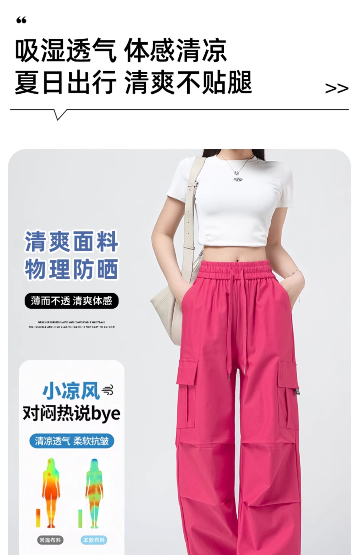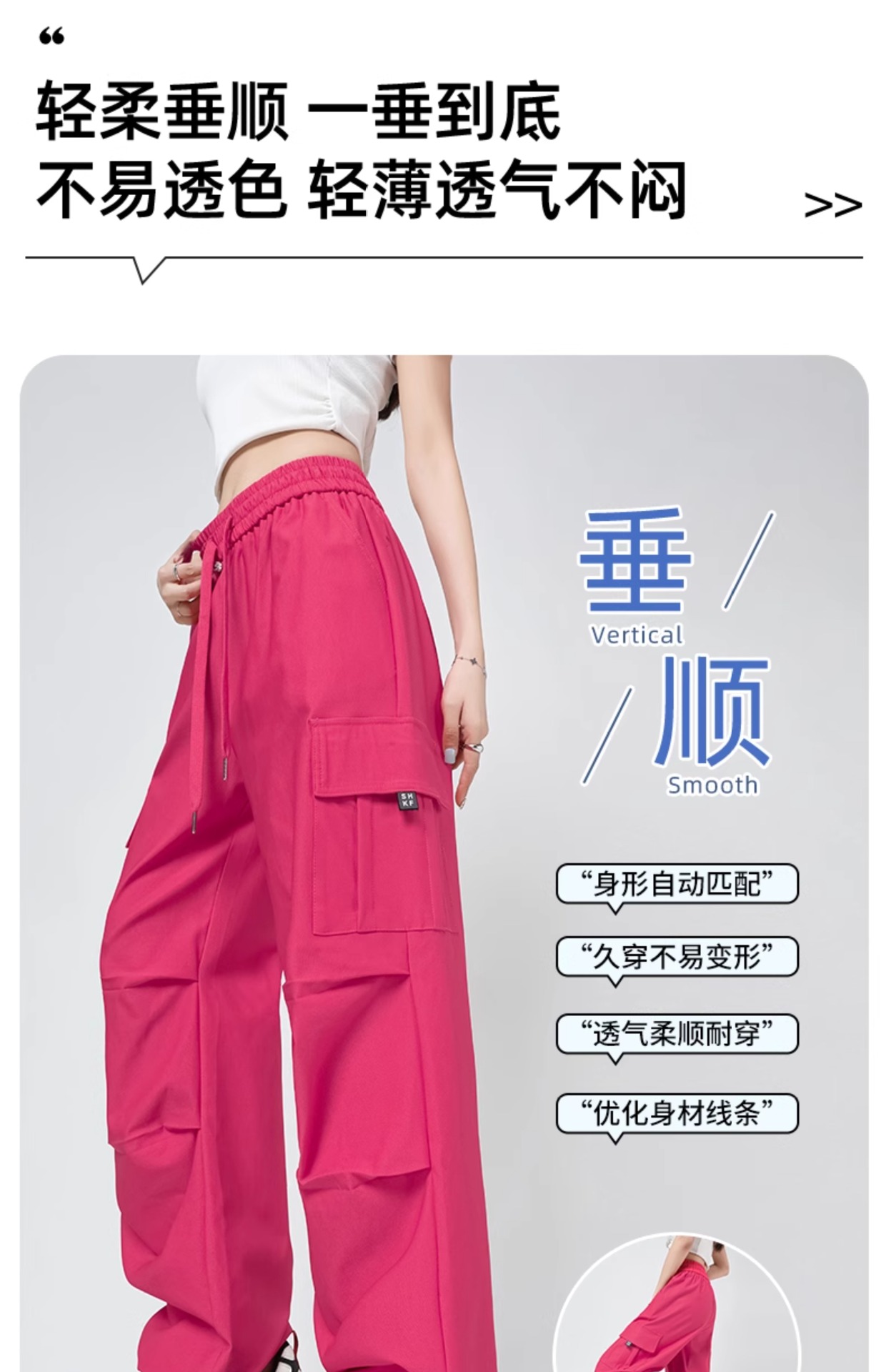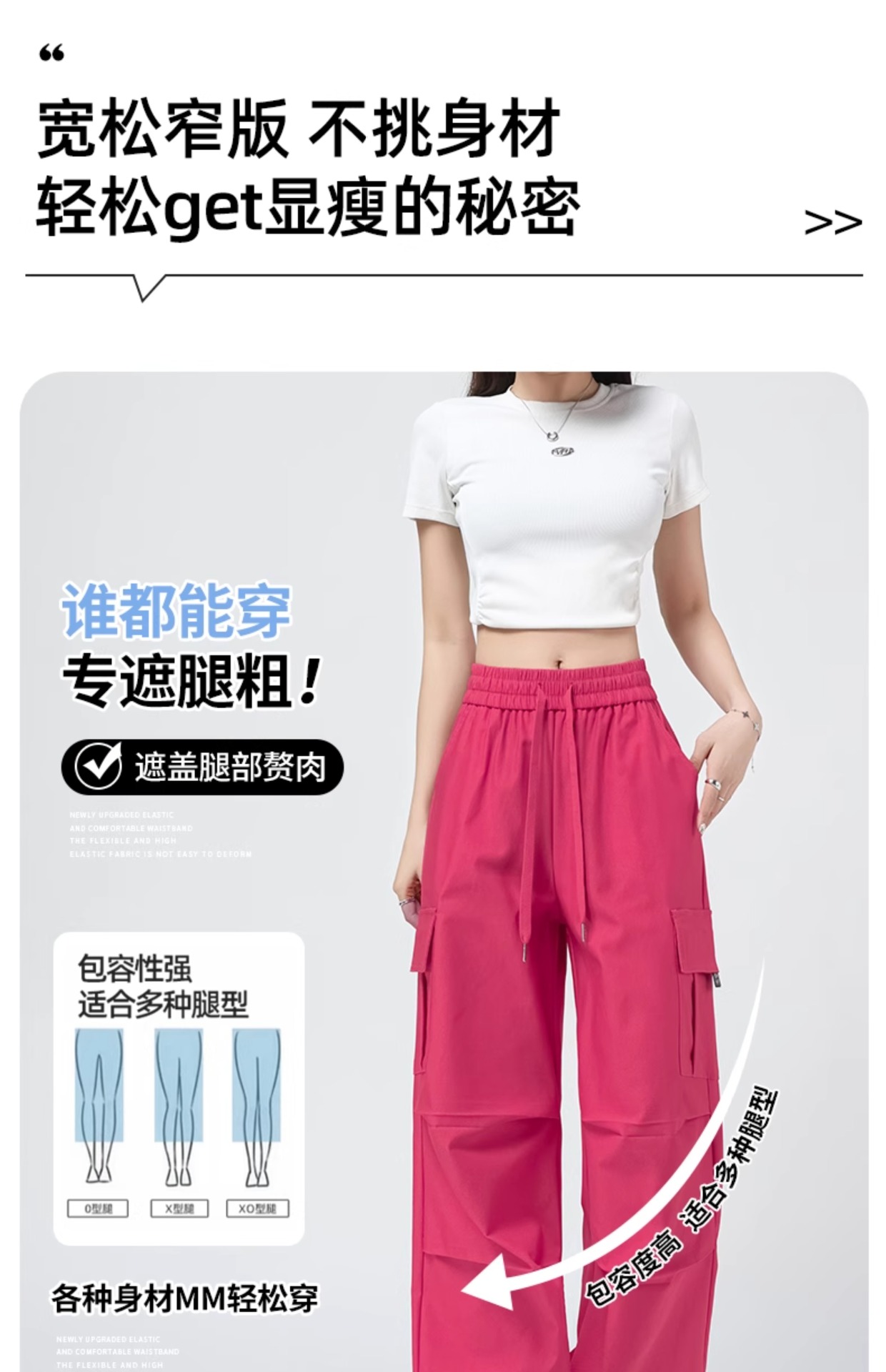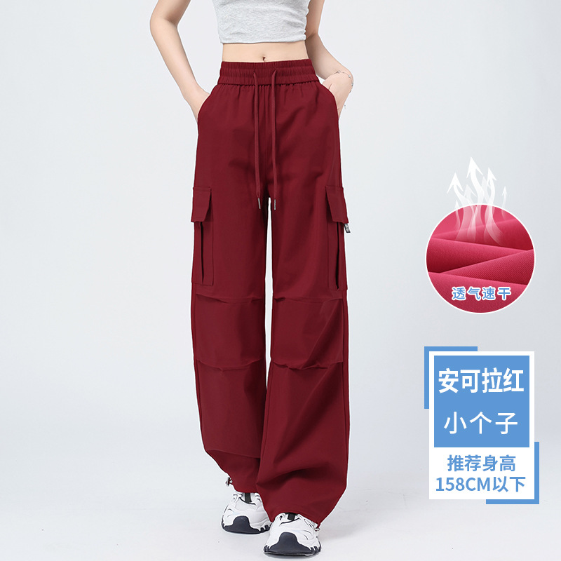 로즈 레드 작업복 여성 여름 얇은 2025 새로운 공수 아메리칸 스타일 속건성 아이스 실크 등산 와이드 레그 스포츠 바지스토어 가기
