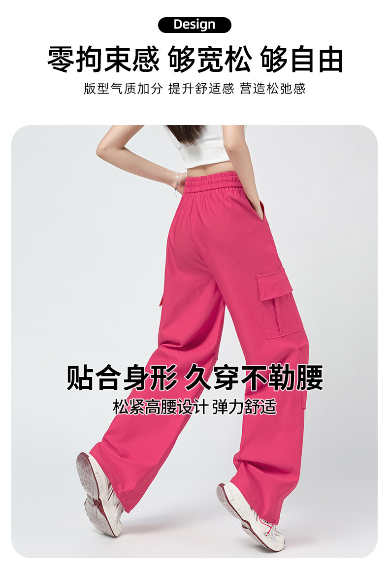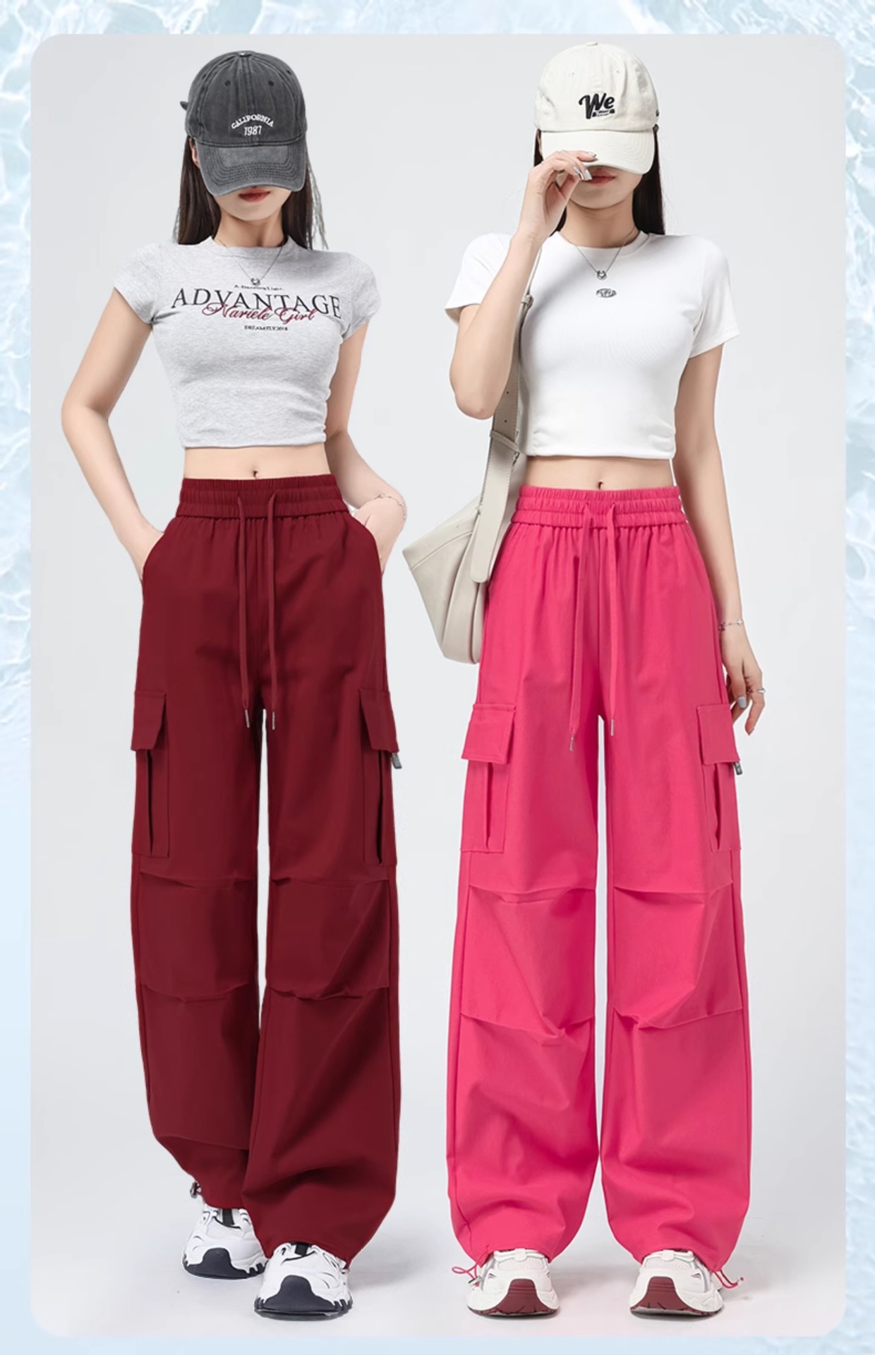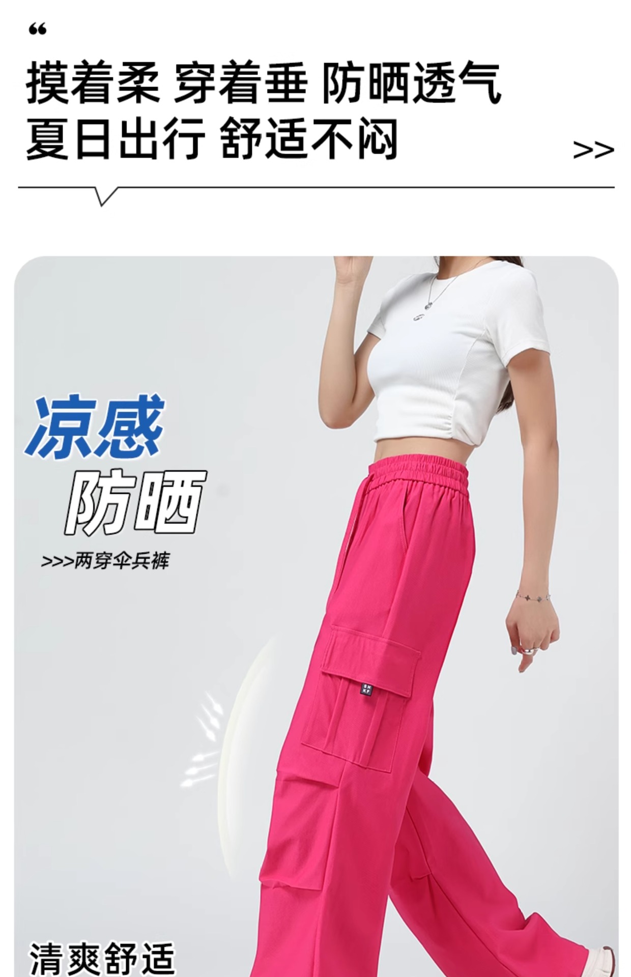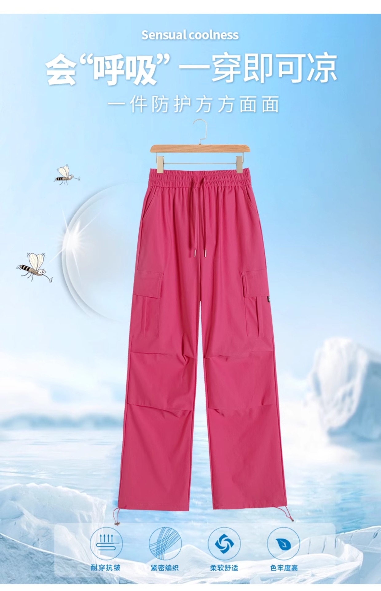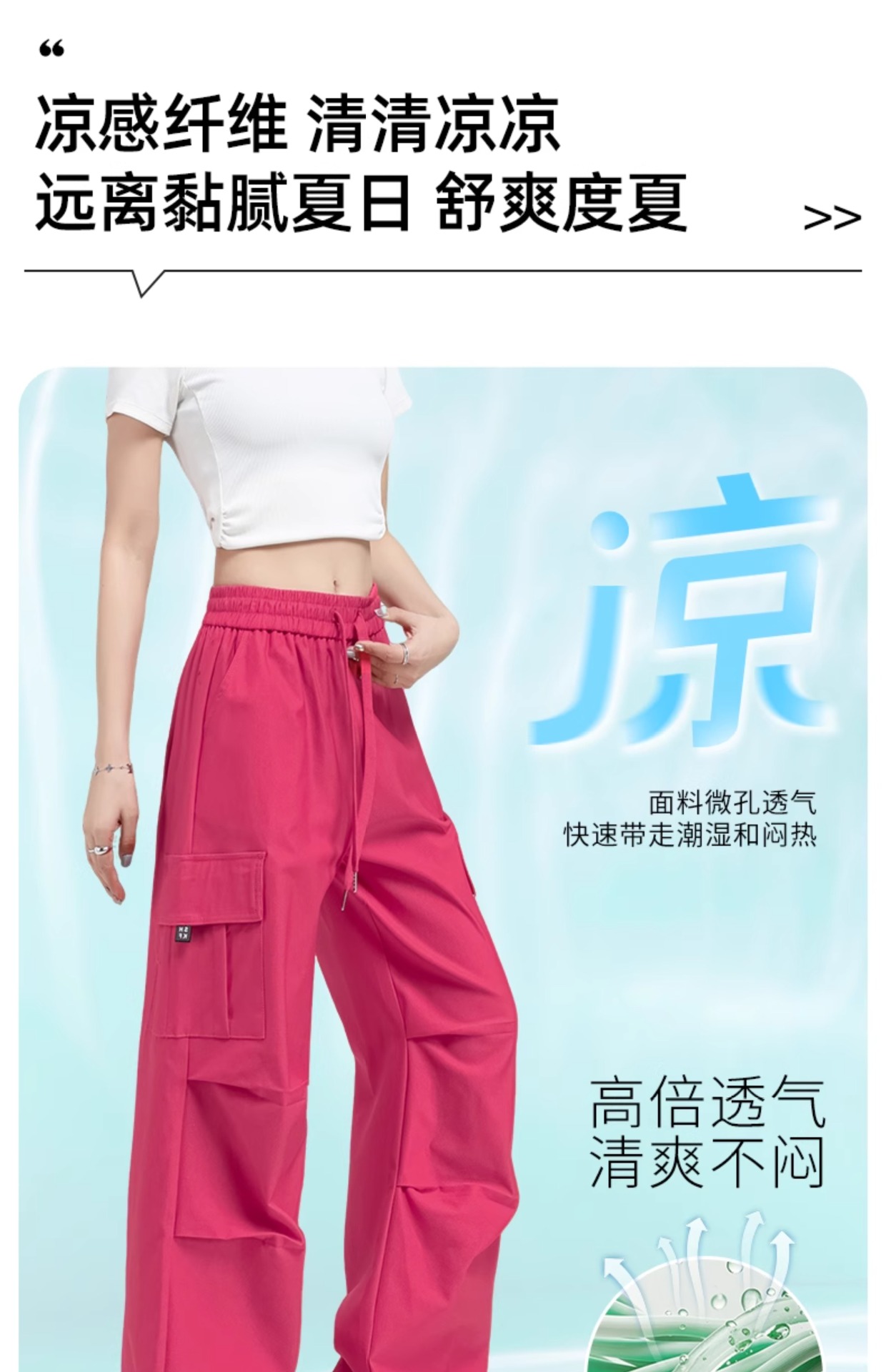 로즈 레드 작업복 여성 여름 얇은 2025 새로운 공수 아메리칸 스타일 속건성 아이스 실크 등산 와이드 레그 스포츠 바지스토어 가기