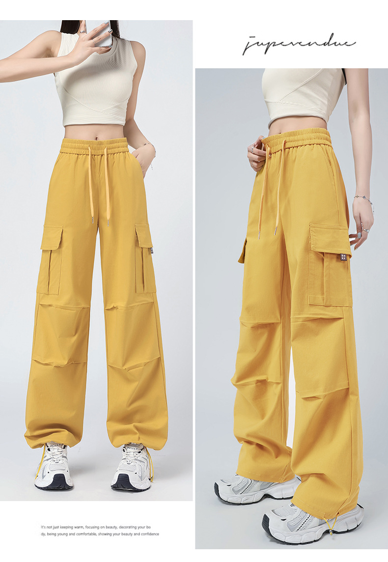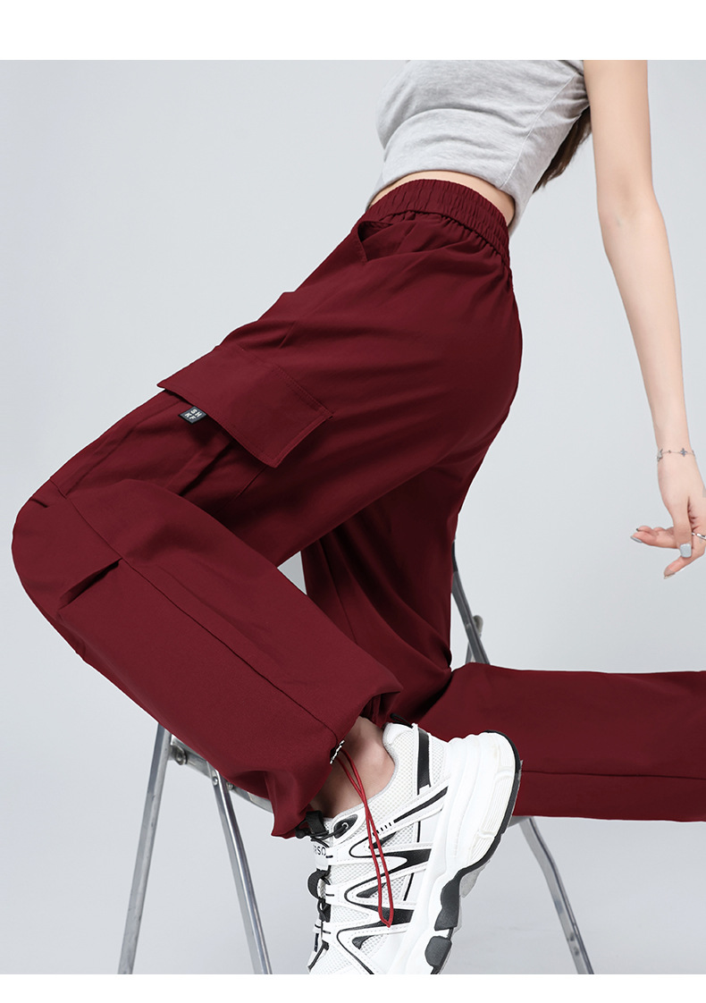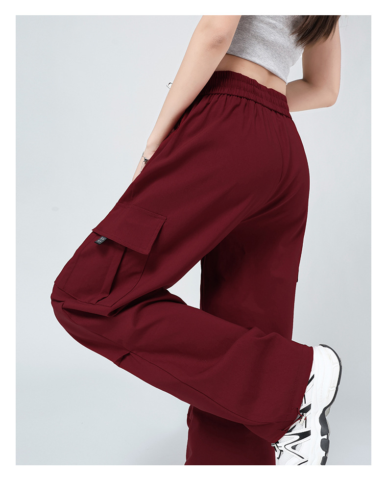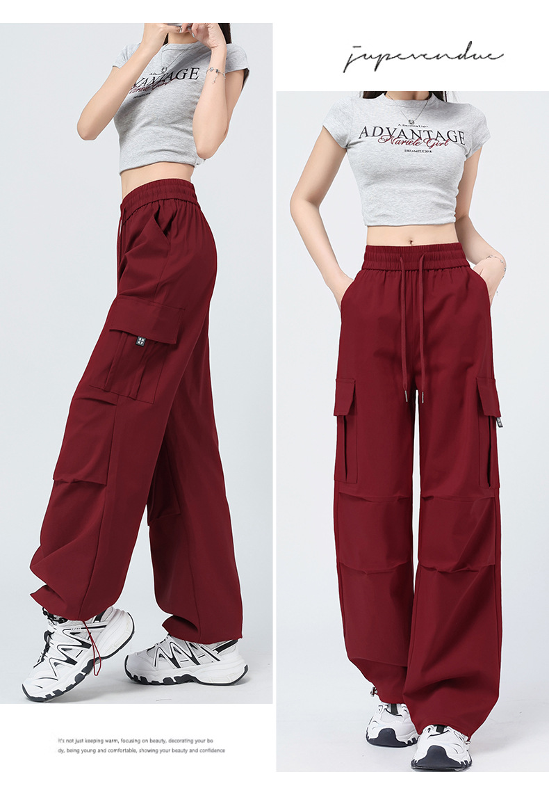 로즈 레드 작업복 여성 여름 얇은 2025 새로운 공수 아메리칸 스타일 속건성 아이스 실크 등산 와이드 레그 스포츠 바지