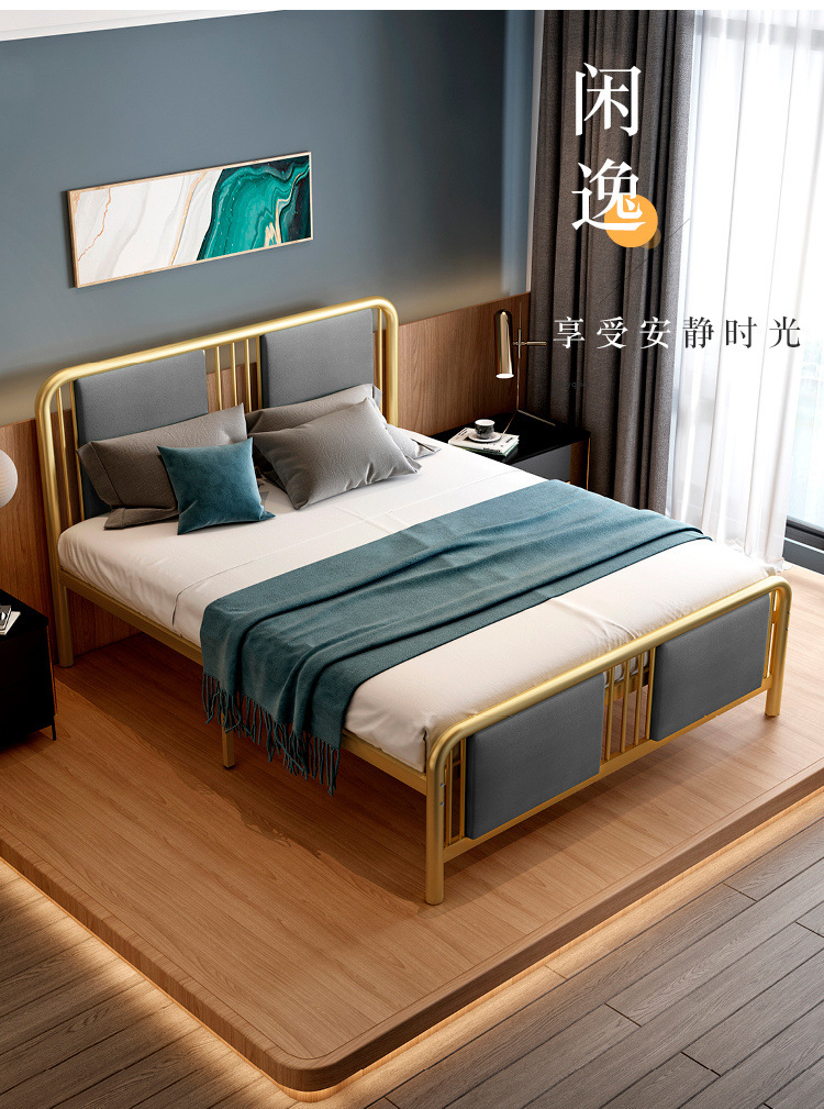 현대 미니멀리스트 라이트 럭셔리 새로운 중국 스타일 철 침대 1.38m 골드 소프트 등받이 철 침대 프레임 금속 더블 철 침대스토어 가기