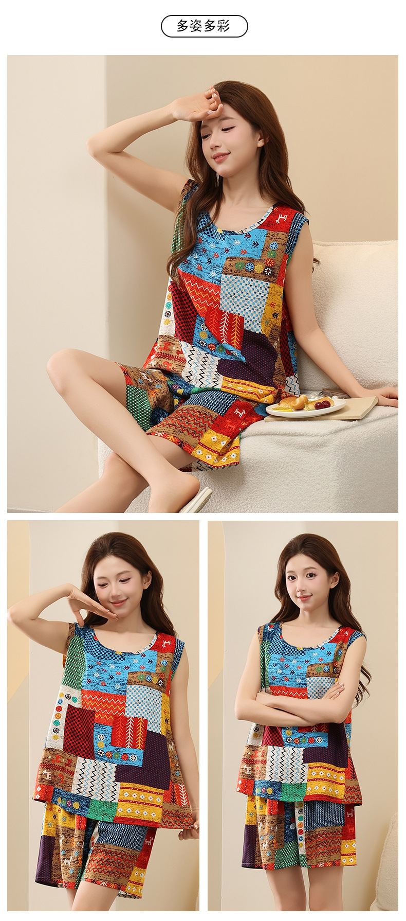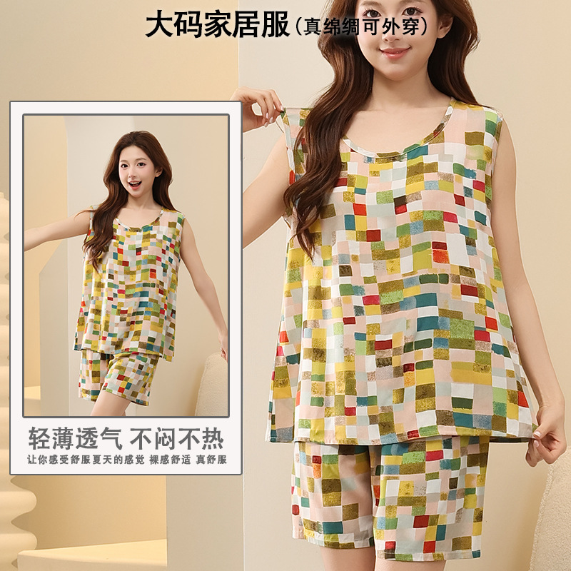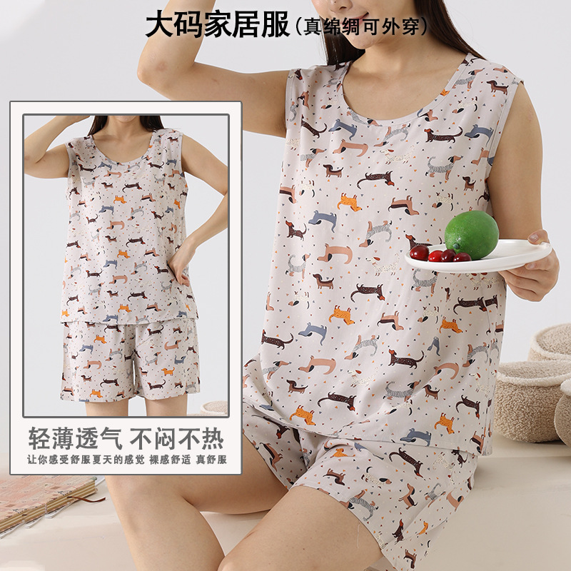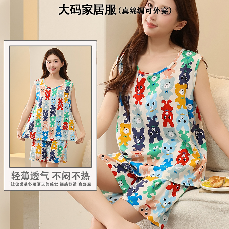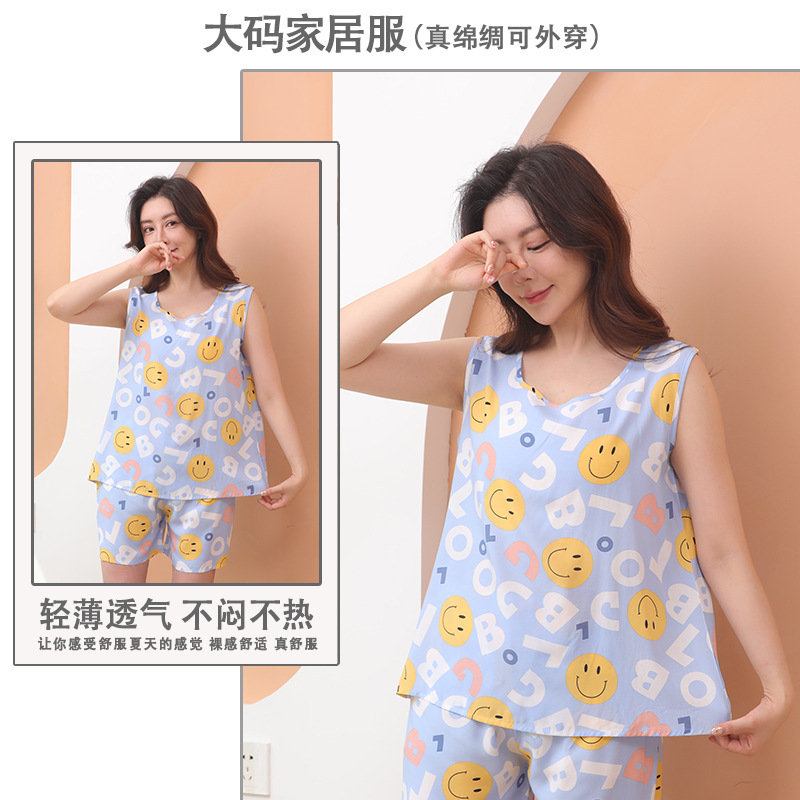 여성을위한 면 실크 잠옷 여름 얇은 민소매 조끼 반바지 투피스 양복 대형 느슨한 인공 면화 가정 의류
