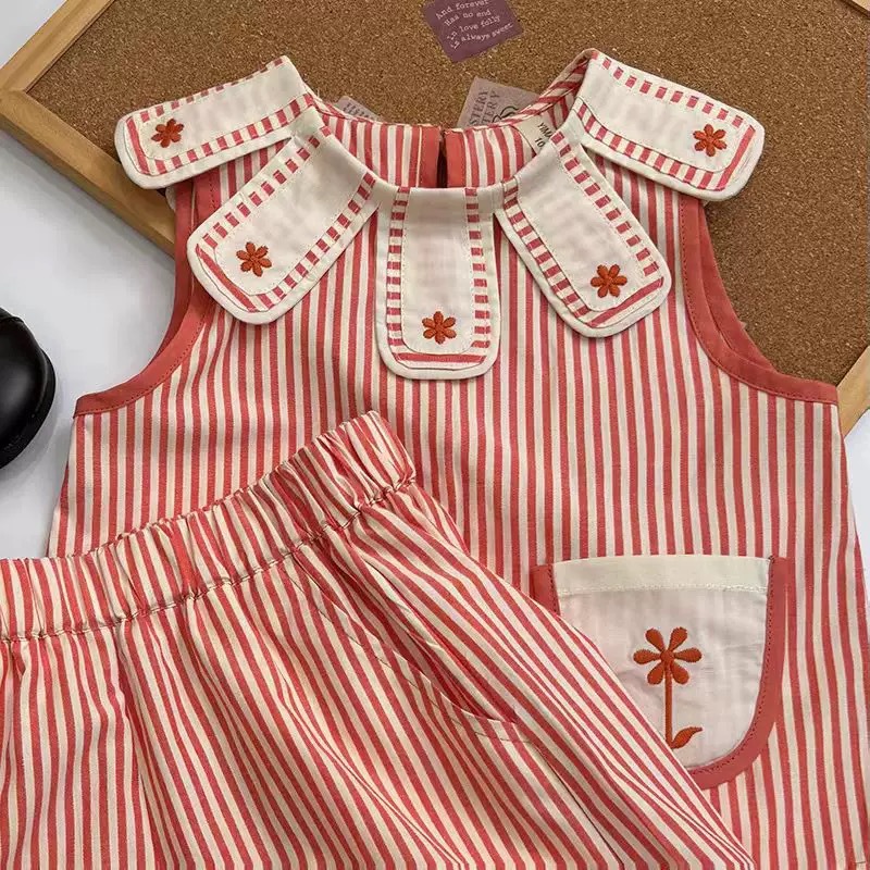 여자 여름 새 조끼 정장 아기 소녀 줄무늬 꽃잎 칼라 민소매 인형 셔츠 순수 코튼 반바지 투피스 유행 세트