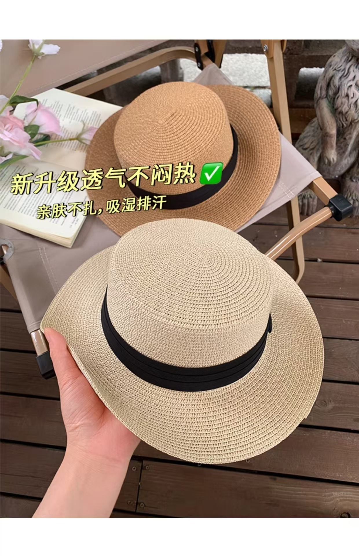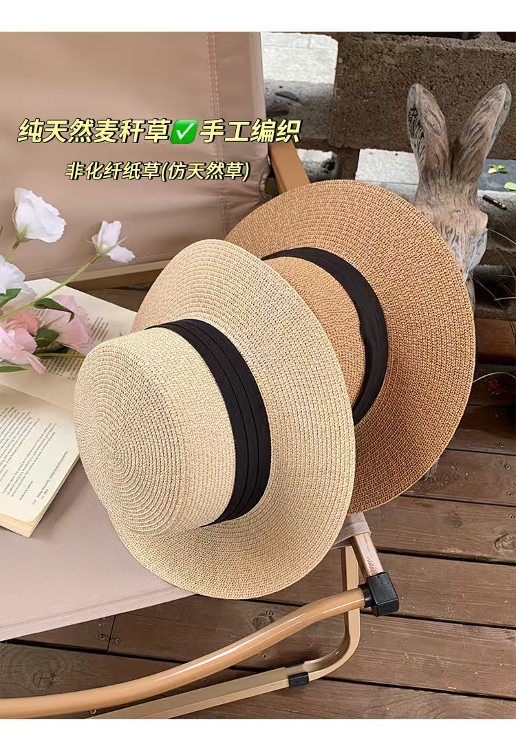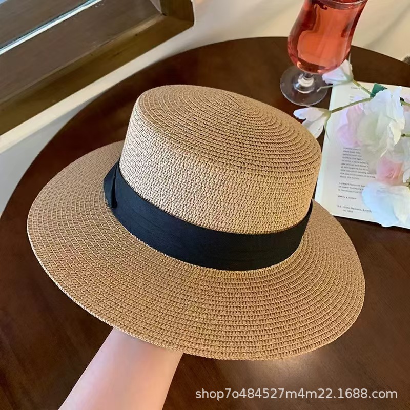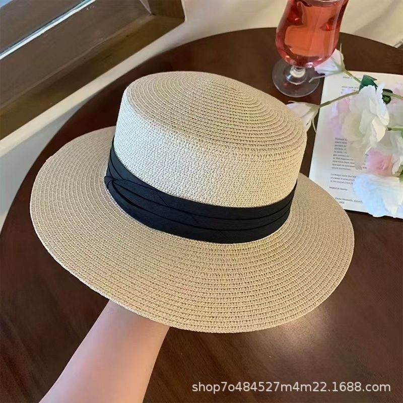 여성을위한 프랑스 복고풍 밀짚 모자 여름 2024 새로운 야외 대형 챙 태양 보호 플랫 탑 태양 모자스토어 가기
