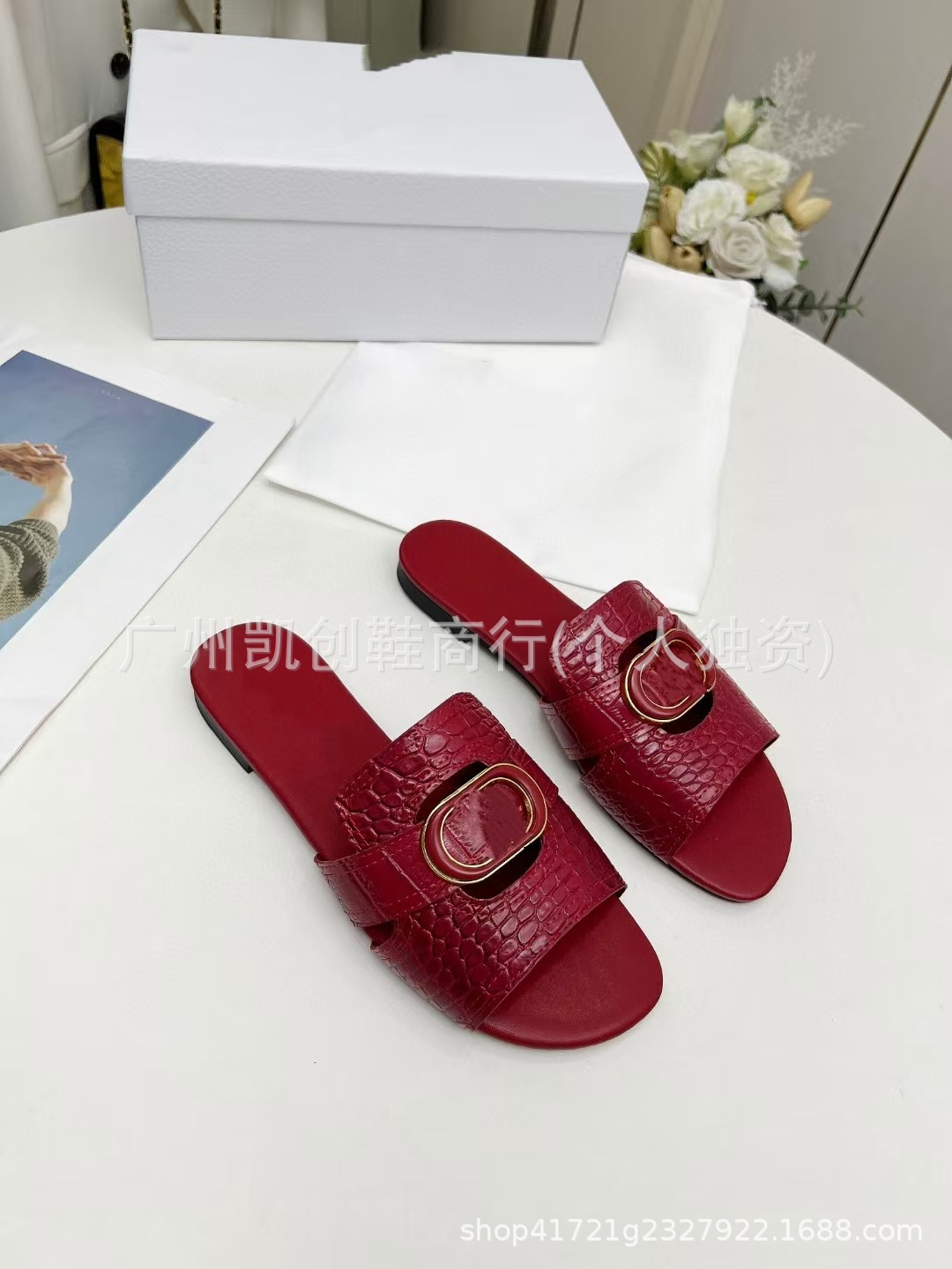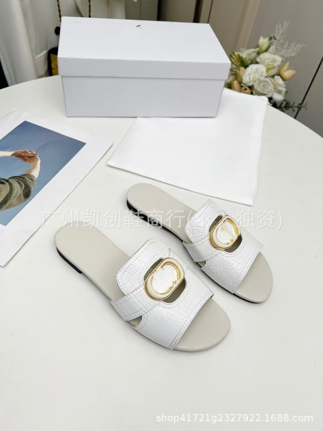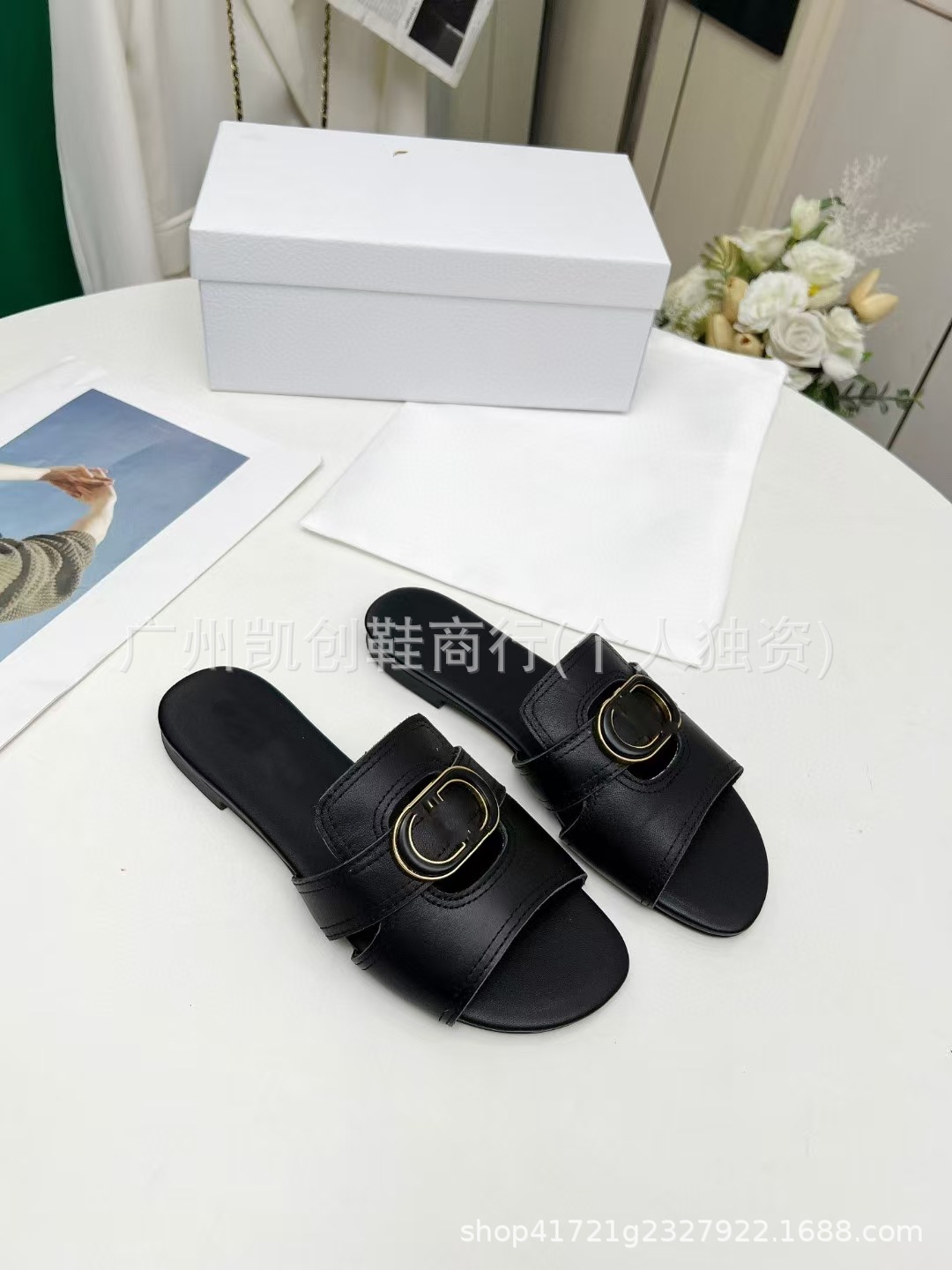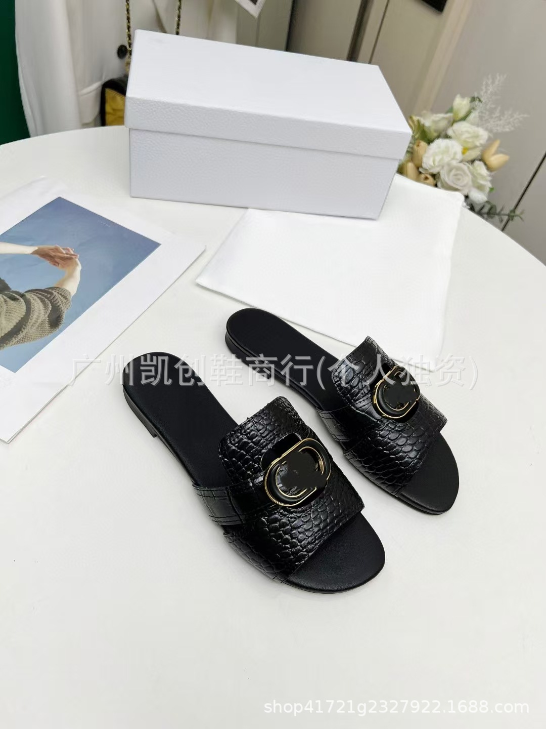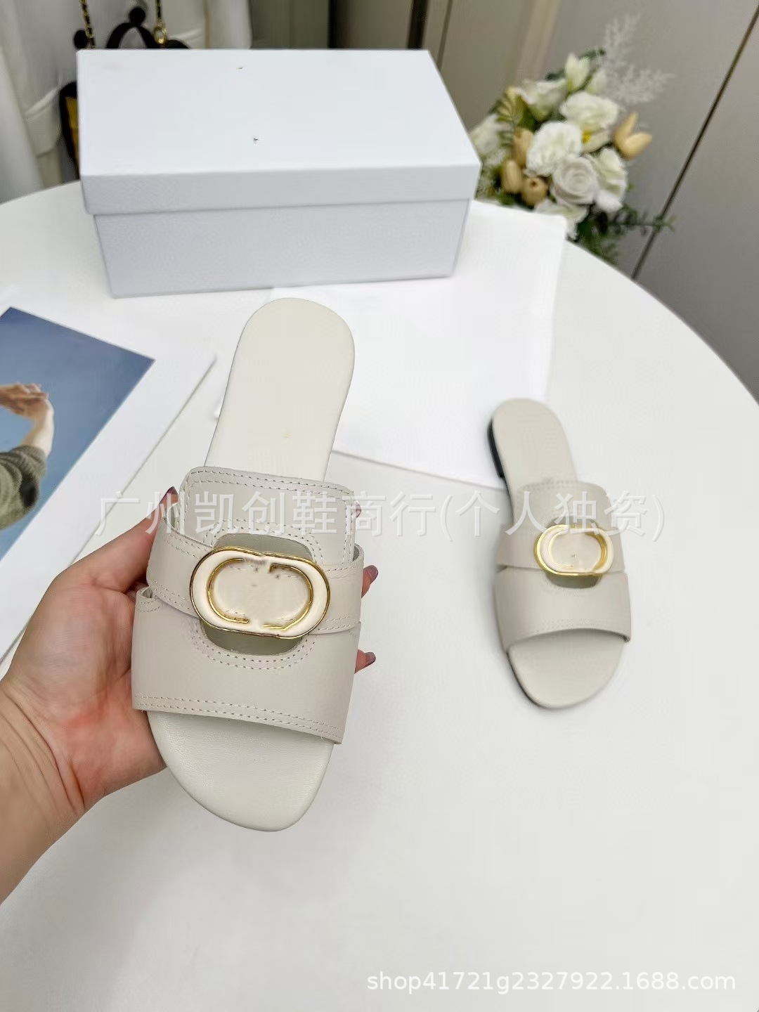 대외 무역 2025 여름 여성용 프렌치 메탈 레터 슬리퍼 새로운 플랫 오픈 토우 대형 샌들스토어 가기
