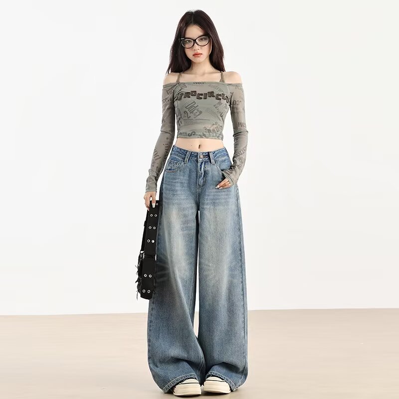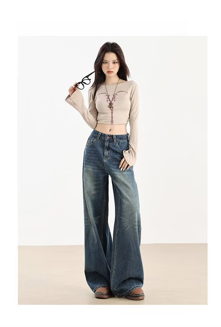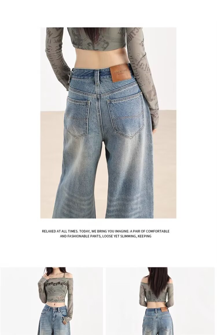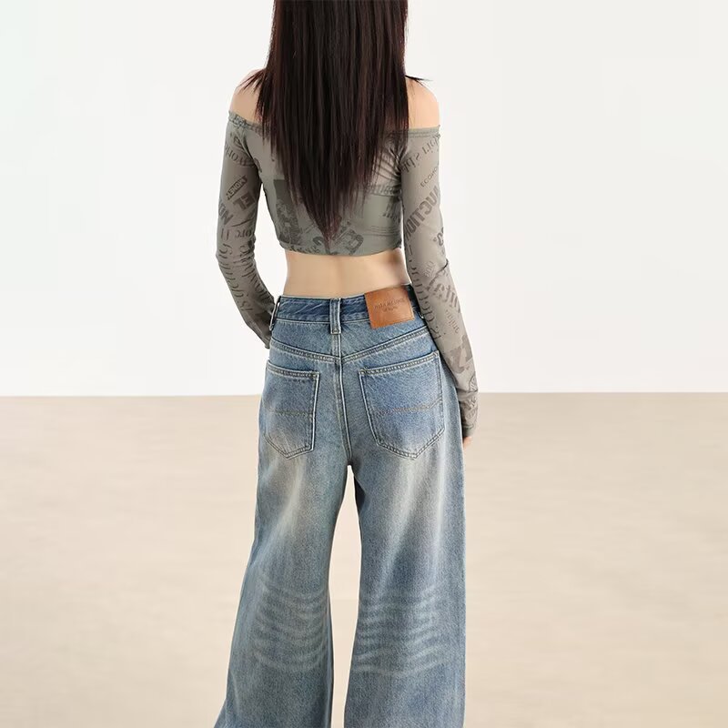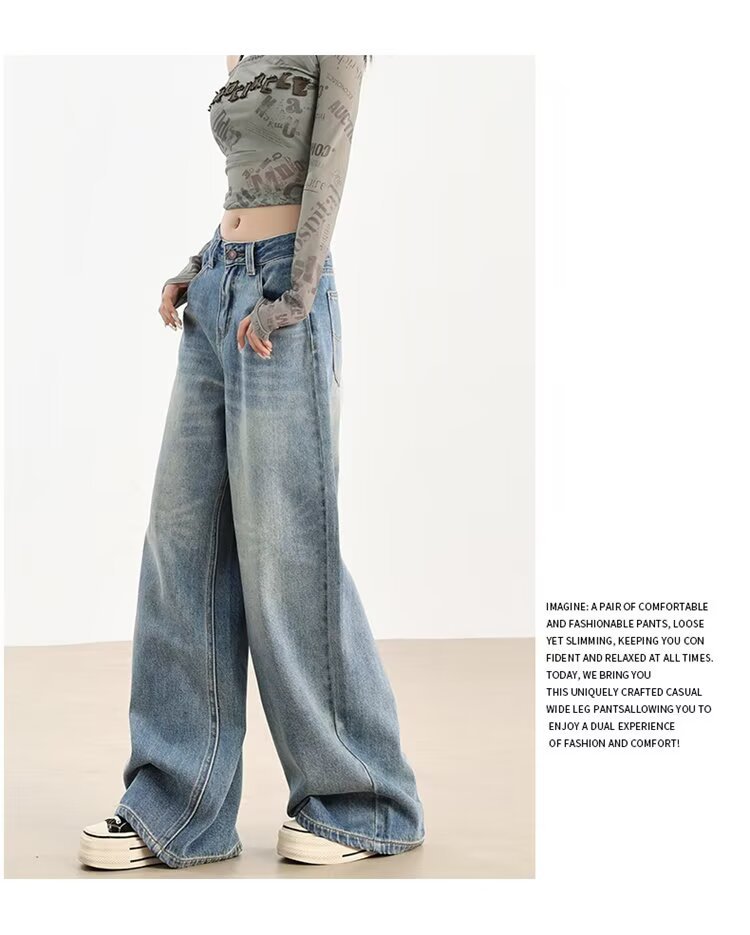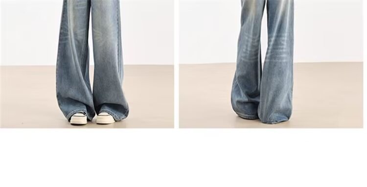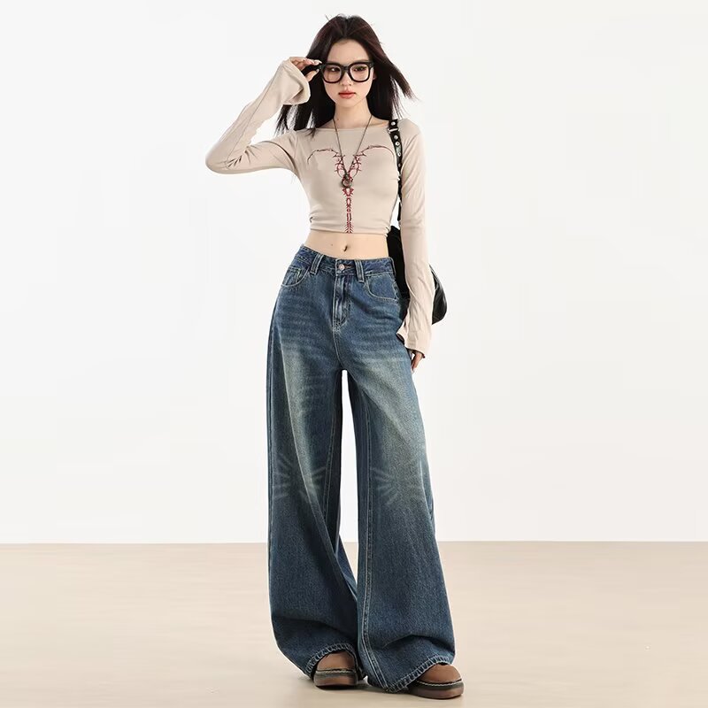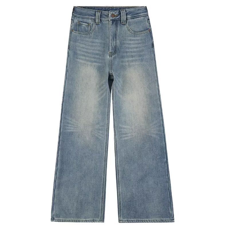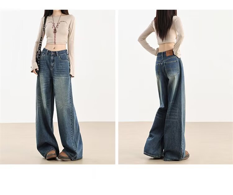 가을 겨울용 아메리칸 와이드 레그 청바지, 와이드 레그, 루즈, 슈퍼 슬림, 하이 웨이스트, 겨울용 여성용 헤비 워싱 패턴 청바지스토어 가기