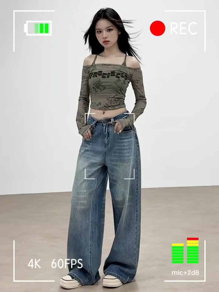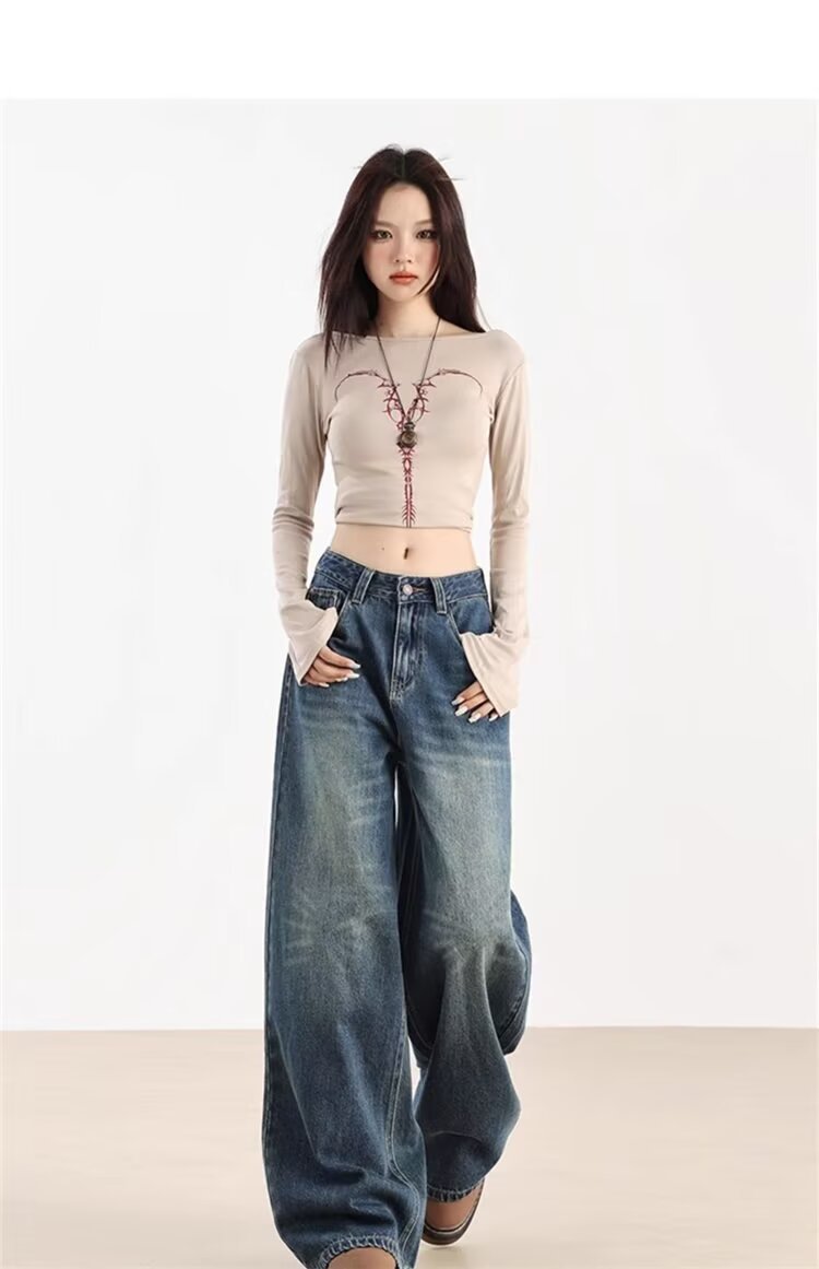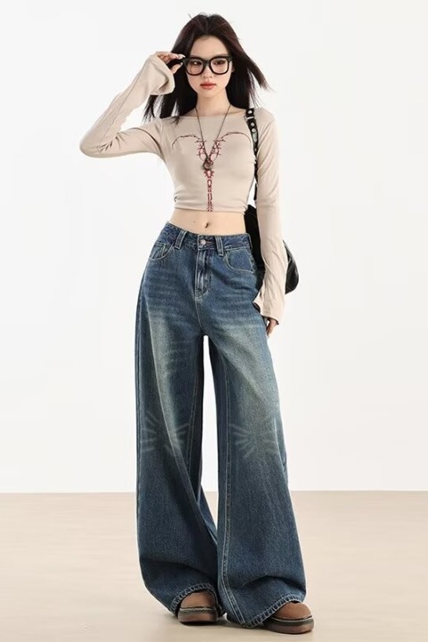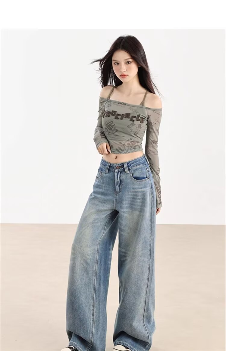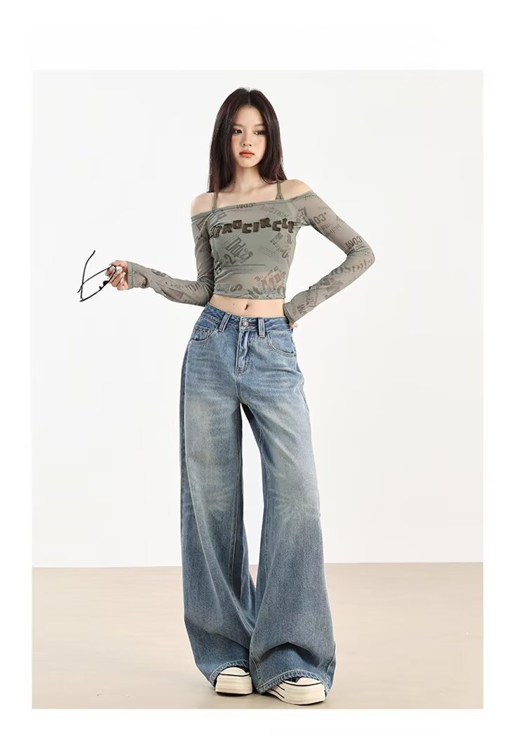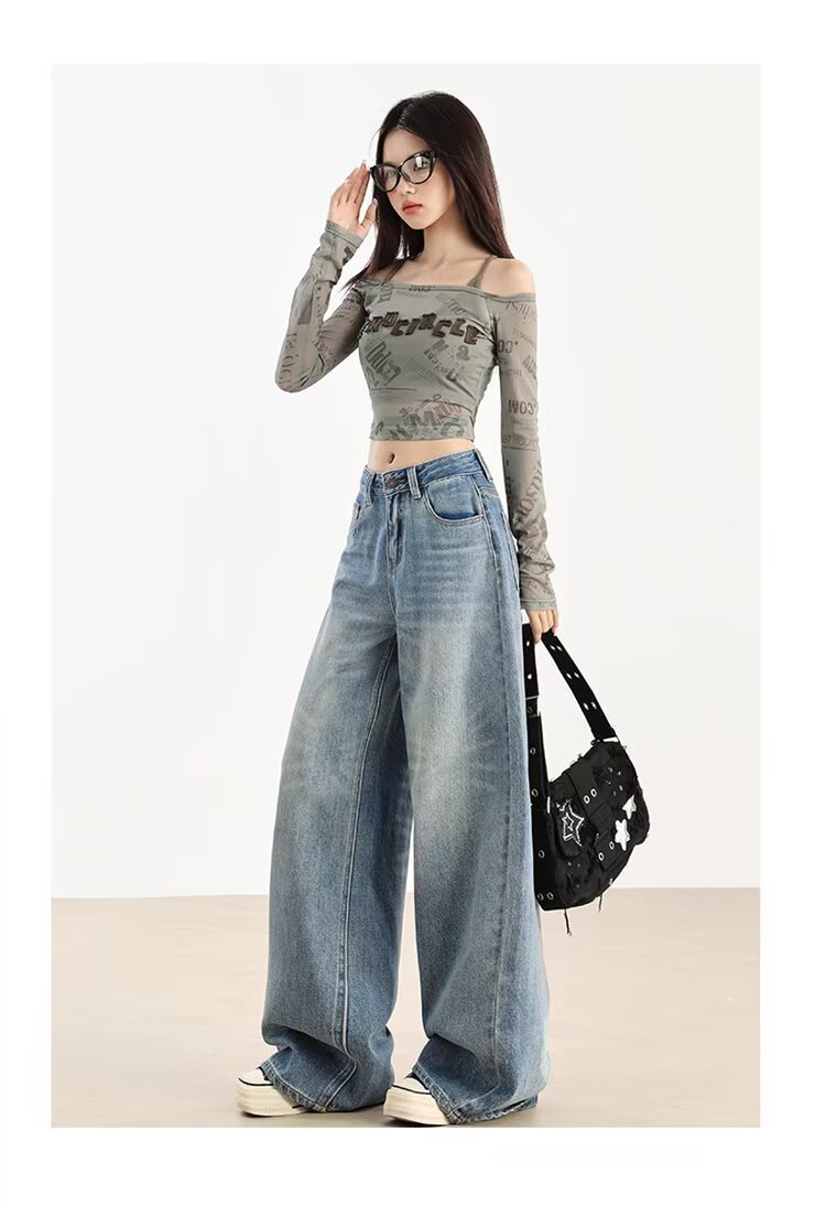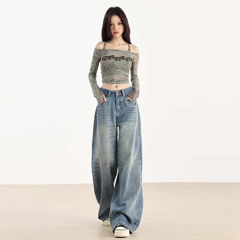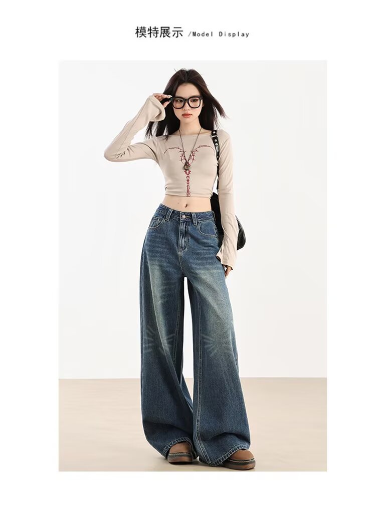 가을 겨울용 아메리칸 와이드 레그 청바지, 와이드 레그, 루즈, 슈퍼 슬림, 하이 웨이스트, 겨울용 여성용 헤비 워싱 패턴 청바지스토어 가기