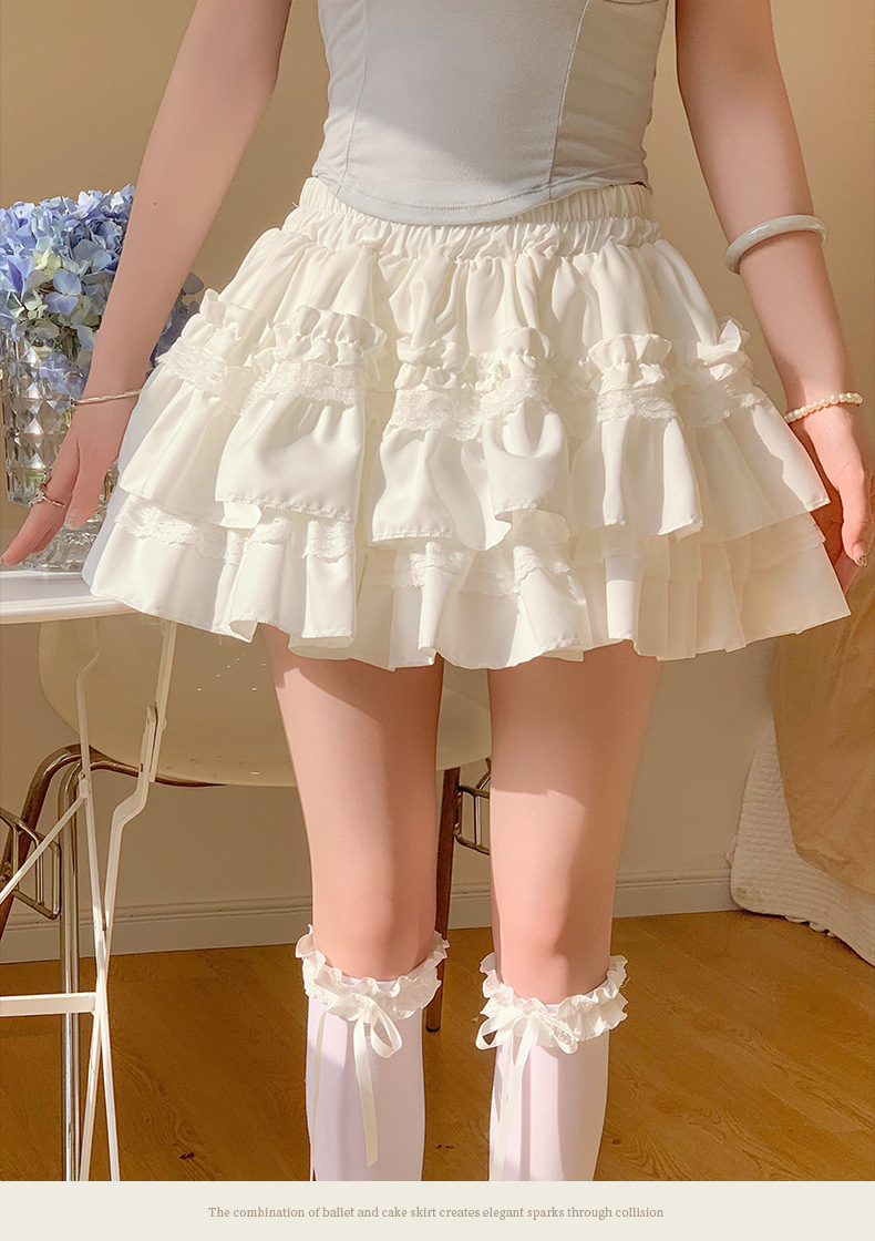 화이트 레이스 케이크 투투 스커트 여성용 스위트 스커트 A 라인 스커트 하이 웨이스트 슬리밍 노출 방지 발레 스타일 스커트