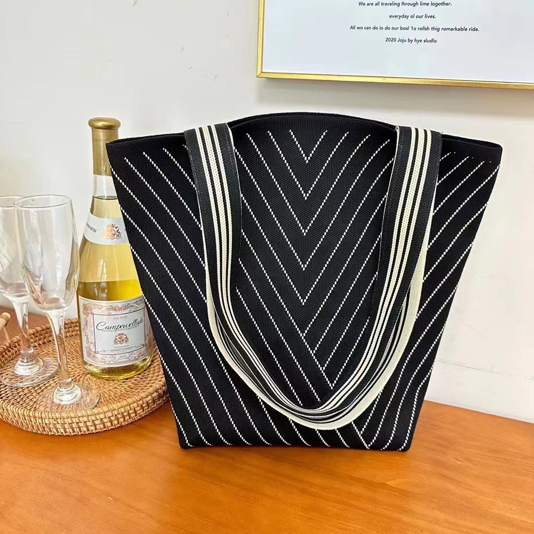 간단한 올 매치 흑백 모양의 줄무늬 어깨 가방 유행 도시 아름다움 여성을위한 대용량 짠 가방