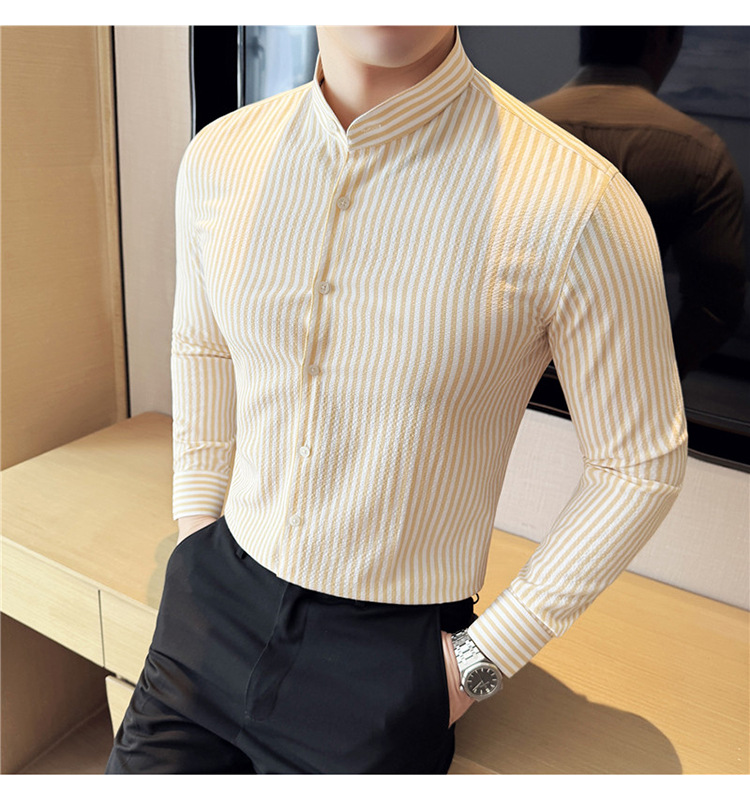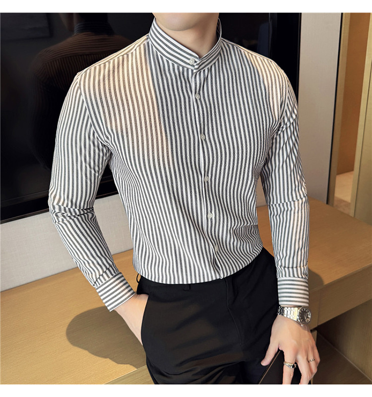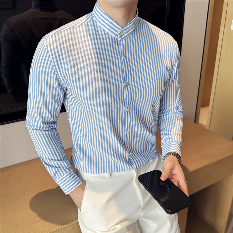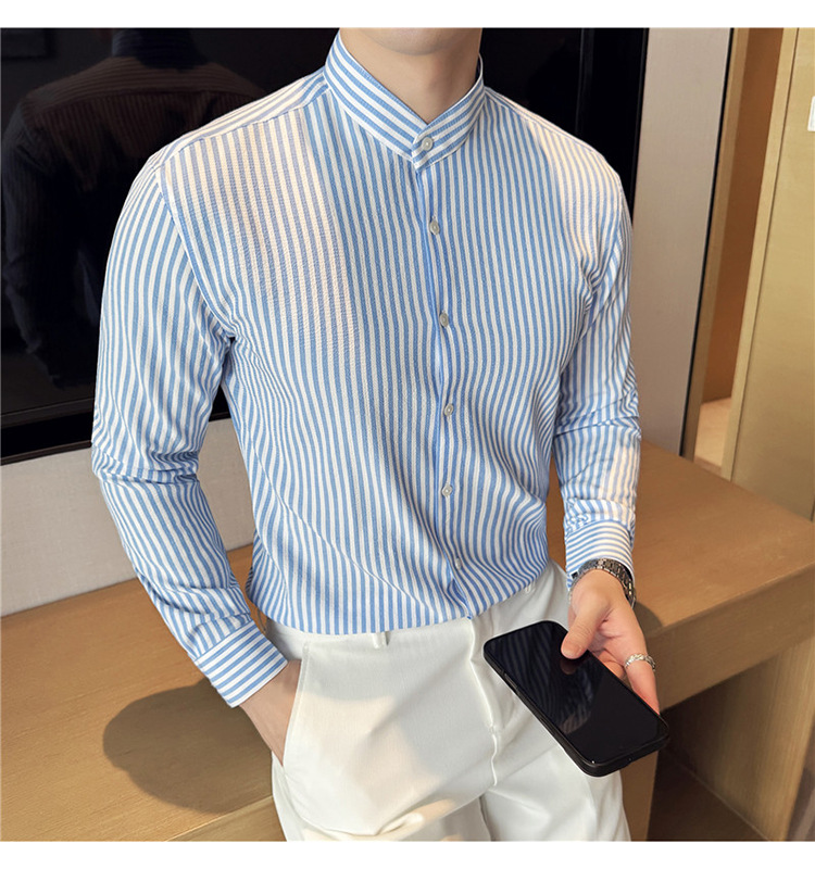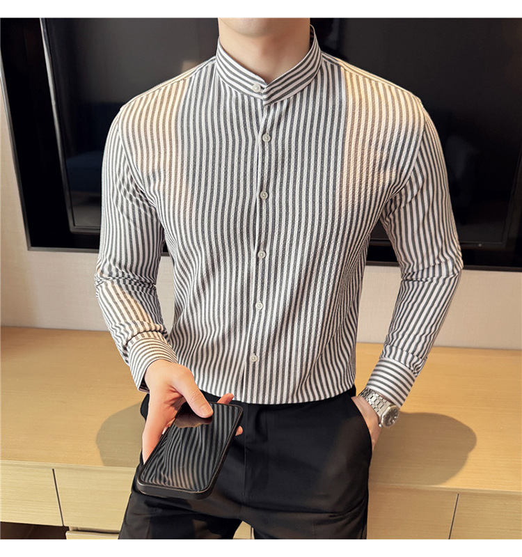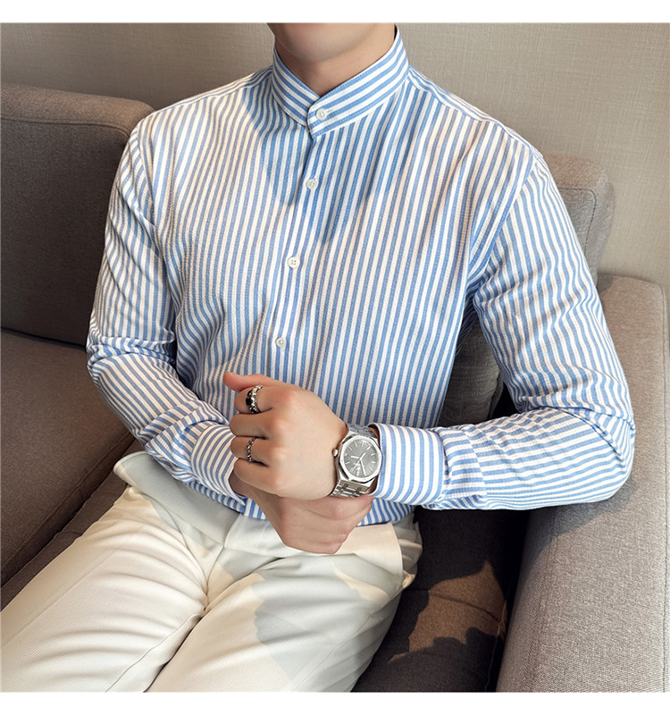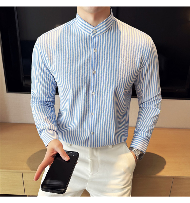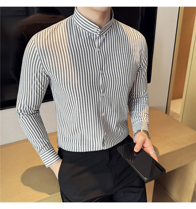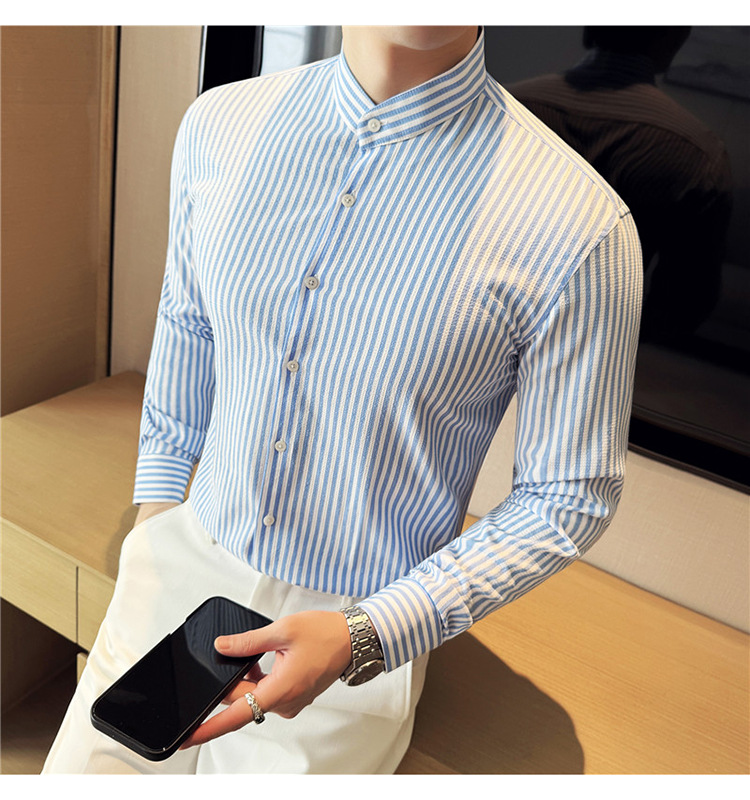 남성용 새로운 중국 스타일 캐주얼 스트라이프 긴팔 셔츠 슬림 한국 스타일 라이트 비즈니스 남성 전문 셔츠 시어서커 ​​크로스보더