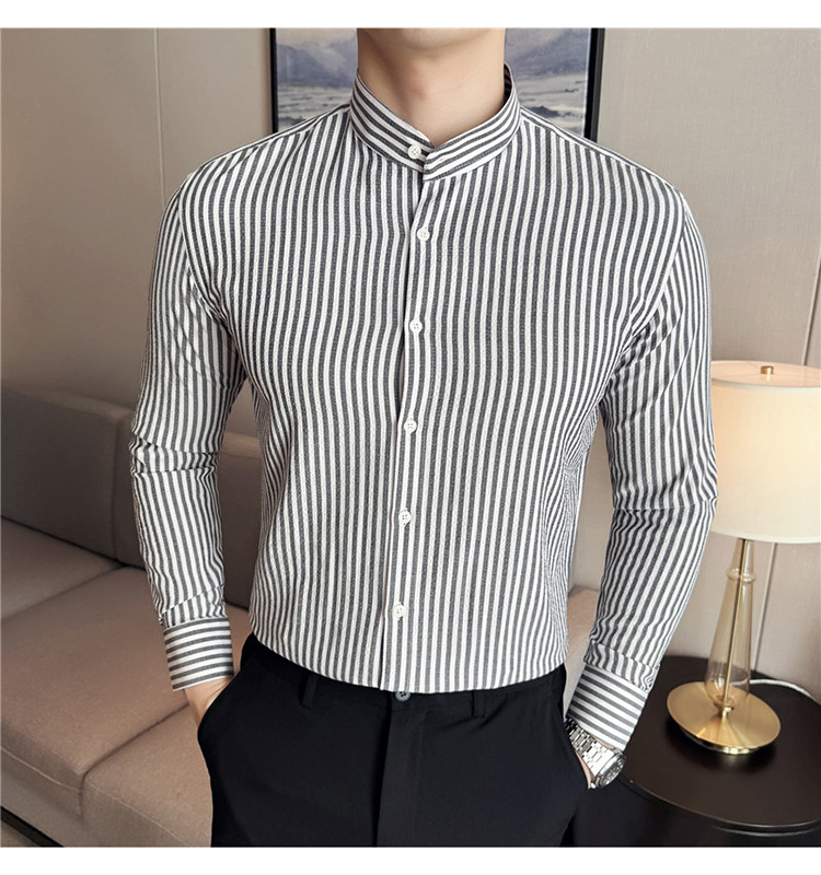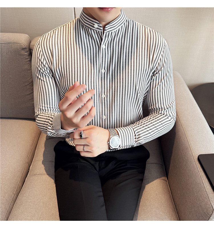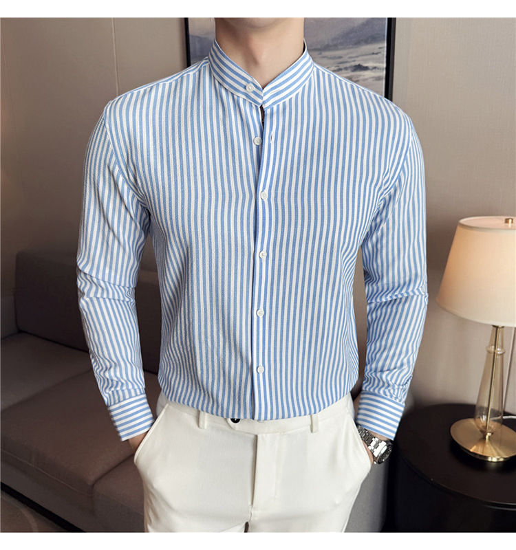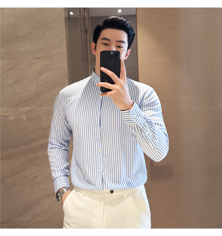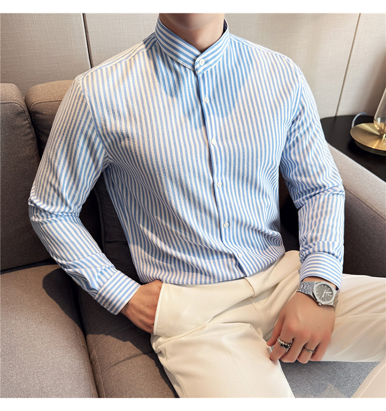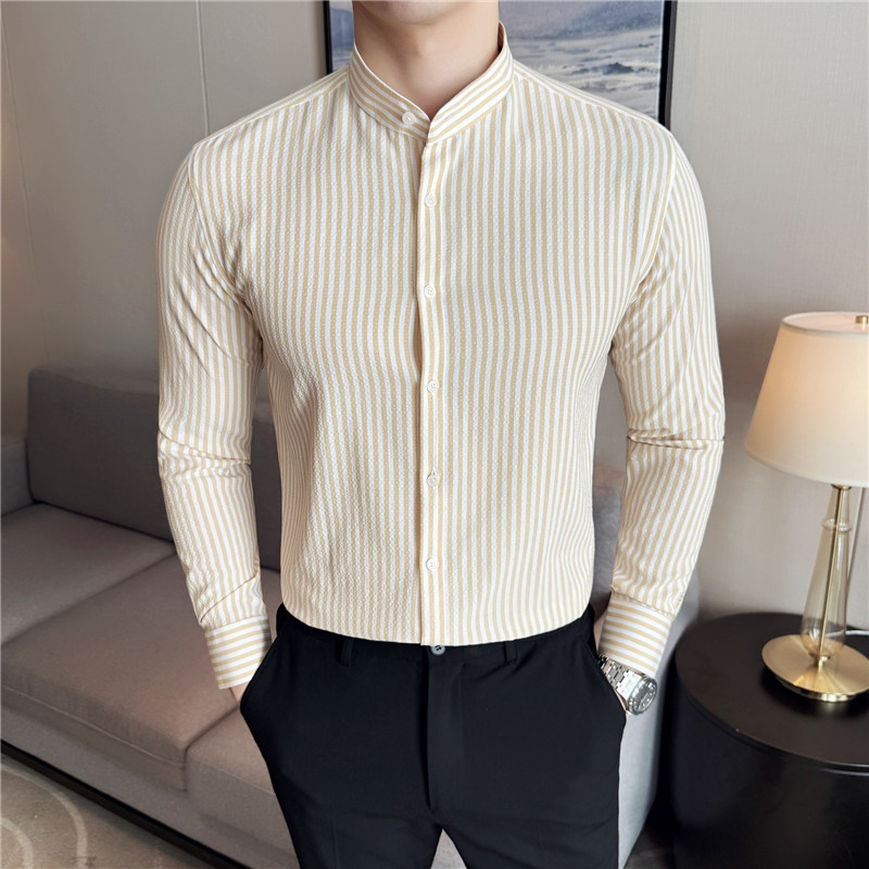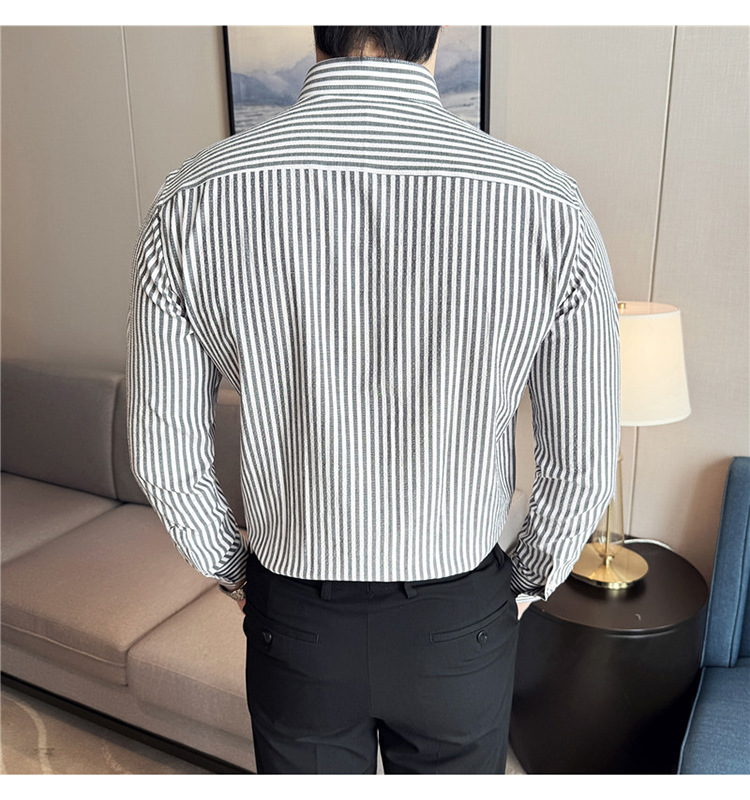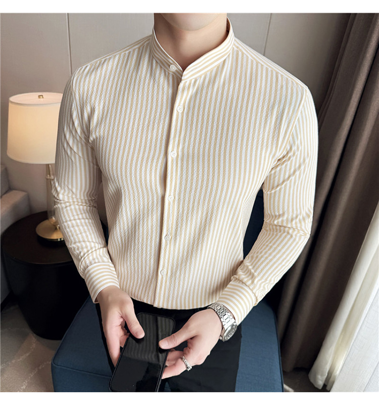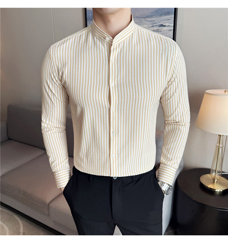 남성용 새로운 중국 스타일 캐주얼 스트라이프 긴팔 셔츠 슬림 한국 스타일 라이트 비즈니스 남성 전문 셔츠 시어서커 ​​크로스보더