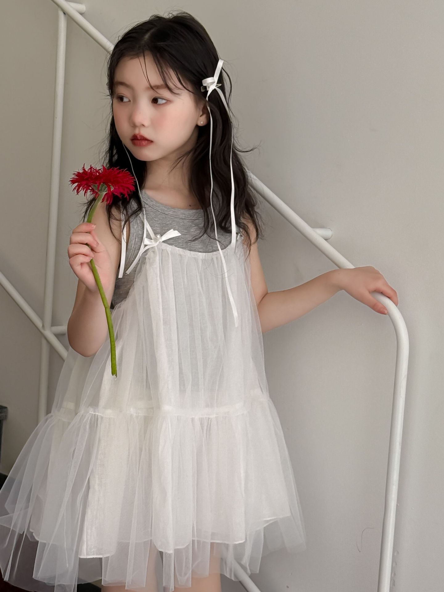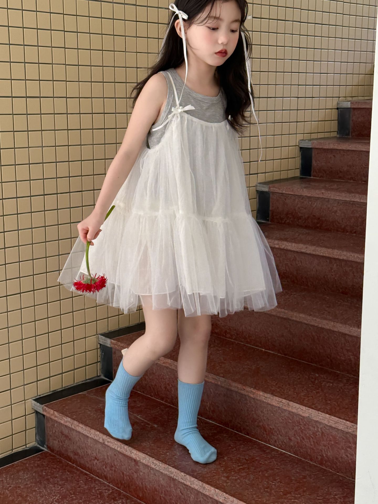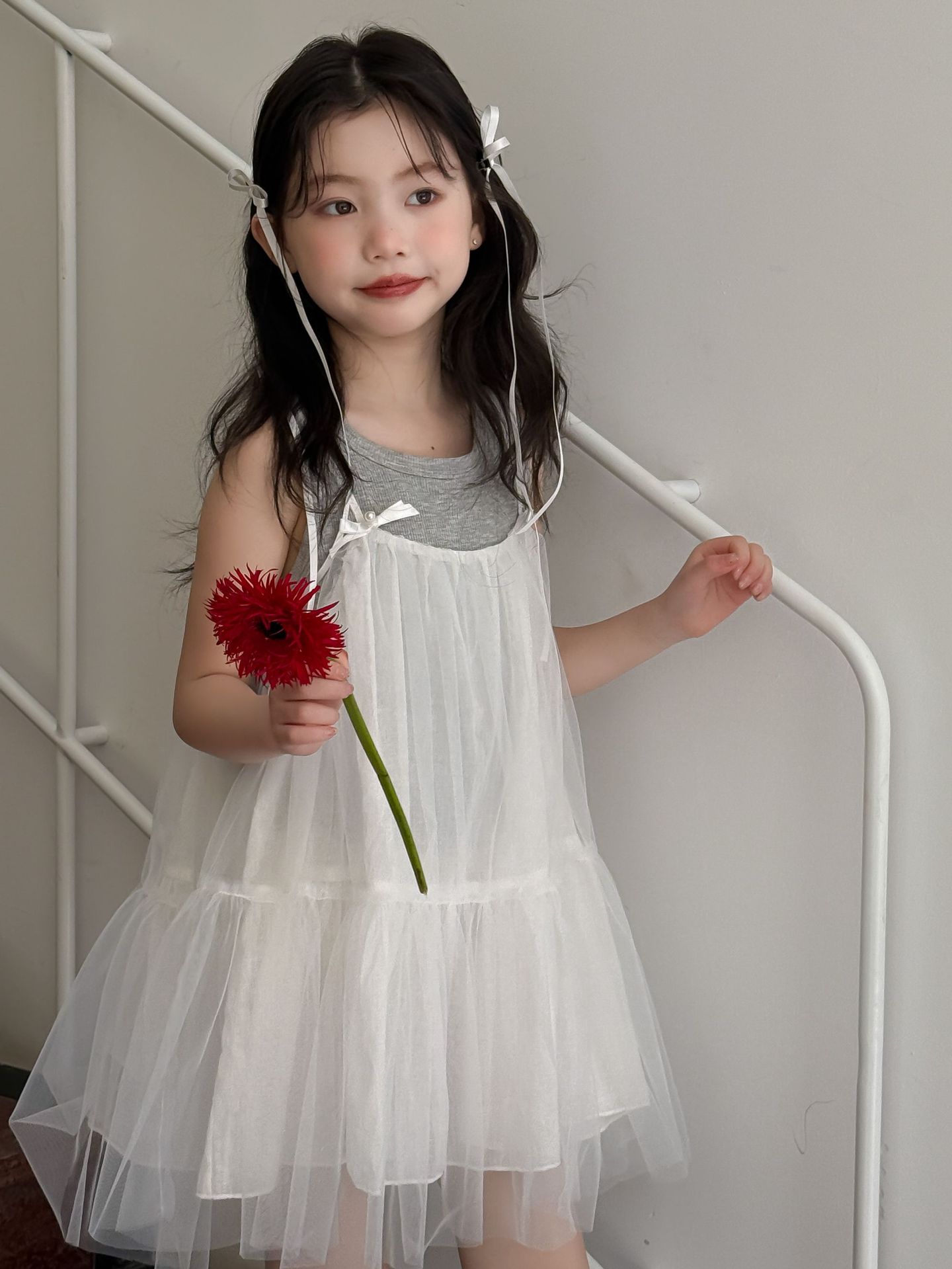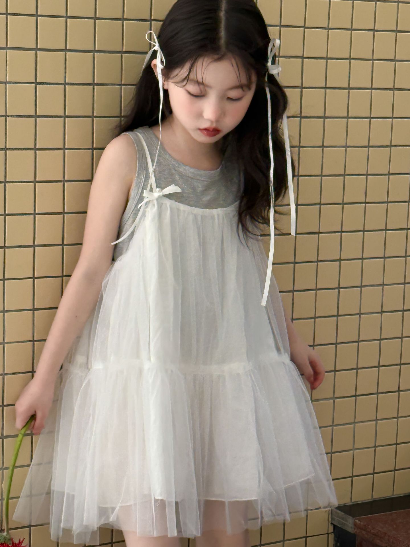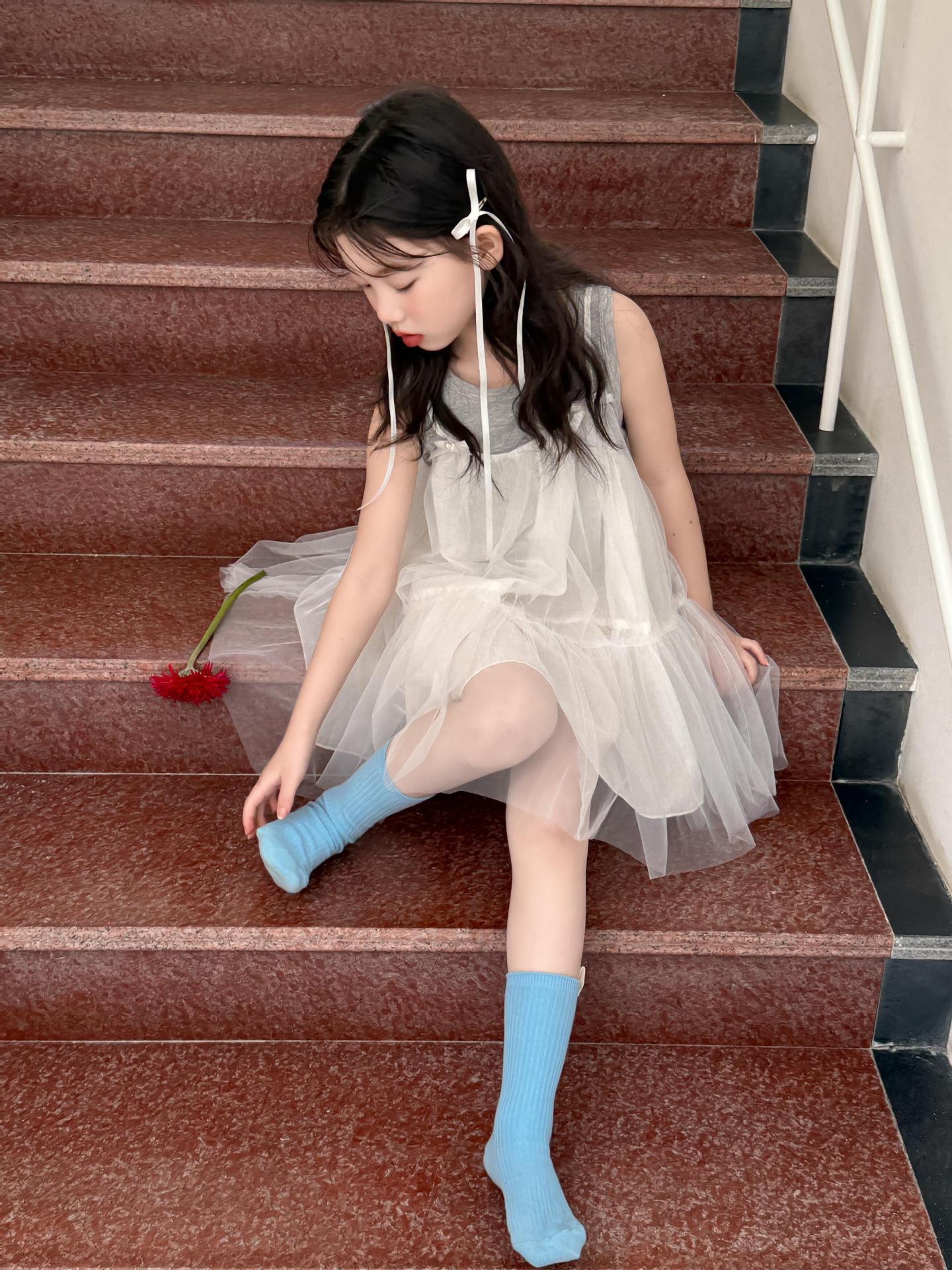 어린이 정장 2025 여름 소녀 민소매 조끼 활 서스펜더 흰색 거즈 스커트 투피스 세트 소녀 공주 스커트스토어 가기