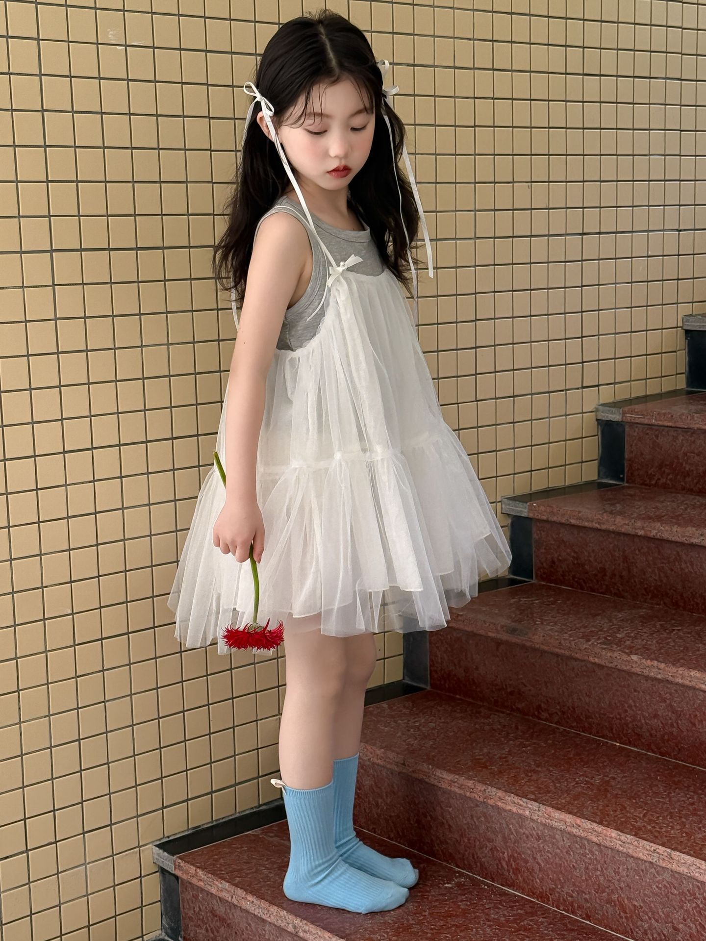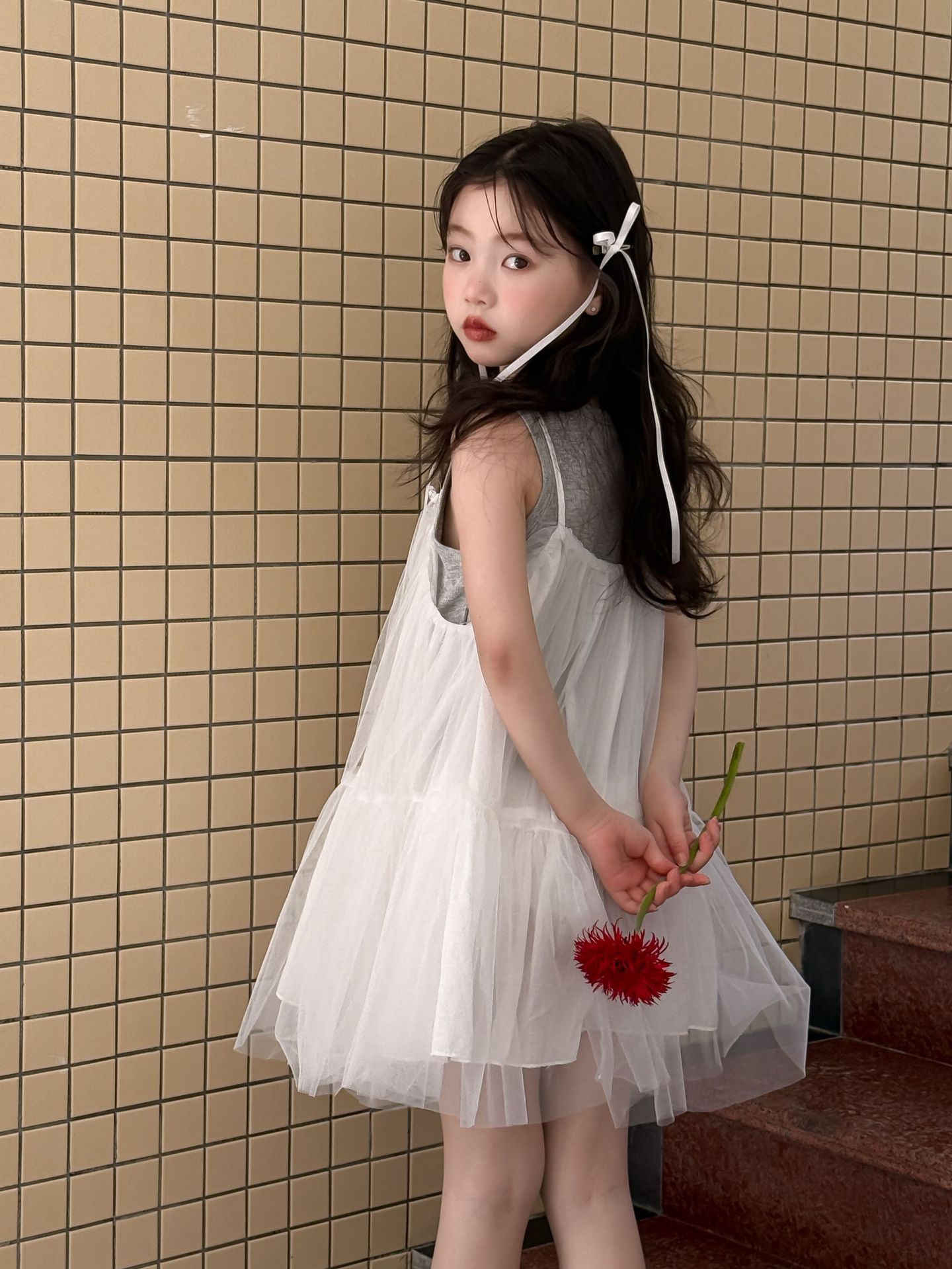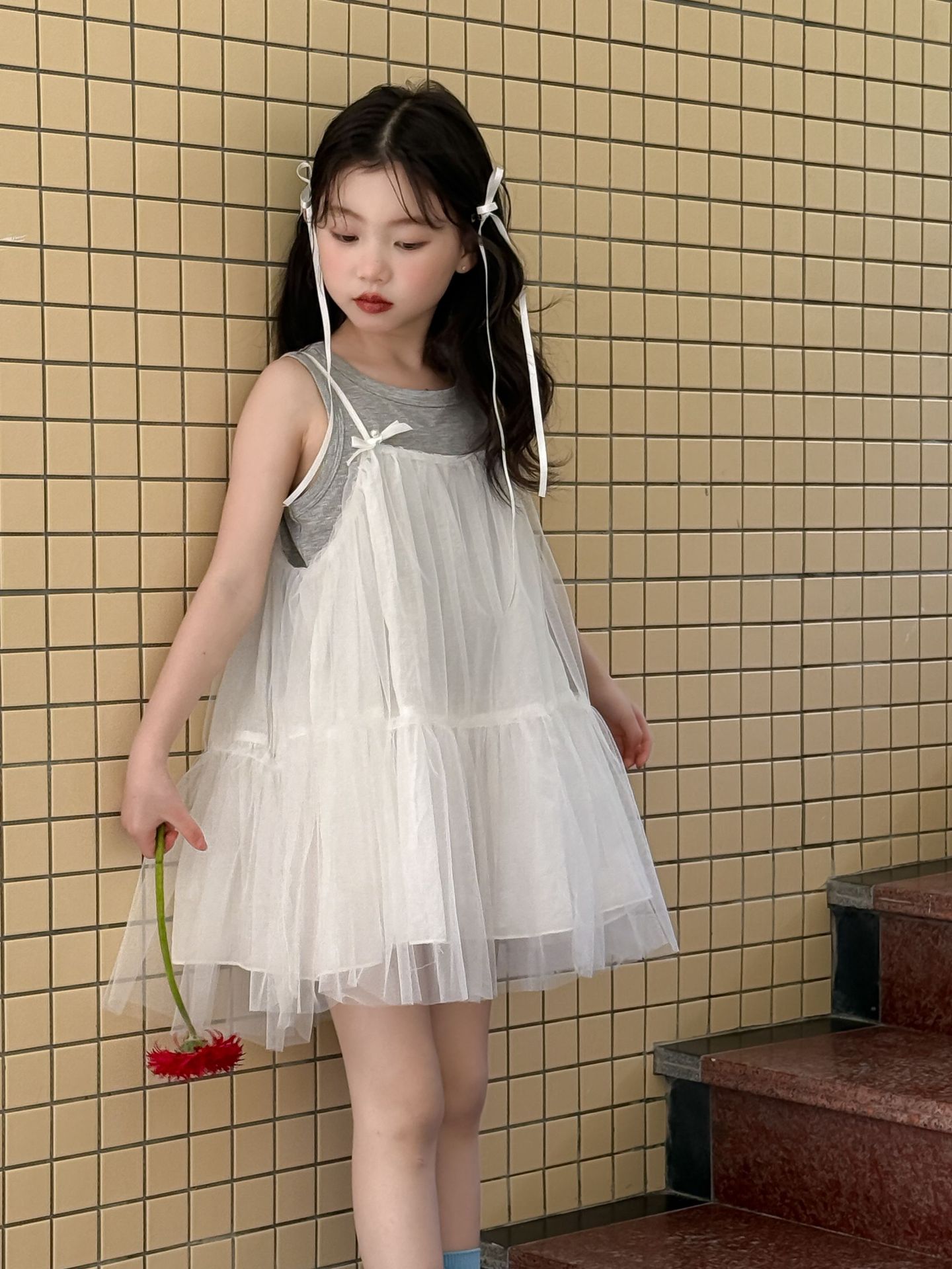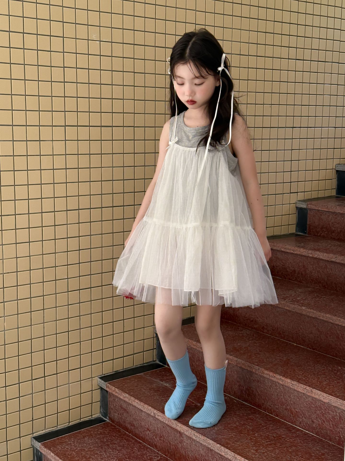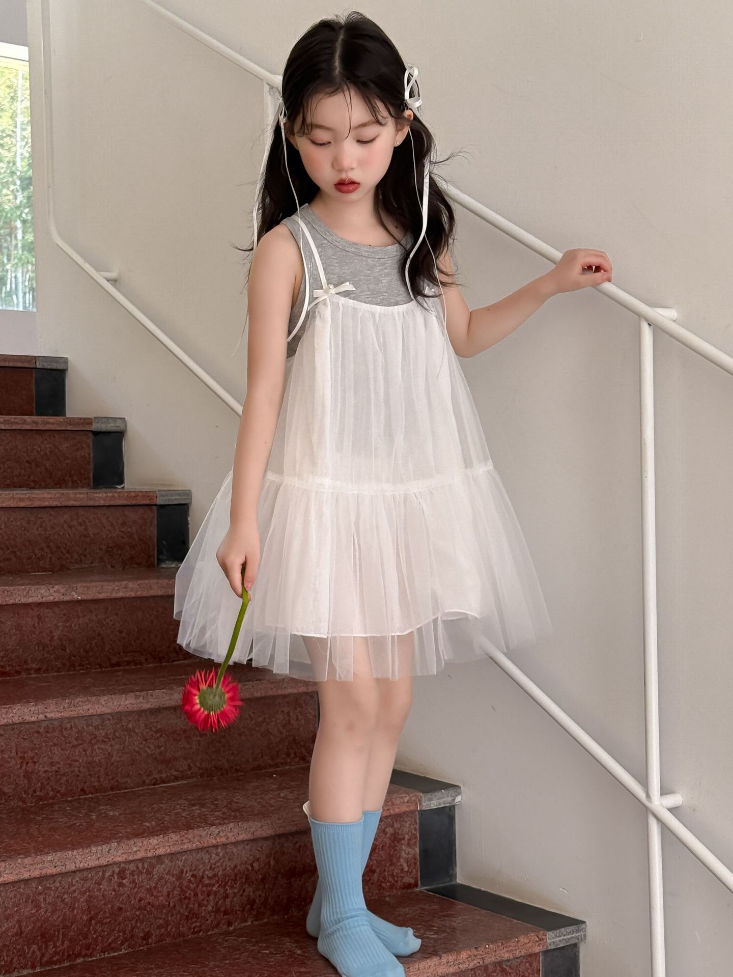 어린이 정장 2025 여름 소녀 민소매 조끼 활 서스펜더 흰색 거즈 스커트 투피스 세트 소녀 공주 스커트스토어 가기
