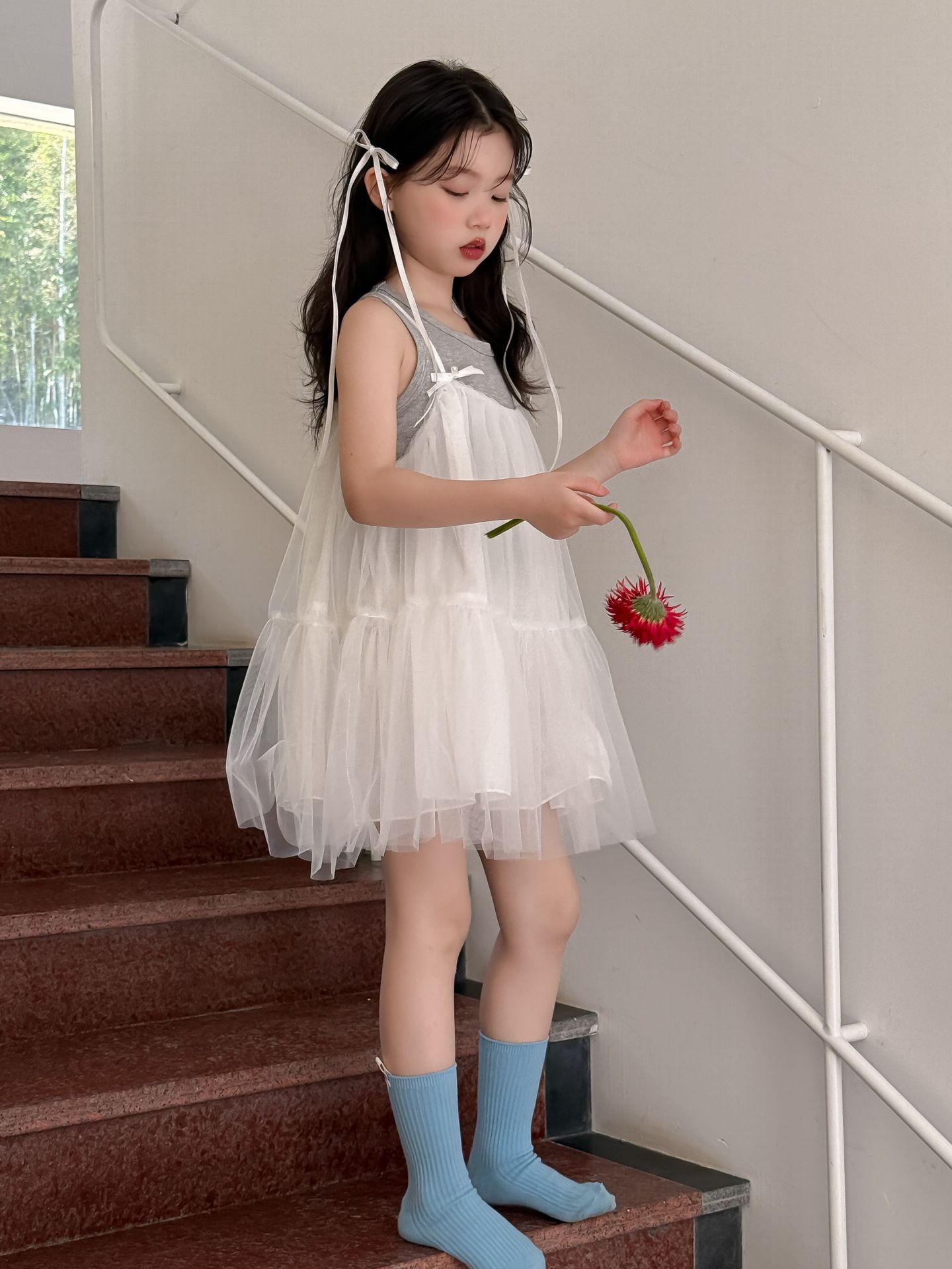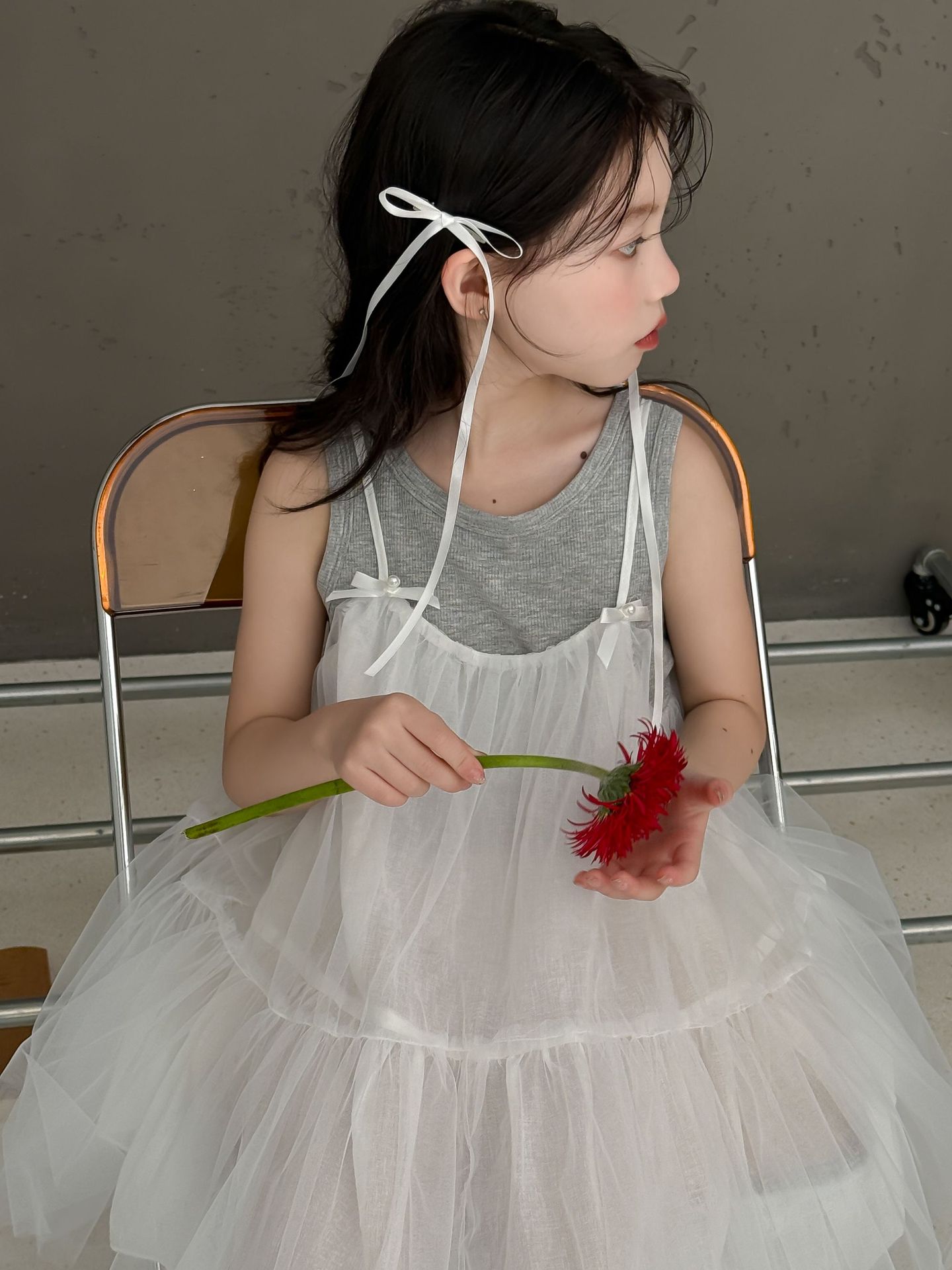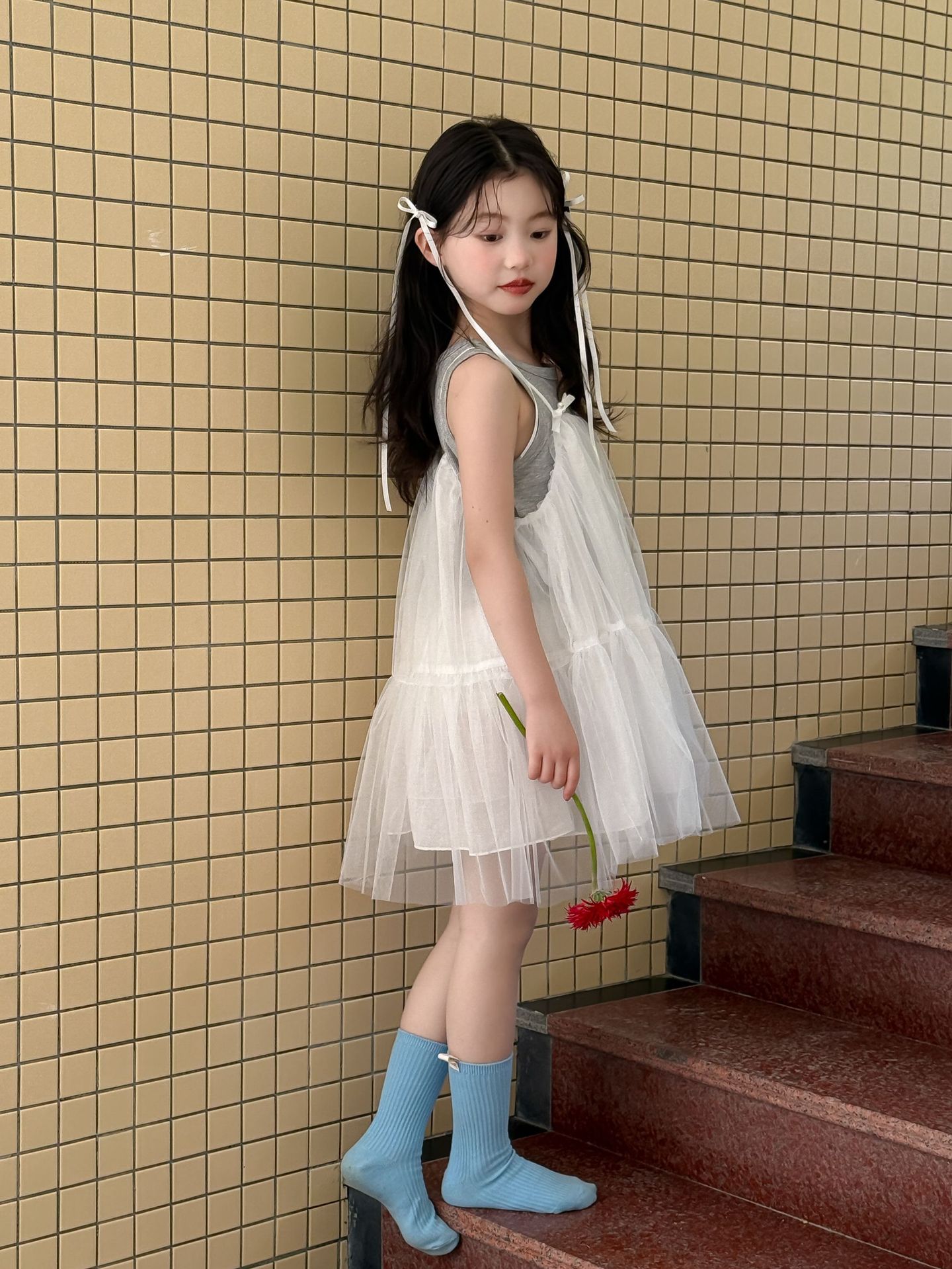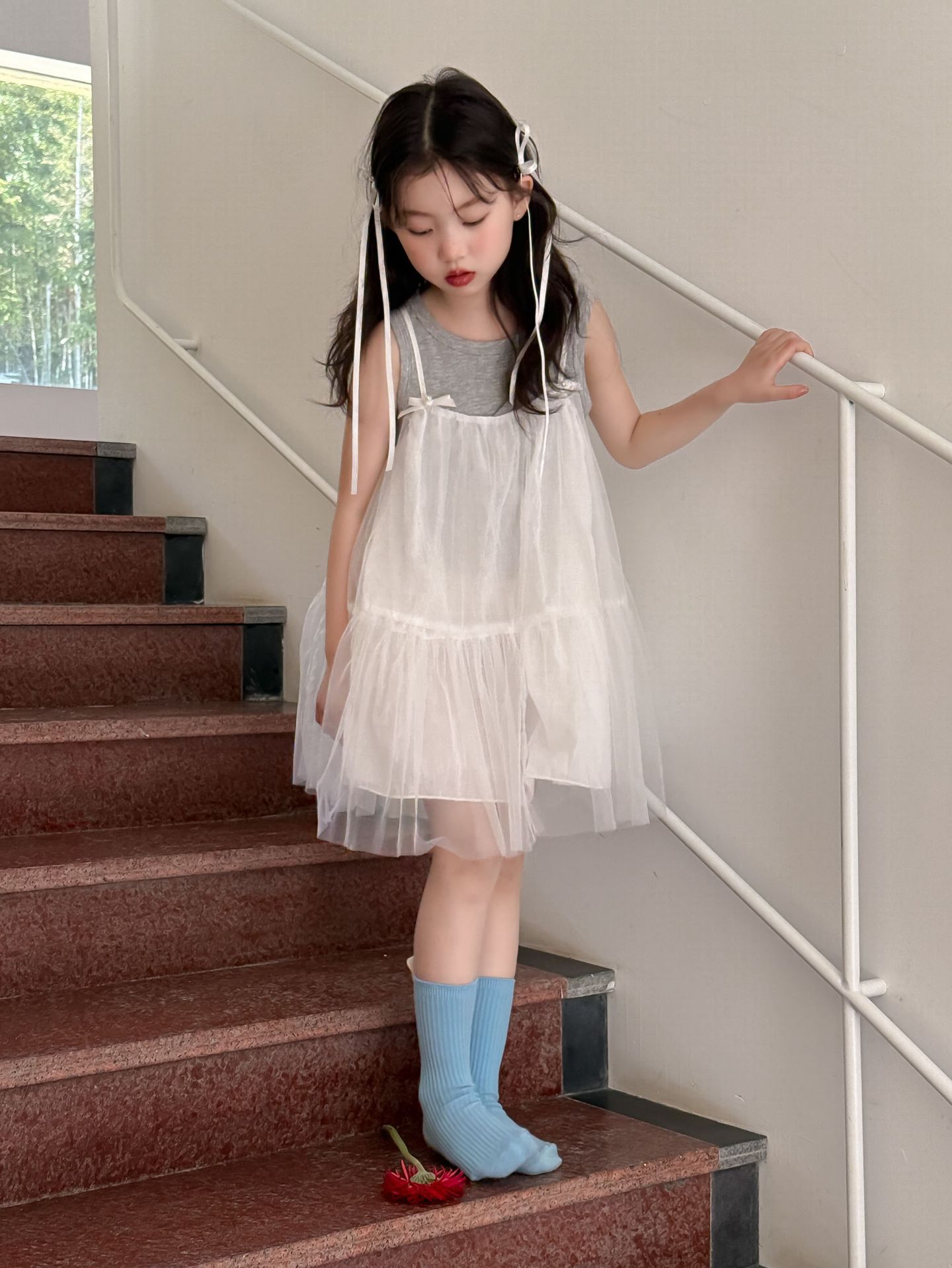 어린이 정장 2025 여름 소녀 민소매 조끼 활 서스펜더 흰색 거즈 스커트 투피스 세트 소녀 공주 스커트스토어 가기