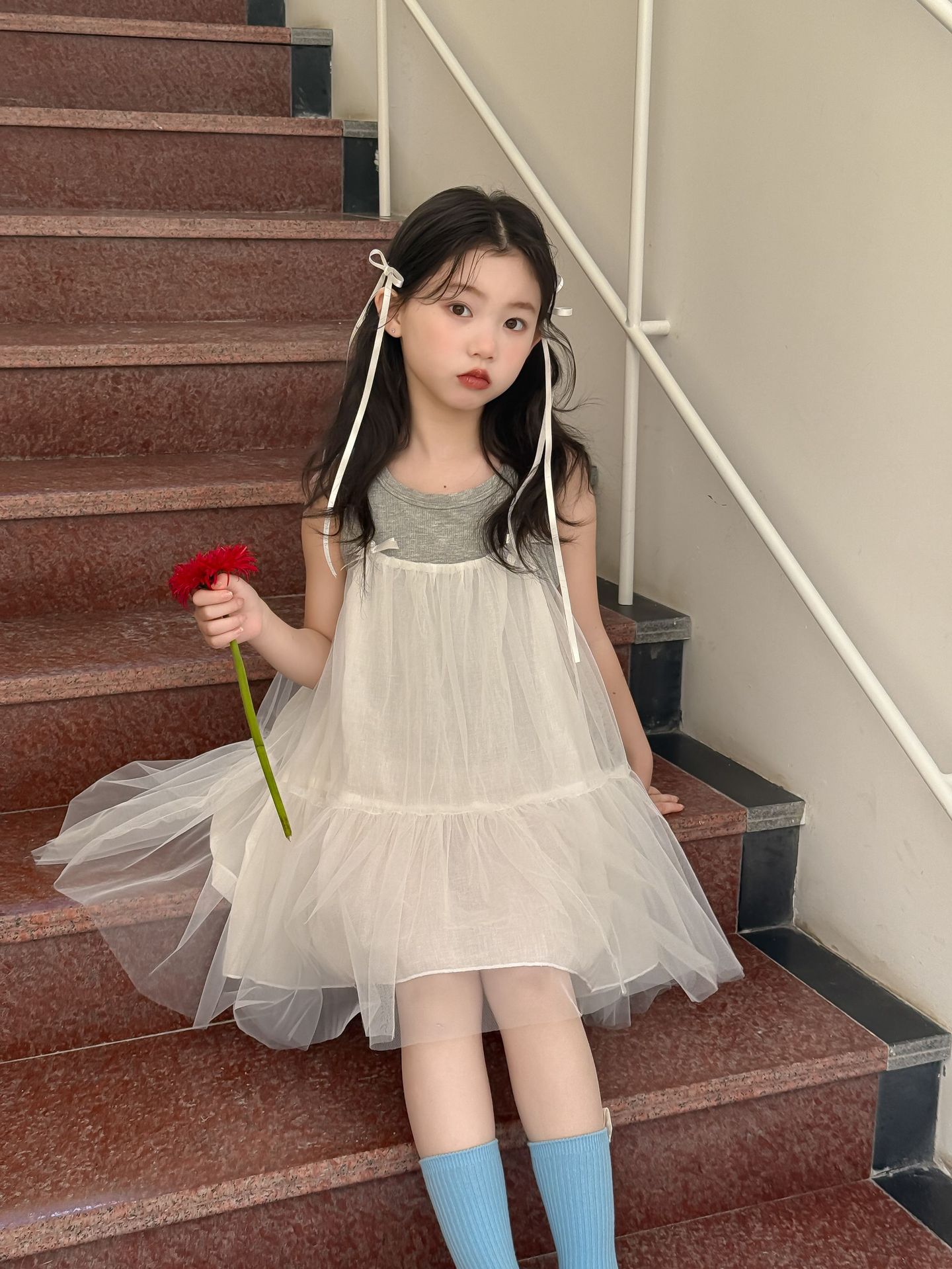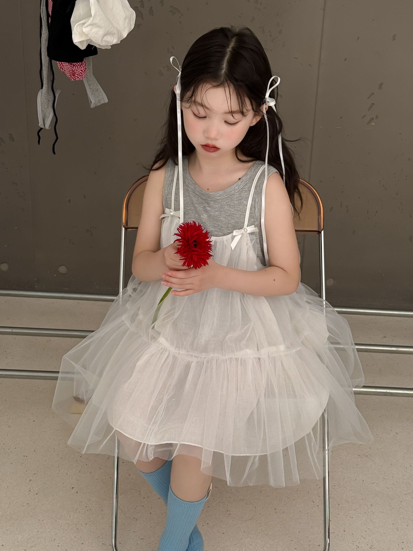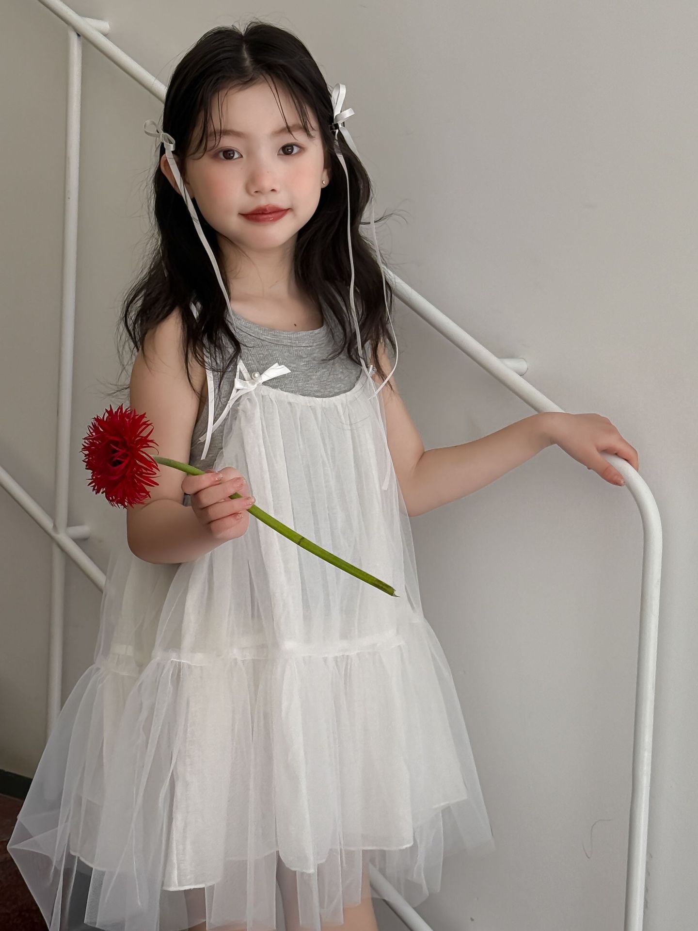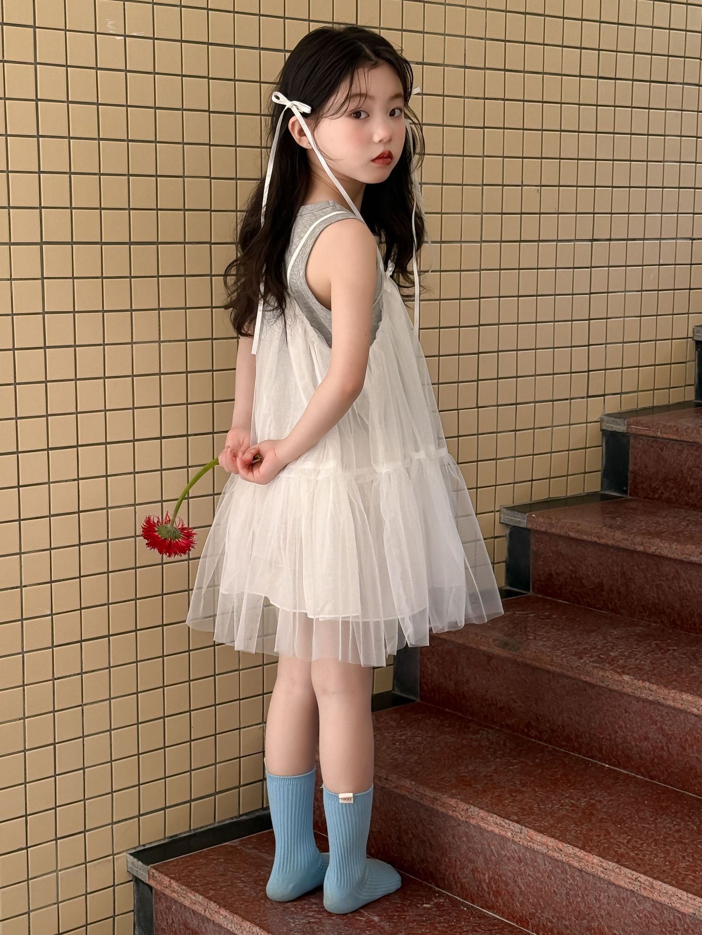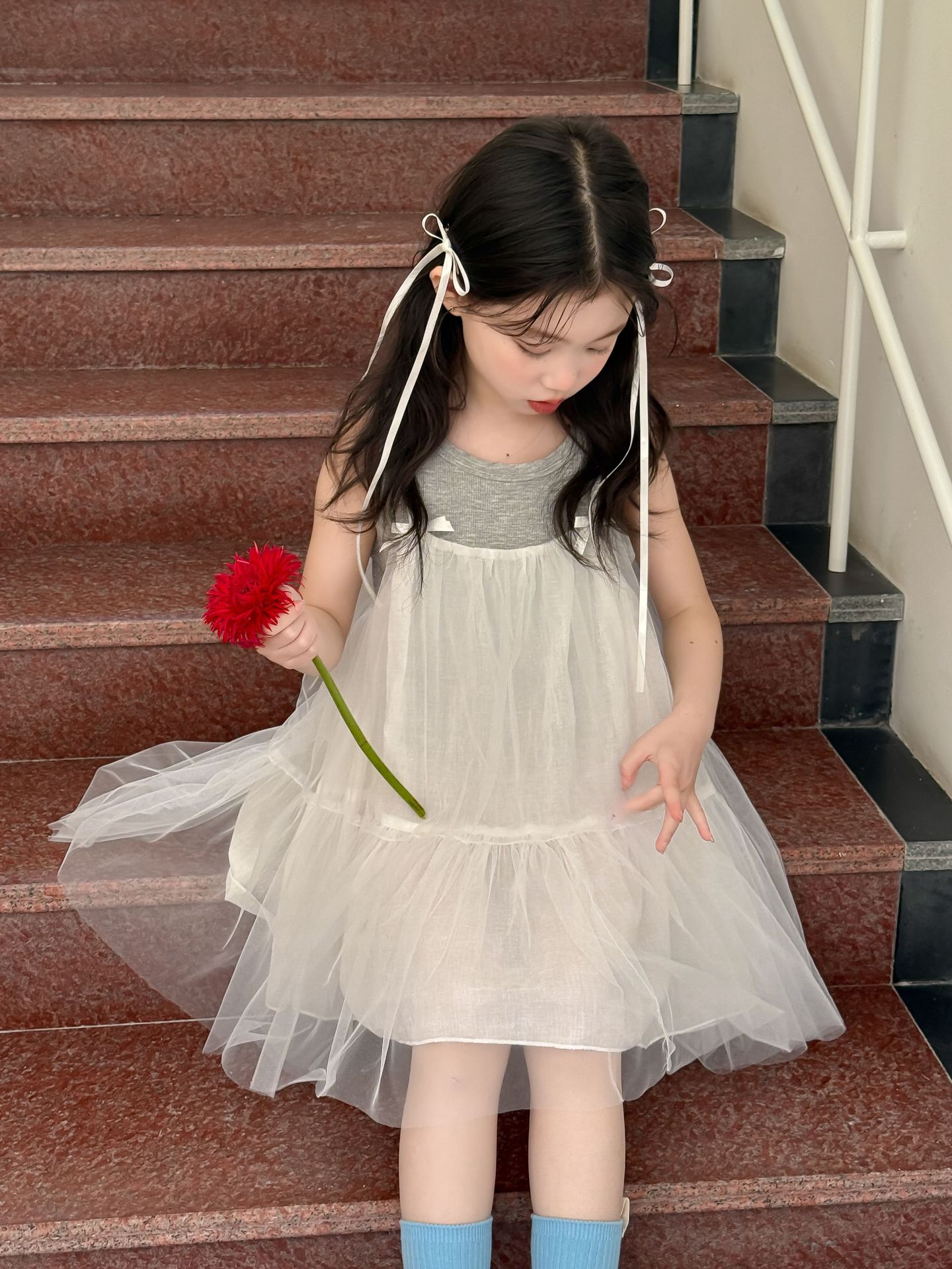 어린이 정장 2025 여름 소녀 민소매 조끼 활 서스펜더 흰색 거즈 스커트 투피스 세트 소녀 공주 스커트스토어 가기