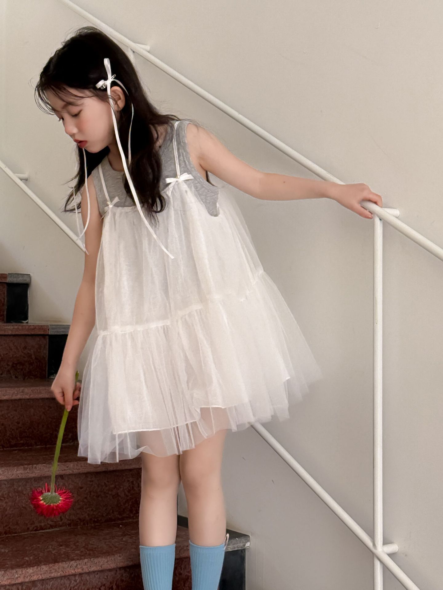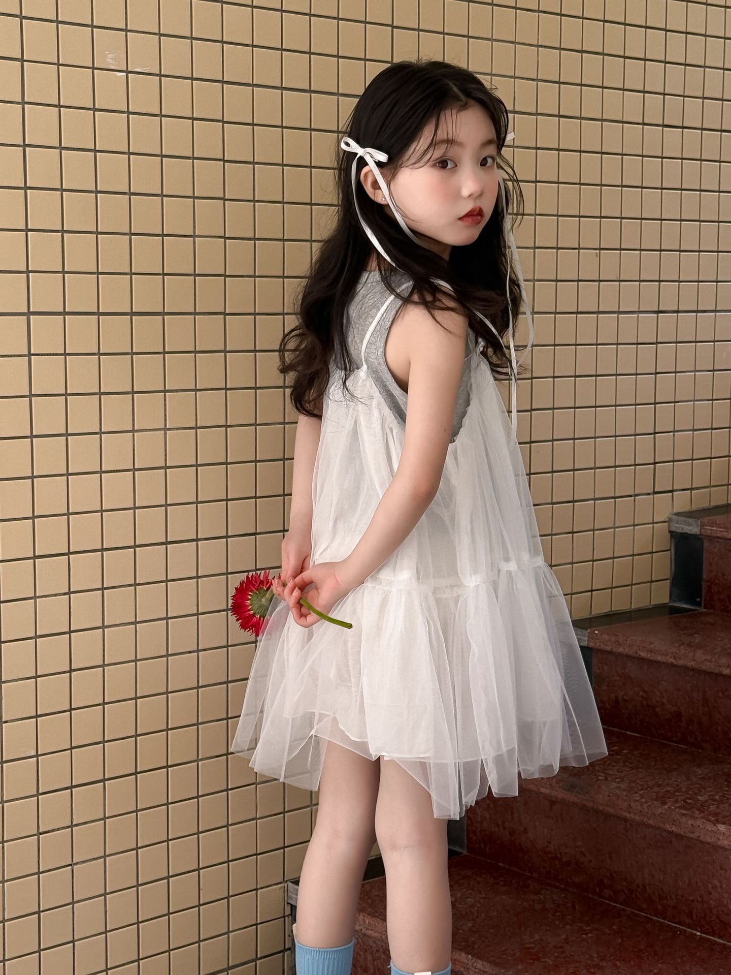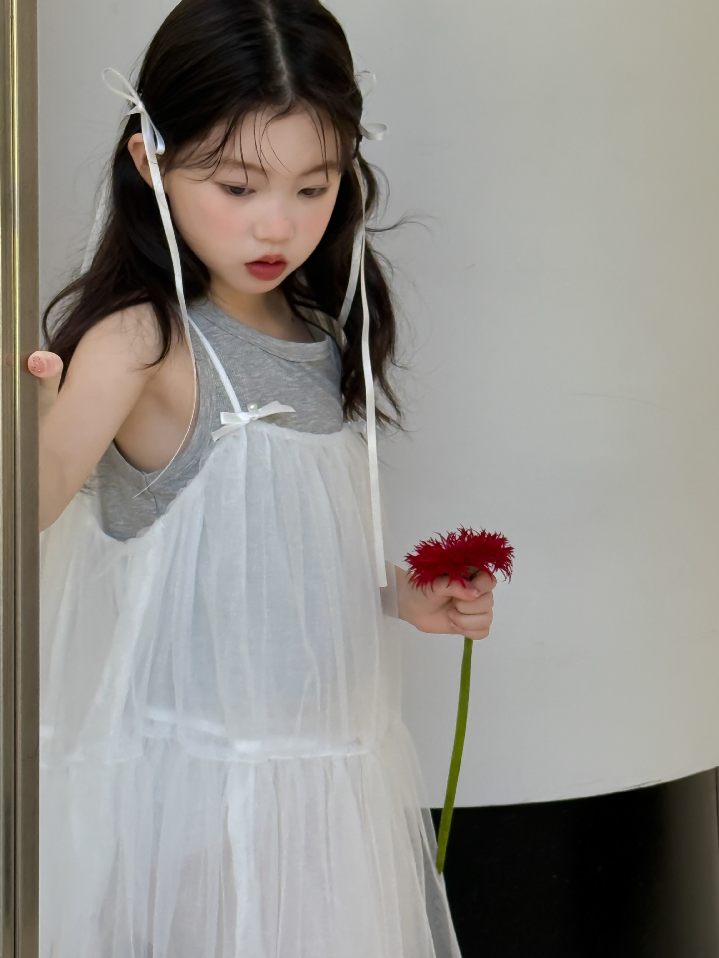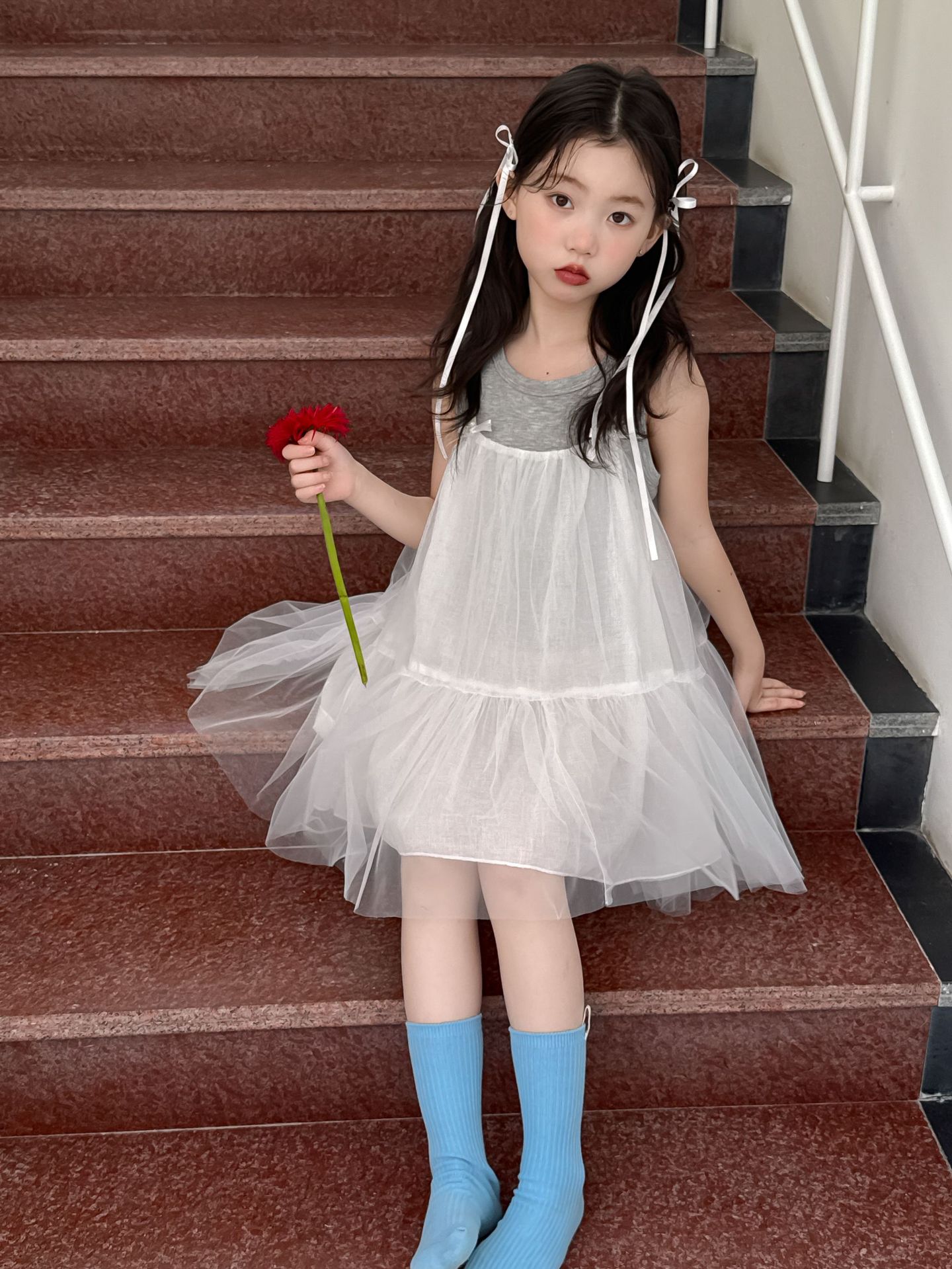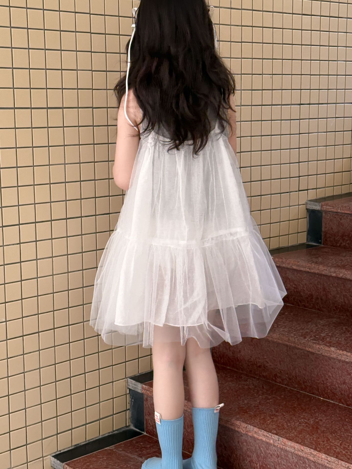 어린이 정장 2025 여름 소녀 민소매 조끼 활 서스펜더 흰색 거즈 스커트 투피스 세트 소녀 공주 스커트스토어 가기