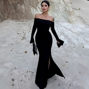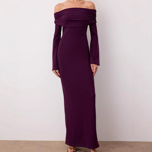 欧美跨境亚马逊新款长裙女装性感纯色长袖一字肩褶皱针织连衣裙女
