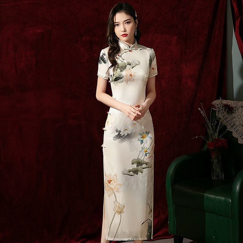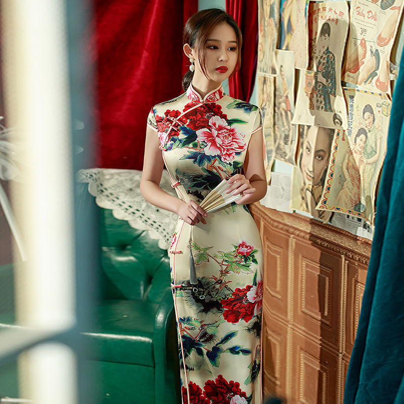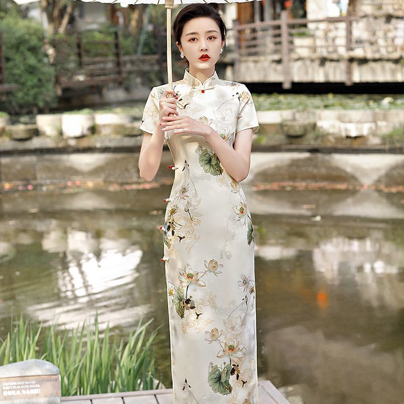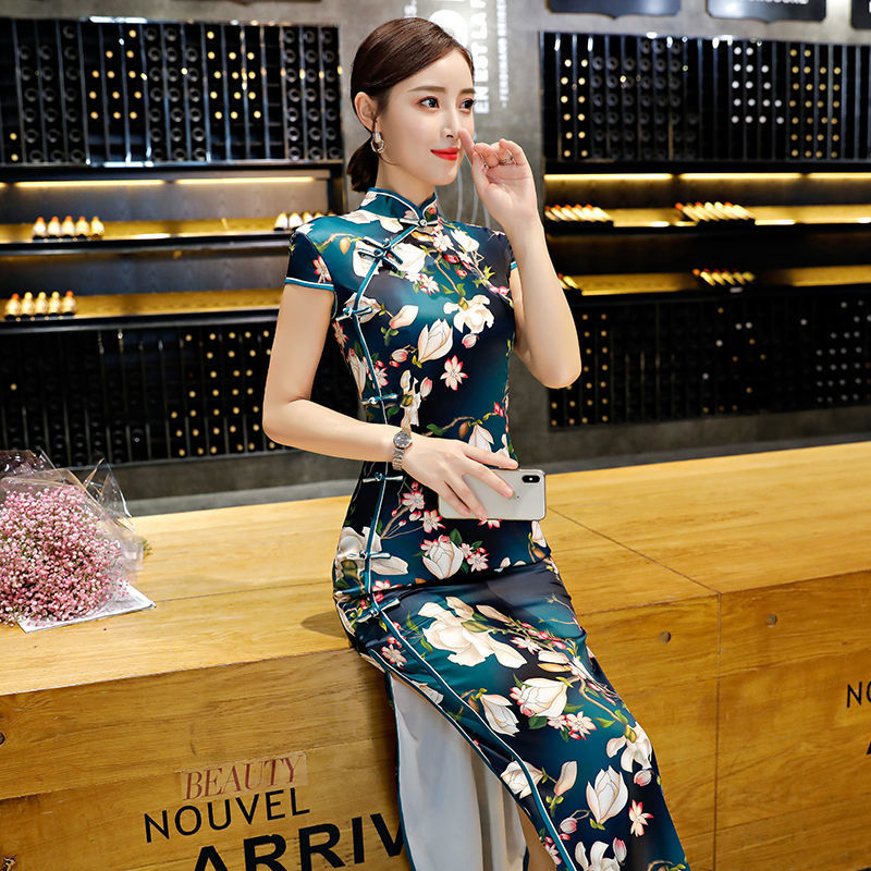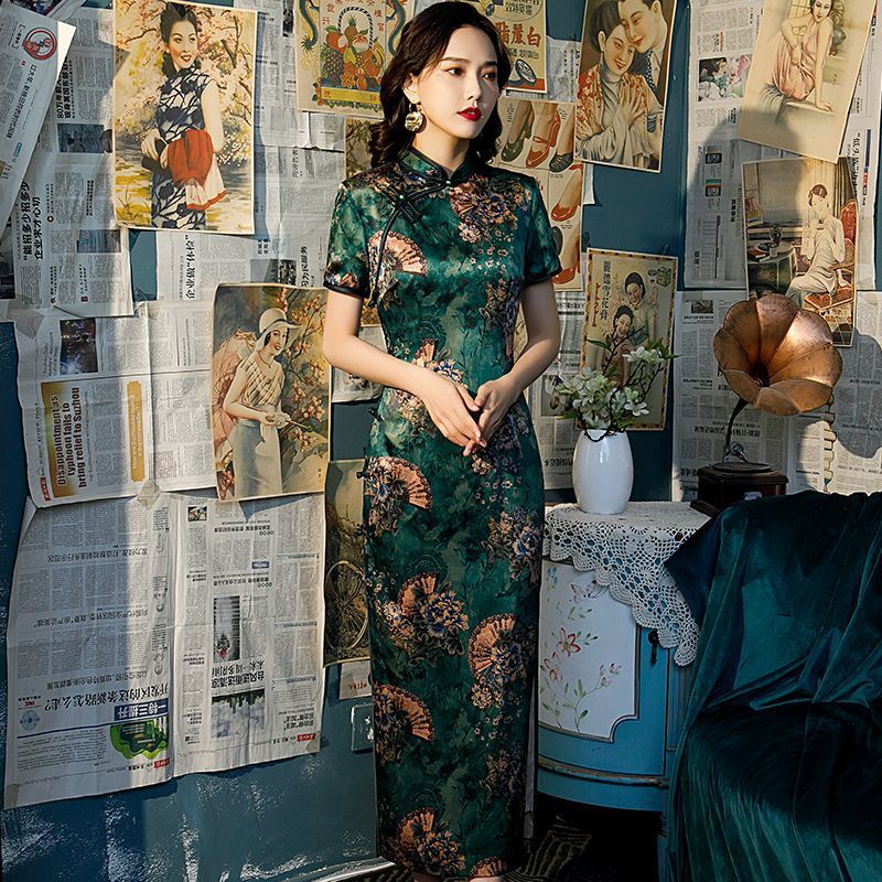치파오 2022 가을 여름 개선 버전 데일리 실크 복고풍 군사 지배인의 아내 긴 여성 드레스 플러스 사이즈 스타일 도매스토어 가기