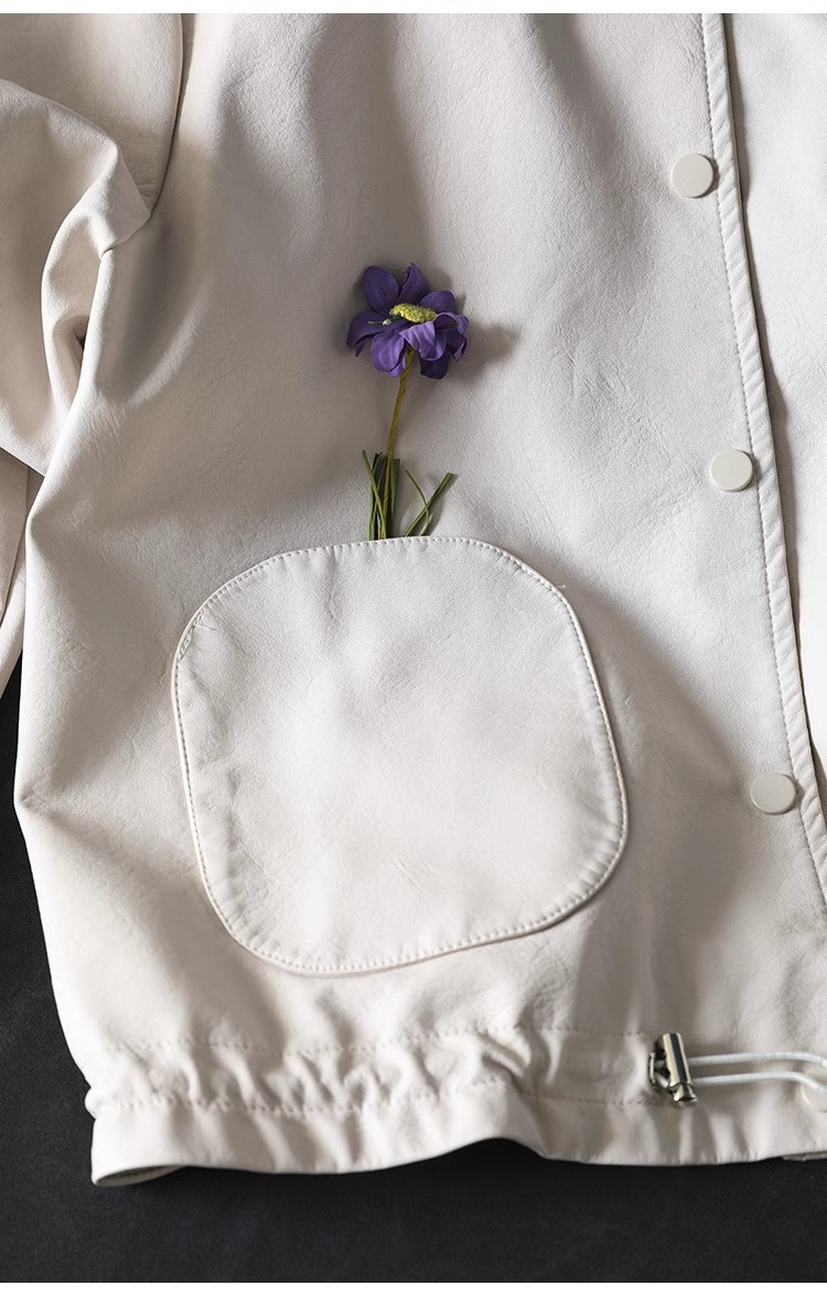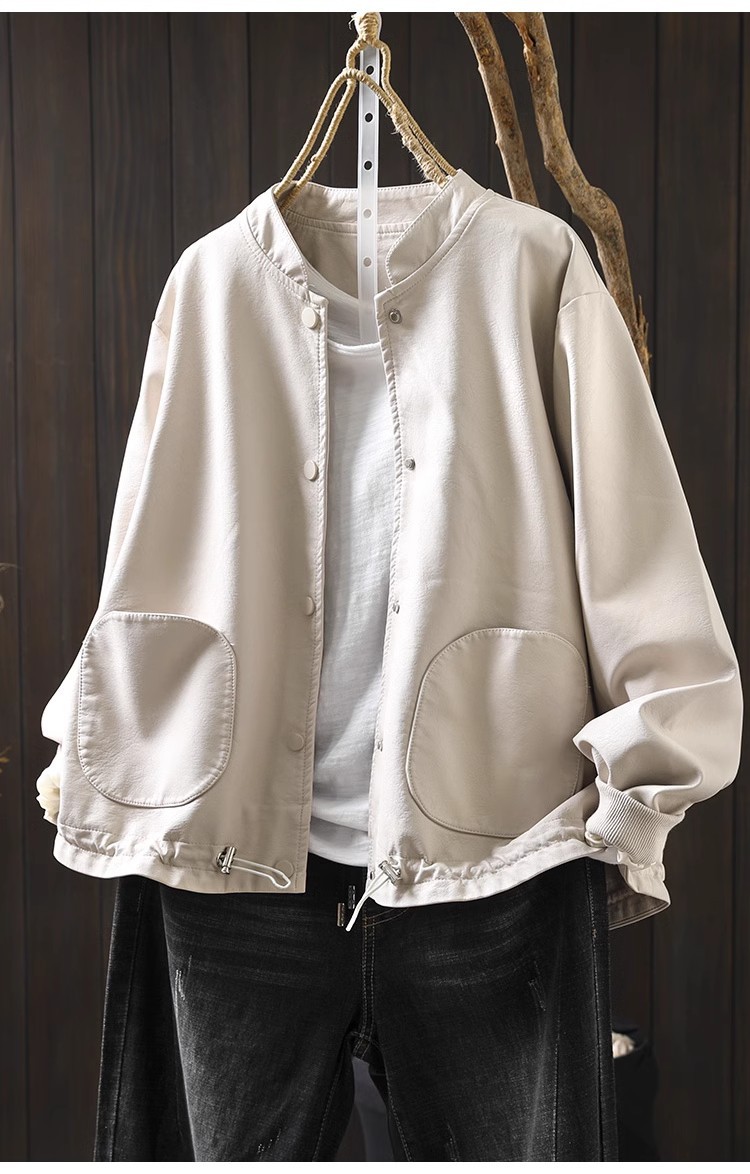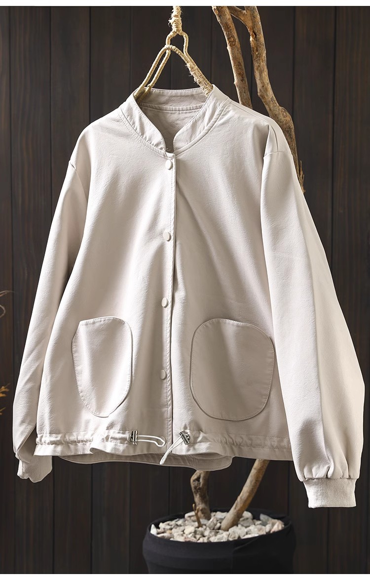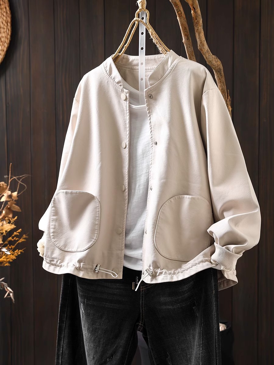 하단 드로스트링 부드러운 가죽 PU 가죽 자켓 여성 스탠드 칼라 루즈하고 멋진 봄, 가을 캐주얼 다재다능하고 멋진 자켓 가디건