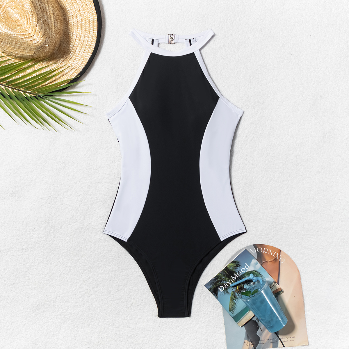 해외 창고 여성 패션 흑백 컬러 둥근 목 어깨 벨리 슬림 비키니 원피스 수영복