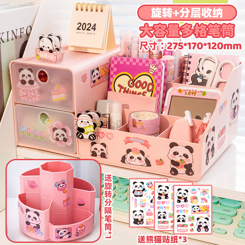 • [회전 + 레이어드 수납] 9단 핑크 펜홀더 + 회전 펜홀더 + 팬더 스티커 3개