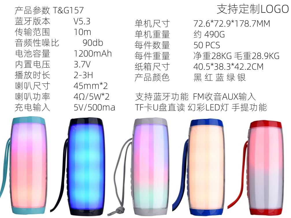 국경 간 7 색 다채로운 빛 TG157 무선 블루투스 스피커 야외 홈 카드 오디오 이중 진동 다이어프램 서브 우퍼