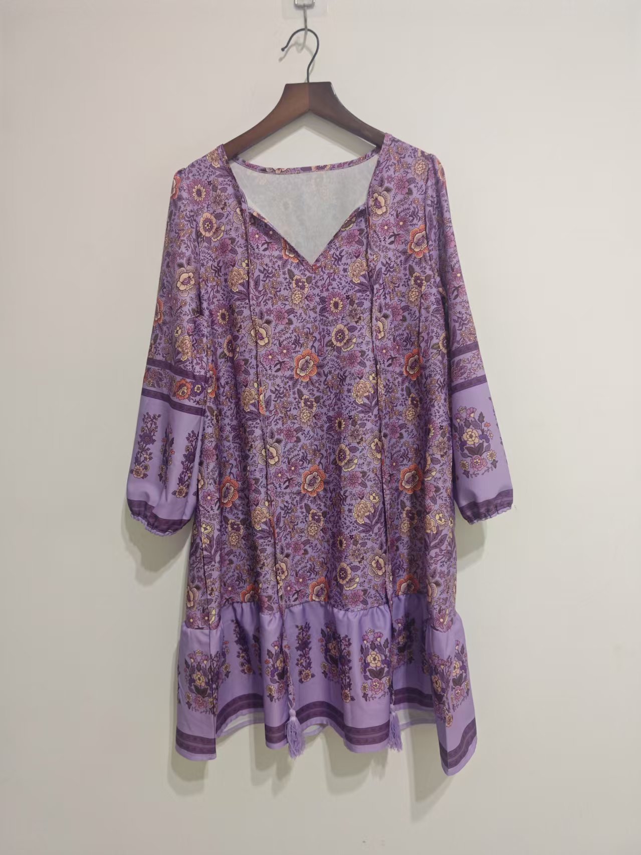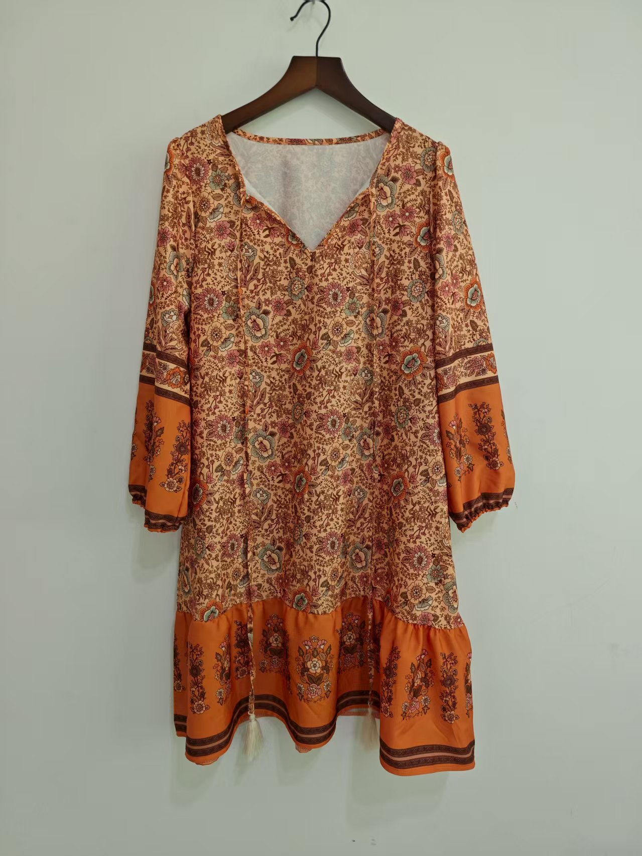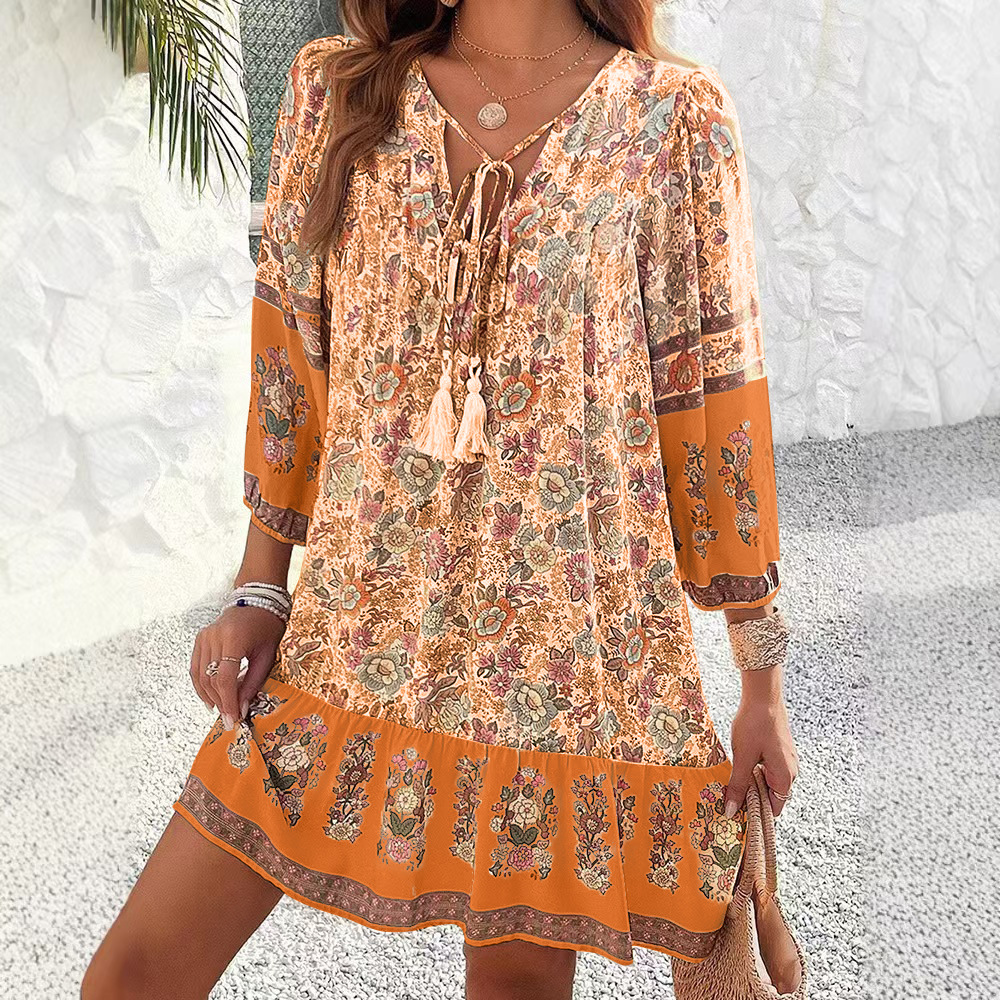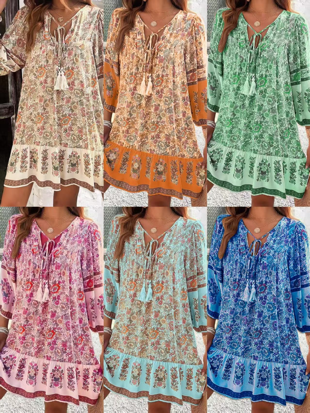 재고 있음 2025 유럽과 미국의 국경 간 프린트 셔츠 대외 무역 봄 여름 캐주얼 보헤미안 휴가 v 넥 드레스 여성용스토어 가기