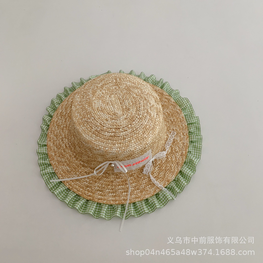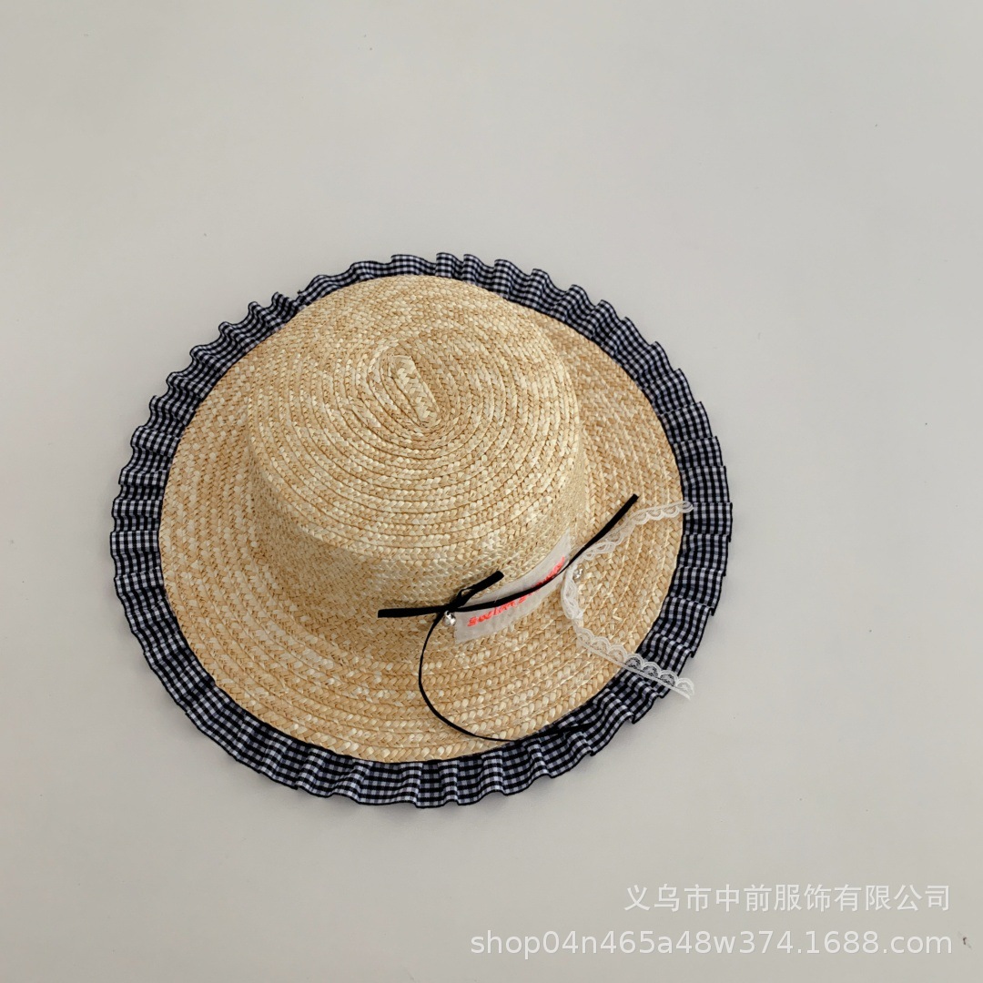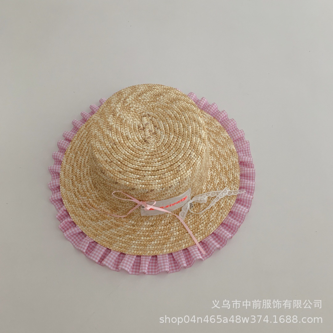 어린이 밀짚 모자 달콤한 활 격자 무늬 레이스 태양 보호 모자 여름 소녀 아기 휴가 해변 모자 유행