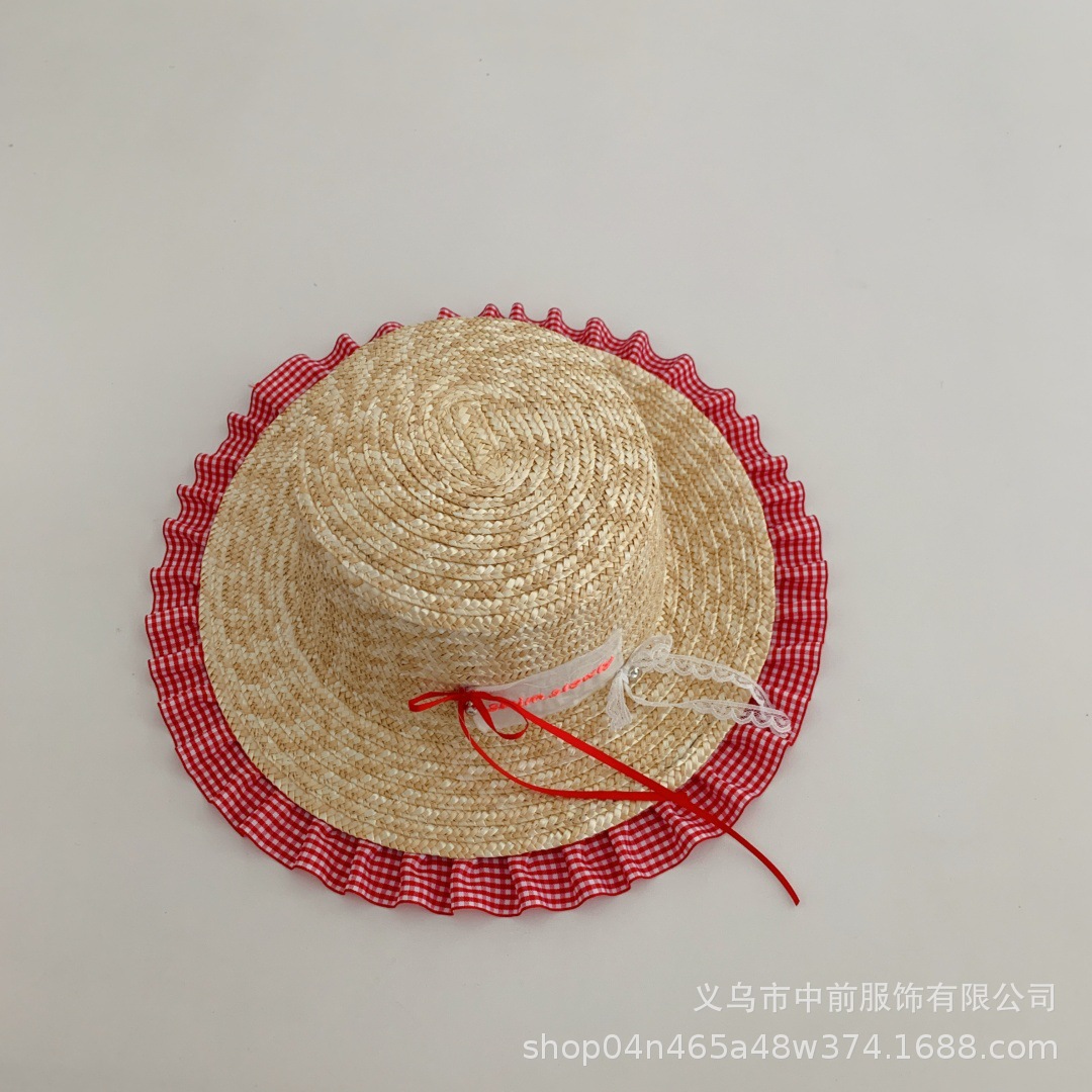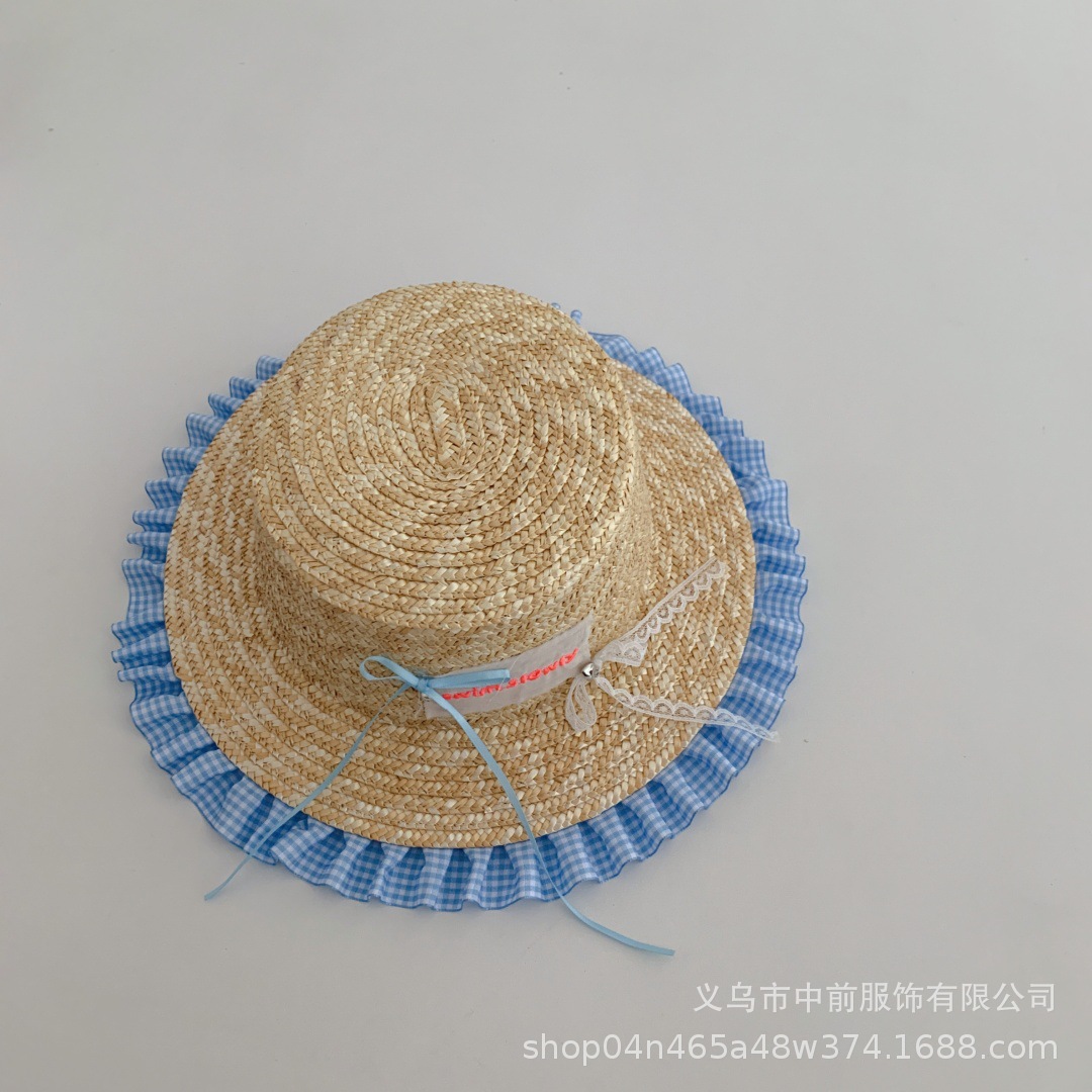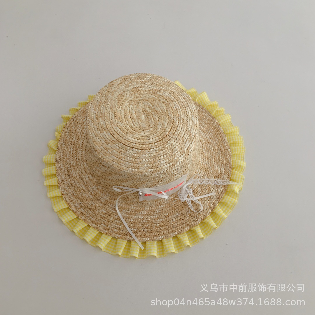 어린이 밀짚 모자 달콤한 활 격자 무늬 레이스 태양 보호 모자 여름 소녀 아기 휴가 해변 모자 유행