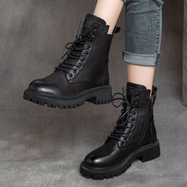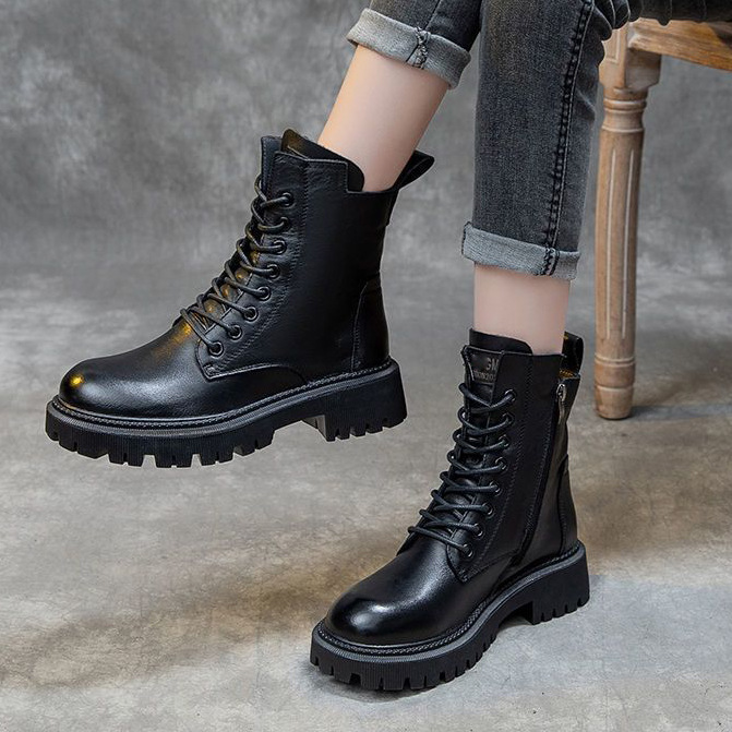 단색 레이스업 여성 가죽 부츠 2026 봄 신상 두꺼운 밑창 영국풍 바이커 부츠 심플한 일상용 마틴 부츠스토어 가기