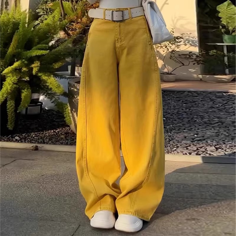 옐로우 핫템 데님 와이드 팬츠 여성용 가을 2025 신상 루즈핏 캐주얼 릴렉스 데님 팬츠