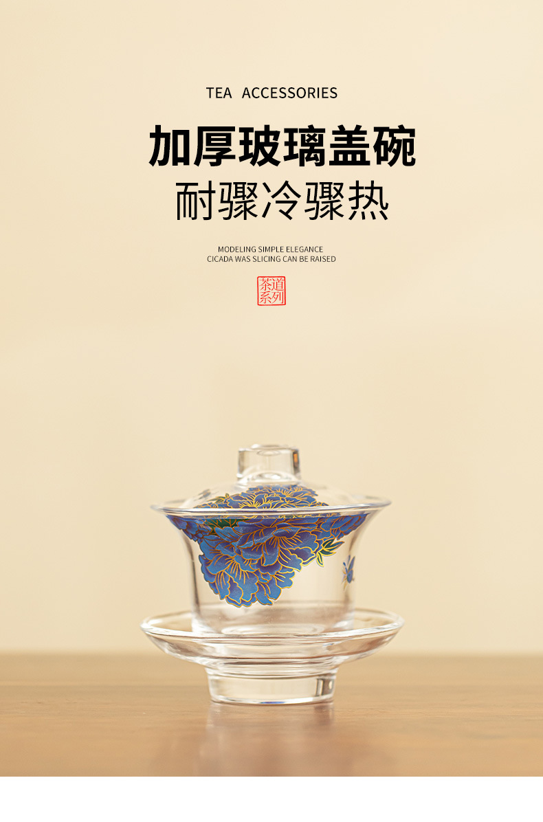두꺼운 유리 크리스탈 질감의 삼중 뚜껑 그릇, 녹차 찻잔, 여름 찻잔, 쿵푸 차 세트