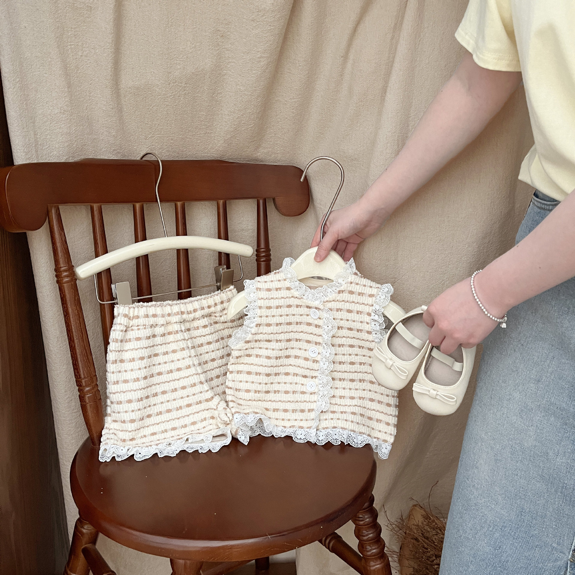 여자 여름 작은 향기 슈트 2025 한국 스타일 새 아기 스타일 줄무늬 레이스 조끼 + 반바지스토어 가기